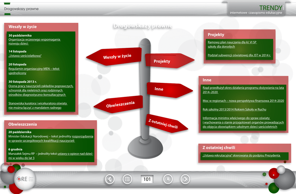 4/2013 Drogowskazy prawne Weszły w życie Drogowskazy prawne Projekty 30 października Organizacja wczesnego wspomagania rozwoju dzieci 14 listopada „Ustawa sześciolatkowa” Ramowy plan nauczania dla kl. VI SP szkoły dla dorosłych e Weszły w życi Podział subwencji oświatowej dla JST w 2014 r. Projekty 20 listopada Regulamin organizacyjny MEN – tekst ujednolicony Inne 30 listopada 2013 r. Ocena pracy nauczycieli zakładów poprawczych, schronisk dla nieletnich oraz rodzinnych ośrodków diagnostyczno-konsultacyjnych Stanowiska kuratora i wicekuratora oświaty nie można łączyć z mandatem radnego Obwieszczenia Rząd przedłużył okres działania programu dożywiania na lata 2014–2020 Inne Moc w regionach – nowa perspektywa finansowa 2014-2020 ia czen Obwiesz Rok szkolny 2013/2014 Rokiem Szkoły w Ruchu Z ost atnie jc hwili Informacja ministra właściwego do spraw oświaty i wychowania o stanie przygotowań organów prowadzących do objęcia obowiązkiem szkolnym dzieci sześcioletnich 20 października Minister Edukacji Narodowej – tekst jednolity rozporządzenia w sprawie szczegółowych kwalifikacji nauczycieli Z ostatniej chwili 6 grudnia Marszałek Sejmu RP – jednolity tekst ustawy o opiece nad dziećmi w wieku do lat 3 „Ustawa rekrutacyjna” skierowana do podpisu Prezydenta 101