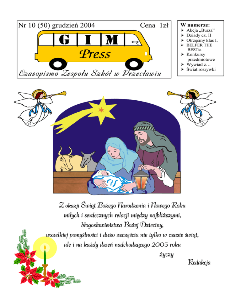Nr 10 (50) grudzień 2004 a Cena 1zł W numerze: Akcja „Burza” Dziady cz. II Otrzęsiny klas I. BELFER THE BESTia Czasopismo Zespołu Szkół w Prz e cławiu Konkursy przedmiotowe Wywiad z… Świat rozrywki Z okazji Świąt Bożego Bożego Narodzenia i Nowego Roku miłych i serdecznych relacji między najbliższymi, błogosławieństwa Bożej Dzieciny, wszelkiej pomyślności i dużo szczęścia nie tylko w czasie świąt, ale i na każdy dzień nadchodzącego 2005 roku życzy Redakcja Czasopismo Zespołu Szkół w Przecławiu Str. 2 Sesja popularno- naukowa na temat AKCJA „BURZA” NA PODKARPACIU W Zespole Szkół w Przecławiu dnia 29 października 2004 roku zorganizowano spotkanie poświęcone wydarzeniom związanym z działalnością Armii Krajowej w naszym regionie. Inicjatorem spotkania była pani Zofia Markulis – prezes Towarzystwa Przyjaciół Przecławia. W realizacji projektu pomogło równieŜ Towarzystwo Miłośników Ziemi Mieleckiej im. prof. Wł. Szafera oraz Instytut Pamięci Narodowej Oddział w Rzeszowie. Dzięki uprzejmości pani dyrektor Barbary Dybskiej i pani wicedyrektor Joanny Remiszewskiej oraz pracowników i uczniów szkoły sesja mogła odbyć się u nas. Impulsem do podjęcia tego tematu była sześćdziesiąta rocznica Powstania Warszawskiego, które było wpisane w plan „Burza”. Zakładał on podjęcie walki z hitlerowskim okupantem w momencie, gdy na wschodzie Armia Czerwona wyzwalała juŜ tereny II Rzeczypospolitej. śołnierze Armii Krajowej podejmowali równieŜ działania na naszym terenie. Celem spotkania było podsumowanie ich działalności, jak równieŜ osobiste wspomnienia zaproszonych gości – świadków tamtych wydarzeń. Imprezie towarzyszyła wystawa pamiątek i dokumentów pochodzących z II wojny światowej, którą mogliśmy zobaczyć dzięki ofiarności mieszkańców gminy. Na pochwałę zasługują uczniowie, którzy zadbali o oprawę artystyczną spotkania. Pracowali pod kierunkiem pani ElŜbiety Bały, pana Stanisława Wilczyńskiego i pana Dariusza Skrzypka. Chór szkolny zaprezentował kilka wzruszających pieśni z okresu II wojny światowej. Na instrumentach grali: Piotr Cisło - werbel, Mateusz Jurasz - saksofon, Marcin Bukała - akordeon, Arek Kopera saksofon. Uczniowie naszej szkoły zaprezentowali piękne wiersze Krzysztofa Kamila Baczyńskiego, Wisławy Szymborskiej i Władysława Bronieckiego, recytowały je następujące uczennice: Agnieszka Kurgan, Agnieszka Wójciak, Justyna Kozioł, Paulina Podgórska i Paulina Bogdan. Przy organizacji tego przedsięwzięcia pomagała równieŜ MłodzieŜowa Rada Gminy. Natomiast oprawa plastyczna to dzieło przede wszystkim pana Wojciecha Kaszuba. Na podstawie informacji p. S. Wilczyńskiego Ilona Brągiel Dziady cz. II W dniu 29 listopada uczniowie klas pierwszych gimnazjum pod opieką p. mgr ElŜbiety Bały, p. mgr Marii Słodkowskiej, p. mgr Lucyny Augustyn i p. mgr Beaty Mazur udałli się do Mieleckiego Domu Kultury „Metalowiec”, aby obejrzeć dramat Adama Mickiewicza „Dziady cz. II” w wykonaniu artystów scen krakowskich. Akcja rozgrywała się w mrocznej scenerii kaplicy. Na ołtarzu rozłoŜone były naczynia z kaszą, grochem, soczewicą, owocami. Nastrój tajemniczości potęgowały palące się świece. Główną postacią był Guślarz (Andrzej Róg), który przywoływał duchy zmarłych. Na scenie pojawiły się duchy trzech kategorii. Miały one charakter symboliczny. Duchy: złego Pana (Przemysław Branny), dziewczyny (Małgorzata Then) i dzieci (Zina Zagner i Tadeusz Łomnicki) obrazowały prawdy moralne. Przesłania te powtarzał za widmami chór wieśniaków zebranych na obrzędzie. Aktorzy bardzo wiernie przekazali wartości wynikające z utworu Mickiewicza. Atmosferę tajemniczości tworzył wystrój sceny, stroje aktorów, muzyka (gra na wiolonczeli). Widzami dosłownie wstrząsnął wybuch petardy w scenie wywołania duchów. Dodatkową atrakcją było obsypanie publiczności ziarnem. Dzięki udziałowi w spektaklu mogliśmy przyjrzeć się pracy aktorów, zrozumieć, jak wiele trzeba starań, by skupić na sobie uwagę widza i sprawić, by nie tylko obejrzał, ale i przeŜył sztukę. UwaŜam, Ŝe ten występ zapamiętamy na długo. Anna Tylec GIMPRESS 10 (50) grudzień 2004 Czasopismo Zespołu Szkół w Przecławiu Str. 3 Otrzęsiny Otrz siny klas pierwszych 30 listopada na sali gimnastycznej odbyły się otrzęsiny uczniów klas pierwszych. Samorząd uczniowski wraz z panią mgr Ewą Arciszewską przygotował wiele konkurencji, by pierwszaki mogły pokazać, co potrafią i czy zasługują na miano gimnazjalistów ZS w Przecławiu. Na wstępie pani dyrektor mgr Barbara Dybska, wraz z panią Ewą Arciszewską, serdecznie powitały pierwszoklasistów i do zabawy. zachęciły Następnie uczniowie klasy 2e (Łucja Czachor, Mateusz Dec, Gosia Gil, Kasia Jakubowicz, Michał Kozioł), pod opieką pani mgr Iwony Bogdan, zaprezentowali krótkie przedstawienie pt. „U wróŜki”. W jury konkursu zasiedli wychowawcy klas z panią dyrektor na czele i przedstawicielką samorządu. Pierwszą konkurencją była prezentacja klasy. Występy pierwszaków były bardzo ciekawe i miały formę rymowanych wierszyków, piosenek ubarwionych popisami tanecznymi oraz krótkich scenek dramatycznych. Największy aplauz wśród widowni, i nie tylko, wywołała prezentacja klasy Ia, a zwłaszcza kankan w wykonaniu dziewcząt… i chłopców. W dalszych konkurencjach sprawdzona została wiedza uczniów na temat naszej szkoły, ich pomysłowość (pokaz mody szkolnej, slogan reklamowy dla swojej klasy), plastyczne umiejętności (rysowanie karykatury swojego wychowawcy), sprawność fizyczna (wciąganie wargami cukierka powieszonego na nitce, pięcioosobowa grupa staje na kartce formatu A3). Walka była wyrównana, ale I miejsce, z przewagą dwóch punktów, zdobyła klasa Ia! Drugie miejsce zajęła klasa Id, a trzecią Ie. Gorące brawa dla zwycięzców i pozostałych 