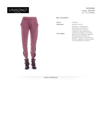 SPODNIE cena: 39 PLN art: 4-717 BORDO opis produktu Kolor: bordowy Materiał: bawełna 100 % Szczegóły: Spodnie o charakterze sportowym wykonane z przyjemnego w dotyku materiału. Na zakończeniu nogawek ściągacze. W pasie guma która powoduje idealne dopasowanie modelu do sylwetki. Model z kieszeniami. Wzdłuż nogawek szeroki pasek w kontrastowym odcieniu.