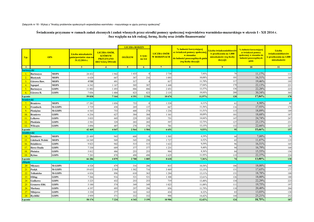 Załącznik nr 18 - Wykaz z "Analizy problemów społecznych województwa warmińsko - mazurskiego w ujęciu pomocy społecznej" Świadczenia przyznane w ramach zadań zleconych i zadań własnych przez ośrodki pomocy społecznej województwa warmińsko-mazurskiego w okresie I - XII 2014 r. /bez względu na ich rodzaj, formę, liczbę oraz źródło finansowania/ LICZBA RODZIN OPS Lp. 1 bartoszycki 1. Bartoszyce LICZBA OSÓB, Liczba mieszkańców KTÓRYM gmin/powiatów stan na PRZYZNANO 31.12.2014 r. DECYZJĄ ŚWIAD. 3 2 4 OGÓŁEM w tym: na wsi 5 6 LICZBA OSÓB W RODZINACH 7 % ludności korzystającej Liczba świadczeniobiorców ze świadczeń pomocy społecznej, w przeliczeniu na 1.000 w stosunku mieszkańców (wg liczby do ludności poszczególnych gmin decyzji) (wg liczby decyzji) 8 9 MOPS 24 432 1 942 1 433 0 2 730 7,95% 79 2. Bisztynek MOPS 6 620 667 387 216 1 093 10,08% 101 3. Górowo Iław. MOPS 4198 491 317 4 817 11,70% 117 4. Sępopol MOPS 6 542 1 167 505 387 1 448 17,84% 178 5. Bartoszyce GOPS 11 002 1 493 886 886 2 451 13,57% 136 6. Górowo Ił. GOPS 7 036 1 404 823 823 2 135 19,95% 200 59 830 7 164 4 351 2 316 10 674 11,97% 120 17 281 1 056 753 0 1 538 6,11% 61 3 719 430 269 137 667 11,56% 116 Łącznie braniewski 7. Braniewo 8. MOPS Frombork M-GOPS 9. Pieniężno M-GOPS 6 543 753 448 274 1 236 11,51% 115 10. Braniewo GOPS 6 216 627 384 384 1 161 10,09% 101 11. Lelkowo GOPS 3 035 445 229 228 751 14,66% 147 12. Płoskinia GOPS 2 581 329 203 203 597 12,75% 127 13. Wilczęta GOPS 3 094 407 278 278 701 13,15% 132 42 469 4 047 2 564 1 504 6 651 9,53% 95 Łącznie działdowski 14. Działdowo MOPS 21 489 943 608 0 1 505 4,39% 44 15. Lidzbark Welski MOPS 14 549 949 545 250 1 727 6,52% 65 16. Działdowo GOPS 9 823 942 515 515 1 622 9,59% 96 17. Iłowo Osada GOPS 7 330 689 377 377 1 231 9,40% 94 18. Płośnica GOPS 5 812 486 253 253 904 8,36% 84 19. Rybno GOPS 7 283 870 490 490 1 629 11,95% 119 66 286 4 879 2 788 1 885 8 618 7,36% 74 Łącznie elbląski 20 Młynary M-GOPS 4 528 479 316 206 815 10,58% 106 21 Pasłęk M-GOPS 19 653 2 584 1 502 716 3 469 13,15% 131 22 Tolkmicko M-GOPS 6 836 896 610 363 1 284 13,11% 131 23 Elbląg GOPS 7 266 916 521 521 1 308 12,61% 126 24 Godkowo GOPS 3 225 432 253 253 719 13,40% 134 25 Gronowo Elbl. GOPS 5 180 574 349 349 1 023 11,08% 111 26 Markusy GOPS 4 197 495 297 296 856 11,79% 118 27 Milejewo GOPS 3 330 277 163 163 434 8,32% 83 28 Rychliki GOPS 3 959 571 332 332 998 14,42% 144 58 174 7 224 4 343 3 199 10 906 12,42% 124 Łącznie % ludności korzystającej ze świadczeń pomocy społecznej, w stosunku do ludności poszczególnych gmin Liczba świadczeniobiorców w przeliczeniu na 1.000 mieszkańców 10 11 11,17% 16,51% 19,46% 22,13% 22,28% 30,34% 17,84% 8,90% 17,93% 18,89% 18,68% 24,74% 23,13% 22,66% 15,66% 7,00% 11,87% 16,51% 16,79% 15,55% 22,37% 13,00% 18,00% 17,65% 18,78% 18,00% 22,29% 19,75% 20,40% 13,03% 25,21% 18,75% 112 165 195 221 223 303 178 89 179 189 187 247 231 227 157 70 119 165 168 156 224 130 180 177 188 180 223 197 204 130 252 187 ełcki 29. Ełk MOPS 60 103 3 081 2 110 0 4 537 5,13% 51 30. Ełk GOPS 11 270 848 506 506 1 447 7,52% 75 31. Kalinowo GOPS 7 030 811 420 420 1 425 11,54% 115 32. Prostki GOPS 7 505 828 469 469 1 580 11,03% 110 33. Stare Juchy GOPS 3 975 449 258 254 809 11,30% 113 89 883 6 017 3 763 1 649 9 798 6,69% 67 Łącznie giżycki 34. Giżycko MOPS 29 932 1 682 1 244 0 2 567 5,62% 56 35. Ryn MOPS 5 853 664 483 185 1 214 11,34% 113 36. Giżycko GOPS 8 276 625 414 414 1 110 7,55% 76 37. Kruklanki GOPS 3 154 356 214 214 675 11,29% 113 38. Miłki GOPS 3 844 468 265 265 1 020 12,17% 122 39. Wydminy GOPS 6 503 682 682 682 2 171 10,49% 105 57 562 4 477 3 302 1 760 8 757 7,78% 78 Łącznie gołdapski 40. Gołdap 20 370 1 185 750 332 2 342 5,82% 58 41. Banie Mazurskie GOPS 3 921 439 238 238 751 11,20% 112 42. Dubeninki GOPS 3 062 217 134 134 409 7,09% 71 27 353 1 841 1 122 704 3 502 6,73% 67 33 344 1 717 1 148 0 2 564 5,15% 51 6 079 682 365 272 1 206 11,22% 112 Łącznie iławski 43. Iława 44. M-GOPS MOPS Kisielice M-GOPS 45. Lubawa MOPS 10 098 507 392 0 811 5,02% 50 46. Susz M-GOPS 13 038 1 804 1 041 721 3 103 13,84% 138 47. Zalewo MOPS 6 977 737 415 346 1 303 10,56% 106 48. Iława GOPS 12 884 1 255 667 664 2 234 9,74% 97 49. Lubawa GOPS 10 632 721 395 395 1 236 6,78% 68 93 052 7 423 4 423 2 398 12 457 7,98% 80 Łącznie 7,55% 12,84% 20,27% 21,05% 20,35% 10,90% 8,58% 20,74% 13,41% 21,40% 26,53% 33,38% 15,21% 11,50% 19,15% 13,36% 12,80% 7,69% 19,84% 8,03% 23,80% 18,68% 17,34% 11,63% 13,39% 75 128 203 211 204 109 86 207 134 214 265 334 152 115 192 134 128 77 198 80 238 187 173 116 134 kętrzyński 50. Kętrzyn MOPS 27 924 1 970 1 407 0 2 821 7,05% 71 51. Korsze MOPS 10 267 1 692 1 100 746 2 642 16,48% 165 52. Reszel MOPS 7 834 848 549 236 1 292 10,82% 108 53. Barciany GOPS 6 580 1 159 672 671 1 873 17,61% 176 54. Kętrzyn GOPS 8 466 1 461 827 814 2 826 17,26% 173 55. Srokowo GOPS 3 969 462 273 273 883 11,64% 116 65 040 7 592 4 828 2 740 12 337 11,67% 117 Łącznie lidzbarski 56. Lidzbark Warm. MOPS 16 332 1 107 818 0 1 647 6,78% 68 57. Orneta MOPS 12 397 1 088 776 228 1 881 8,78% 88 58. Kiwity GOPS 3 338 261 171 171 452 7,82% 78 59. Lidzbark Warm. GOPS 6 771 547 303 303 1 026 8,08% 81 60. Lubomino GOPS 3 668 424 248 247 685 11,56% 116 42 506 3 427 2 316 949 5 691 8,06% 81 Łącznie mrągowo 61. Mikołajki 8 348 668 420 236 1 191 8,00% 80 62. Mrągowo MOPS 22 135 1 445 994 0 2 222 6,53% 65 63. Mrągowo GOPS 7 979 963 589 588 1 608 12,07% 121 64. Piecki GOPS 7 755 1 163 611 611 1 685 15,00% 150 65. Sorkwity GOPS 4 684 732 412 412 1 267 15,63% 156 50 901 4 971 3 026 1 847 7 973 9,77% 98 Łącznie nidzicki 66. Nidzica M-GOPS MOPS 21 521 1 298 788 323 2 143 6,03% 60 67. Janowiec Kośc. GOPS 3 320 508 252 252 882 15,30% 153 68. Janowo GOPS 2 788 302 171 171 507 10,83% 108 69. Kozłowo GOPS 6 230 649 480 480 1 366 10,42% 104 33 859 2 757 1 691 1 226 4 898 8,14% 81 Łącznie nowomiejski 70. Nowe Miasto L. MOPS 11 180 981 704 0 1 60