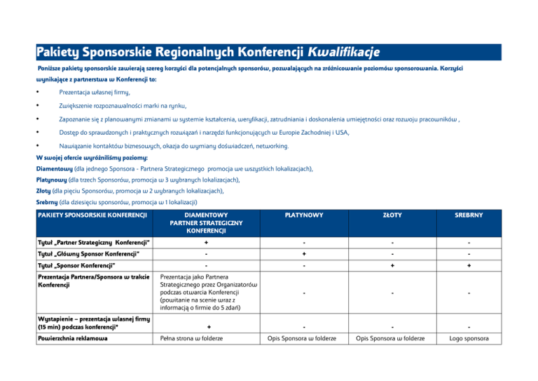 Pakiety Sponsorskie Regionalnych Konferencji Kwalifikacje Poniższe pakiety sponsorskie zawierają szereg korzyści dla potencjalnych sponsorów, pozwalających na zróżnicowanie poziomów sponsorowania. Korzyści wynikające z partnerstwa w Konferencji to; • Prezentacja własnej firmy, • Zwiększenie rozpoznawalności marki na rynku, • Zapoznanie się z planowanymi zmianami w systemie kształcenia, weryfikacji, zatrudniania i doskonalenia umiejętności oraz rozwoju pracowników , • Dostęp do sprawdzonych i praktycznych rozwiązań i narzędzi funkcjonujących w Europie Zachodniej i USA, • Nawiązanie kontaktów biznesowych, okazja do wymiany doświadczeń, networking. W swojej ofercie wyróżniliśmy poziomy; Diamentowy (dla jednego Sponsora - Partnera Strategicznego promocja we wszystkich lokalizacjach), Platynowy (dla trzech Sponsorów, promocja w 3 wybranych lokalizacjach), Złoty (dla pięciu Sponsorów, promocja w 2 wybranych lokalizacjach), Srebrny (dla dziesięciu sponsorów, promocja w 1 lokalizacji) PAKIETY SPONSORSKIE KONFERENCJI DIAMENTOWY PARTNER STRATEGICZNY KONFERENCJI PLATYNOWY ZŁOTY SREBRNY Tytuł „Partner Strategiczny Konferencji" + - - - Tytuł „Główny Sponsor Konferencji" - + - - Tytuł „Sponsor Konferencji” - - + + Prezentacja jako Partnera Strategicznego przez Organizatorów podczas otwarcia Konferencji (powitanie na scenie wraz z informacją o firmie do 5 zdań) - - - + - - - Prezentacja Partnera/Sponsora w trakcie Konferencji Wystapienie – prezentacja wlasnej firmy (15 min) podczas konferencji* Powierzchnia reklamowa Pełna strona w folderze Opis Sponsora w folderze Opis Sponsora w folderze Logo sponsora w materiałach promocyjnych (folderze konferencyjnym oraz na stronie internetowej) oraz możliwość dołączenia broszury promocyjnej do pakietu materiałów konferencyjnych** konferencyjnym do dyspozycji Partnera Strategicznego oraz dołączenie broszury promocyjnej Partnera do pakietu materiałów konferencyjnych konferencyjnym wg hierarchii (do 1000 znaków) Dołączenie broszury promocyjnej Sponsora do pakietu materiałów konferencyjnych konferencyjnym (do 500 znaków) Dołączenie broszury promocyjnej Sponsora do pakietu materiałów konferencyjnych Ekspozycja nazwy i logotypu Partnera/Sponsora w miejscu Konferencji Własny stand/stoisko wystawiennicze zaraz obok stanowiska rejestracyjnego Konferencji w foyer (stanowisko nr 1) oraz roll up w sali konferencyjnej na scianie glównej/przedniej Własny stand/stoisko wystawiennicze w foyer (stanowisko nr 2) oraz roll up w sali konferencyjnej (na ścianie bocznej) Własny stand/stoisko wystawiennicze lub roll up w foyer (stanowisko nr 3) Roll up w foyer Wyświetlanie logotypu Partnera /Sponsora podczas konferencji (wraz z logotypami organizatora/patronów Podczas konferencji Na ekranach w foyer W materiale filmowym pokonferencyjnym Podczas konferencji Na ekranach w foyer W materiale filmowym pokonferencyjnym Podczas Konferencji Na ekranach w foyer Podczas Konferencji Uczestnictwo osób reprezentujących Partnera /Sponsora w Konferencji 5 przedstawicieli Partnera Strategicznego (drukowane, imienne zaproszenia) 3 przedstawicieli Sponsora 2 przedstawicieli Sponsora 1 przedstawiciel Sponsora + + - - Promocja Partnera/Sponsora poprzez dystrybucję materiałów reklamowych dołączonych do szkoleń prowadzonych przez Organizatora od daty zakończenia Konferencji przez okres; 6 miesięcy 3 miesięcy 2 miesięcy 1 miesiąca Rabat na dowolny program rozwojowy z certyfikatem ACI (American Certification Instuitute) lub IPSCMI (International Purchasing and Supply Chain Management Institute) 50% dla 1 wskazanej osoby 20% dla 1 wskazanej osoby 10% dla 1 wskazanej osoby - 15 000 + PLN + VAT 5 000 + PLN + VAT 3 000 + PLN + VAT 1 500 + PLN + VAT Dostęp do bazy danych uczestników CENA; * Treść wystapienia powinna zawierać odniesienie do kontekstu konferencji, ** Materiały promocyjne dostarczone przez Partnera/Sponsora zgodnie z formatem, jakością i terminem wskazanym przez Organizatora. Dodatkowych informacji udziela; Klaudia Kossowska, [email protected] tel. (12) 294 04 62