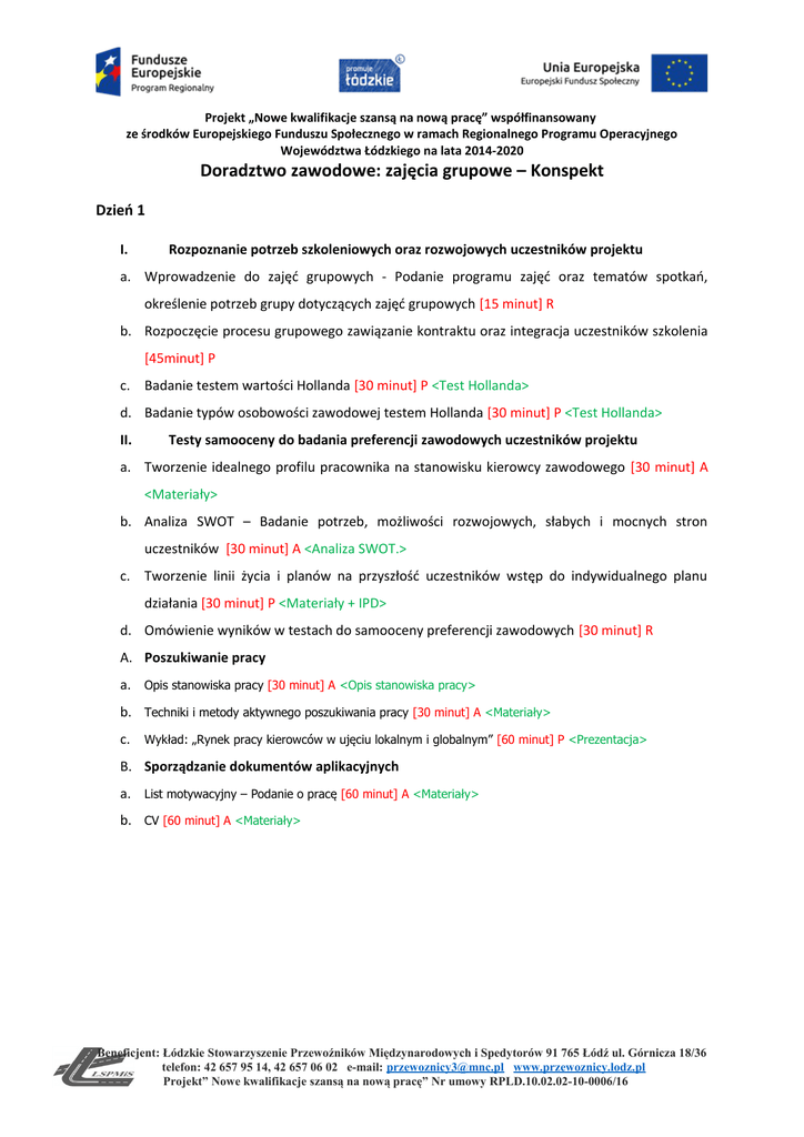 Projekt „Nowe kwalifikacje szansą na nową pracę” współfinansowany ze środków Europejskiego Funduszu Społecznego w ramach Regionalnego Programu Operacyjnego Województwa Łódzkiego na lata 2014-2020 Doradztwo zawodowe: zajęcia grupowe – Konspekt Dzień 1 I. Rozpoznanie potrzeb szkoleniowych oraz rozwojowych uczestników projektu a. Wprowadzenie do zajęć grupowych - Podanie programu zajęć oraz tematów spotkań, określenie potrzeb grupy dotyczących zajęć grupowych [15 minut] R b. Rozpoczęcie procesu grupowego zawiązanie kontraktu oraz integracja uczestników szkolenia [45minut] P c. Badanie testem wartości Hollanda [30 minut] P <Test Hollanda> d. Badanie typów osobowości zawodowej testem Hollanda [30 minut] P <Test Hollanda> II. Testy samooceny do badania preferencji zawodowych uczestników projektu a. Tworzenie idealnego profilu pracownika na stanowisku kierowcy zawodowego [30 minut] A <Materiały> b. Analiza SWOT – Badanie potrzeb, możliwości rozwojowych, słabych i mocnych stron uczestników [30 minut] A <Analiza SWOT.> c. Tworzenie linii życia i planów na przyszłość uczestników wstęp do indywidualnego planu działania [30 minut] P <Materiały + IPD> d. Omówienie wyników w testach do samooceny preferencji zawodowych [30 minut] R A. Poszukiwanie pracy a. Opis stanowiska pracy [30 minut] A <Opis stanowiska pracy> b. Techniki i metody aktywnego poszukiwania pracy [30 minut] A <Materiały> c. Wykład: „Rynek pracy kierowców w ujęciu lokalnym i globalnym” [60 minut] P <Prezentacja> B. Sporządzanie dokumentów aplikacyjnych a. List motywacyjny – Podanie o pracę [60 minut] A <Materiały> b. CV [60 minut] A <Materiały> Beneficjent: Łódzkie Stowarzyszenie Przewoźników Międzynarodowych i Spedytorów 91 765 Łódź ul. Górnicza 18/36 telefon: 42 657 95 14, 42 657 06 02 e-mail: [email protected] www.przewoznicy.lodz.pl Projekt” Nowe kwalifikacje szansą na nową pracę” Nr umowy RPLD.10.02.02-10-0006/16 Projekt „Nowe kwalifikacje szansą na nową pracę” współfinansowany ze środków Europejskiego Funduszu Społecznego w ramach Regionalnego Programu Operacyjnego Województwa Łódzkiego na lata 2014-2020 Dzień 2 C. Autoprezentacja na rynku pracy - prezentacja własnej osoby w rozmowach o pracę a. Przygotowanie uczestników projektu do autoprezentacji [30 minut] P b. Autoprezentacja 3 minuty każdego z uczestników projektu [1 minut] R c. Dyskusja – techniki autoprezentacji w rozmowie o pracę [30 minut] R <Tabelka słabe i mocne strony> D. Rozmowa kwalifikacyjna a. Etapy i przebieg rozmowy kwalifikacyjnej [30 minut] A <Materiały> b. Rozmowa kwalifikacyjna - Ćwiczenia w parach [30 minut] P <Role> c. Omówienie ćwiczenia oraz dyskusja na temat trudności [30 minut] R d. Analiza stylu komunikacji [15 minut] P <Test> e. Badanie umiejętności słuchania i mówienia [15 minut] P <Test> E. Reakcje w trudnych sytuacjach 3 h a. Konflikt Rozmowa [30minut] P <Materiały> b. Strategie rozwiązywania konfliktów [30 minut] P <Test> c. Techniki rozmowy asertywnej: Parafraza, klaryfikacja, itp. [30 minut] A <Materiały> d. Style radzenia sobie w sytuacji stresu [30 minut] A <Materiały> e. Zasoby osobiste i społeczne w radzeniu sobie w sytuacji trudnej [30 minut] A <Materiały> F. Bariery na drodze do zatrudnienia 1h a. Burza mózgów [30 minut] R <Tablica> b. Omówienie indywidualnego planu działania [45 minut] R <IPD> c. Podsumowanie zajęć grupowych [15 minut] R Doradztwo zawodowe: zajęcia Indywidualne 4 godziny Tworzenie „Indywidualnego Planu Działania” Pomoc w tworzeniu CV Rozmowa indywidualna z zakresu doradztwa zawodowego Orientacja na rynku pracy Beneficjent: Łódzkie Stowarzyszenie Przewoźników Międzynarodowych i Spedytorów 91 765 Łódź ul. Górnicza 18/36 telefon: 42 657 95 14, 42 657 06 02 e-mail: [email protected] www.przewoznicy.lodz.pl Projekt” Nowe kwalifikacje szansą na nową pracę” Nr umowy RPLD.10.02.02-10-0006/16