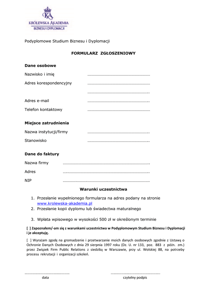 Podyplomowe Studium Biznesu i Dyplomacji FORMULARZ ZGŁOSZENIOWY Dane osobowe Nazwisko i imię …………………………………………………… Adres korespondencyjny …………………………………………………… ………………………………………………….. Adres e-mail ………………………………………………….. Telefon kontaktowy …………………………………………………… Miejsce zatrudnienia Nazwa instytucji/firmy ………………………………………………….. Stanowisko ………………………………………………….. Dane do faktury Nazwa firmy ……………………………………………………………………….. Adres …..………………………………………………………………….. NIP ………….……….……………….…………………………………. Warunki uczestnictwa 1. Przesłanie wypełnionego formularza na adres podany na stronie www.krolewska-akademia.pl 2. Przesłanie kopii dyplomu lub świadectwa maturalnego 3. Wpłata wpisowego w wysokości 500 zł w określonym terminie [ ] Zapoznałem/-am się z warunkami uczestnictwa w Podyplomowym Studium Biznesu i Dyplomacji i je akceptuję. [ ] Wyrażam zgodę na gromadzenie i przetwarzanie moich danych osobowych zgodnie z Ustawą o Ochronie Danych Osobowych z dnia 29 sierpnia 1997 roku (Dz. U. nr 133, poz. 883 z późn. zm.) przez Związek Firm Public Relations z siedzibą w Warszawie, przy ul. Wolskiej 88, na potrzeby procesu rekrutacji i organizacji szkoleń. …………………………………………… data ……………………………………………….. czytelny podpis
