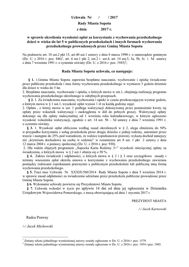 Uchwała Nr / / 2017 Rady Miasta Sopotu z dnia 2017 r. w sprawie określenia wysokości opłat za korzystanie z wychowania przedszkolnego dzieci w wieku do lat 5 w publicznych przedszkolach i innych formach wychowania przedszkolnego prowadzonych przez Gminę Miasta Sopotu Na podstawie art. 18 ust.2 pkt 15, art.40 ust.1 ustawy z dnia 8 marca 1990 r. o samorządzie gminnym (Dz. U. z 2016 r. poz. 446)1, art. 6 ust.1 pkt 2, ust.2 i ust.4, art. 14 ust.5, 5a, 5b, 5c i 5d ustawy z dnia 7 września 1991 r. o systemie oświaty (Dz. U. z 2016 r. poz. 1943)2; Rada Miasta Sopotu uchwala, co następuje: § 1. 1.Gmina Miasta Sopotu zapewnia bezpłatne nauczanie, wychowanie i opiekę świadczone przez publiczne przedszkola i inne formy wychowania przedszkolnego w wymiarze 5 godzin dziennie dla dzieci w wieku do 5 lat. 2. Bezpłatne nauczanie, wychowanie i opieka, o których mowa w ust.1, obejmują realizację programu wychowania przedszkolnego określonego w odrębnych przepisach. § 2. 1. Za świadczenia nauczania, wychowania i opieki w czasie przekraczającym wymiar godzin, o którym mowa w § 1 ust.1, wysokość opłat wynosi 1 zł za każdą godzinę zajęć. 2. Opłata , o której mowa w ust. 1 podlega waloryzacji dokonywanej przez pomnożenie kwoty tej opłaty przez wskaźnik waloryzacji i zaokrągleniu w dół do pełnych groszy. Waloryzacji opłaty dokonuje się dla opłaty maksymalnej od 1 września roku kalendarzowego, w którym ogłoszono wysokość wskaźnika waloryzacji, zgodnie z art. 14 ust. 5b – 5d ustawy z dnia 7 września 1991 r. o systemie oświaty. § 3. 1. Wysokość opłat obliczona według zasad określonych w § 2, ulega obniżeniu do 50% w przypadku korzystania z usług przedszkola przez drugie dziecko z jednej rodziny, natomiast przez trzecie i następne do 25% pod warunkiem, że rodzice (opiekunowie prawni), wykażą dochód mniejszy niż „kryterium dochodowe na osobę w rodzinie” w rozumieniu art. 8 ust. 1 pkt 2 ustawy z dnia 12 marca 2004 r. o pomocy społecznej (Dz. U. z 2016 r. poz. 930). 2. Dla rodzin objętych programem „Sopocka Karta Rodziny 3+” wysokość miesięcznej opłaty za świadczenia, o których mowa w § 2 ust.1 obniża się o 50 %. § 4. Zakres świadczeń i odpłatności, o których mowa w § 2 i § 3 oraz szczegółowe zasady i terminy wnoszenia opłat określa umowa o korzystanie z wychowania przedszkolnego zawierana pomiędzy rodzicami (opiekunami prawnymi) a publicznym przedszkolem lub publiczną inną formą wychowania przedszkolnego. § 5. Traci moc Uchwała Nr XXXIX/560/2014 Rady Miasta Sopotu z dnia 5 września 2014 r. w sprawie zasad odpłatności za świadczenia udzielane przez przedszkola publiczne prowadzone przez Gminę Miasta Sopotu. § 6. Wykonanie uchwały powierza się Prezydentowi Miasta Sopotu. § 7. Uchwała wchodzi w życie po upływie 14 dni od dnia jej ogłoszenia w Dzienniku Urzędowym Województwa Pomorskiego, z mocą obowiązującą od dnia 1 stycznia 2017 r. PREZYDENT MIASTA /-/ Jacek Karnowski Radca Prawny /-/ Jacek Michowski 1 2 Zmiany tekstu jednolitego wymienionej ustawy zostały ogłoszone w Dz. U. z 2016 r. poz. 1579. Zmiany tekstu jednolitego wymienionej ustawy zostały ogłoszone w Dz. U. z 2016 r. poz. 1954 i poz. 1985. Uzasadnienie W związku ze zmianą art.14 ust. 5 pkt 1 ustawy z dnia 7 września 1991 r. o systemie oświaty zmienionej dokonaną ustawą z dnia 1 grudnia 2016 r. o zmianie ustawy o dochodach jednostek samorządu terytorialnego oraz niektórych innych ustaw (Dz. U. z 2016 r., poz.1985) wysokość opłat za korzystanie z wychowania przedszkolnego w publicznych przedszkolach lub publicznych innych formach wychowania przedszkolnego prowadzonych przez gminę obejmuje dzieci w wieku do lat 5 z uwzględnieniem bezpłatnego nauczania, wychowania i opieki w czasie ustalonym przez organ prowadzący, nie krótszym niż 5 godzin dziennie. Posiadając zatem delegację prawną, Rada Miasta Sopotu, zobowiązana jest do podjęcia uchwały w sprawie ustalenia wysokości opłat za korzystanie z wychowania przedszkolnego dzieci w wieku do lat 5 na podstawie art. 14 ust.5 ustawy o systemie oświaty w brzmieniu nadanym tą ustawą. Proponowana uchwała zawiera uregulowania odnoszące się do aktualnego stanu prawnego i zachowuje dotychczas obowiązujący dzienny wymiar godzin bezpłatnego nauczania, wychowania i opieki w publicznych przedszkolach lub publicznych innych formach wychowania przedszkolnego oraz wysokość obniżenia opłat. Mając na uwadze powyższe przedłożenie projektu uchwały w proponowanej wersji stało się konieczne i uzasadnione. Wiceprezydent Miasta /-/ Joanna Cichocka-Gula