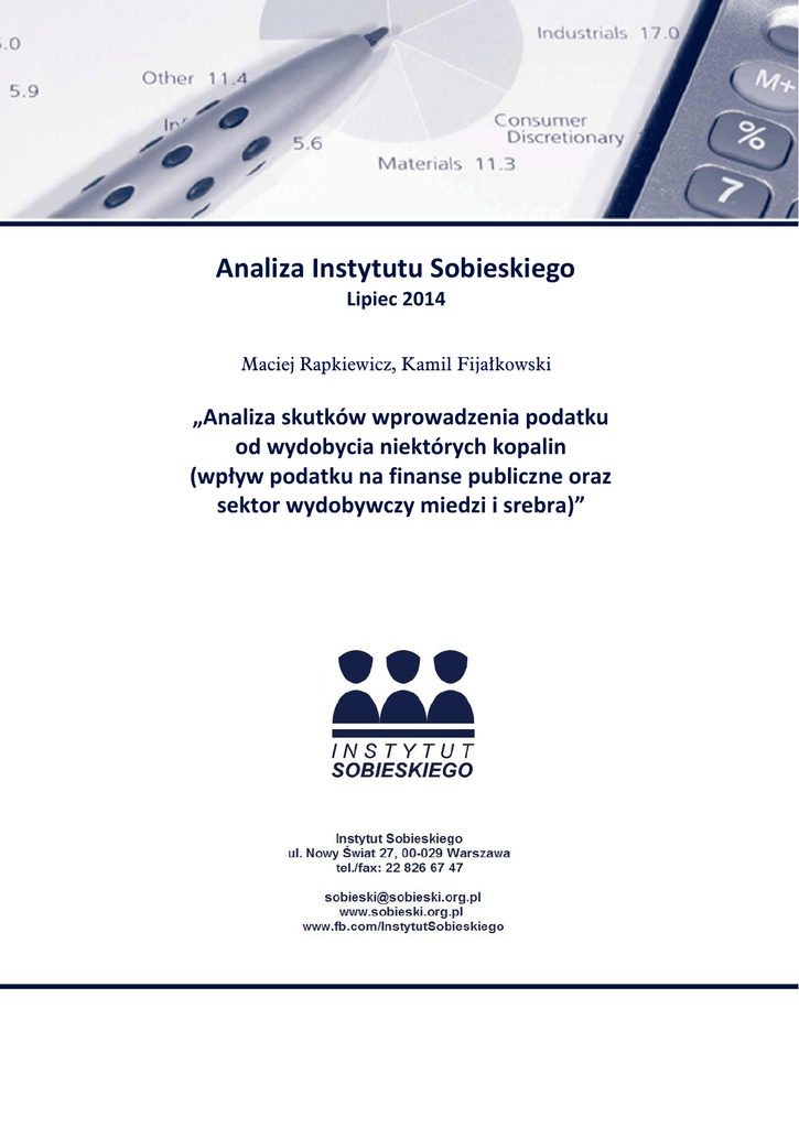 http://www.gww.pl/ Analiza Instytutu Sobieskiego Lipiec 2014 Maciej Rapkiewicz, Kamil Fijałkowski „Analiza skutków wprowadzenia podatku od wydobycia niektórych kopalin (wpływ podatku na finanse publiczne oraz sektor wydobywczy miedzi i srebra)” http://www.sobieski.org.pl/ http://www.sobieski.org.pl/ http://www.sobieski.org.pl/ http://www.sobieski.org.pl/ http://www.sobieski.org.pl/ http://www.sobieski.org.pl/ http://www.sobieski.org.pl/ http://www.sobieski.org.pl/ http://www.sobieski.org.pl/ http://www.sobieski.org.pl/ http://www.sobieski.org.pl/ http://www.sobieski.org.pl/ http://www.sobieski.org.pl/ http://www.sobieski.org.pl/ http://www.sobieski.org.pl/ http://www.sobieski.org.pl/ http://www.sobieski.org.pl/ http://www.sobieski.org.pl/ http://www.sobieski.org.pl/ http://www.sobieski.org.pl/ http://www.sobieski.org.pl/ http://www.sobieski.org.pl/ http://www.sobieski.org.pl/ http://www.sobieski.org.pl/ http://www.sobieski.org.pl/ http://www.sobieski.org.pl/ http://www.sobieski.org.pl/ http://www.sobieski.org.pl/ [email protected] http://www.sobieski.org.pl/ Analiza skutków wprowadzenia podatku od wydobycia niektórych kopalin (wpływ podatku na finanse publiczne oraz sektor wydobywczy miedzi i srebra) Spis treści: I GŁÓWNE WNIOSKI ......................................................................................................................... 3 II WPROWADZENIE ............................................................................................................................ 3 III WPŁYW PODATKU NA WYNIK SEKTORA FINANSÓW PUBLICZNYCH .......... 5 IV WPŁYW NA SEKTOR WYDOBYWCZY MIEDZI I SREBRA ........................................ 7 V WNIOSKI W ZAKRESIE OBOWIĄZUJĄCEGO PODATKU OD KOPALIN I ZASTRZEŻENIA DO STANOWISKA PRZEDSTAWIONEGO W RAPORCIE RZĄDOWYM ........................................................................................................................................... 9 VI INNE WĄTPLIWOŚCI ZWIĄZANE Z KONSTRUKCJĄ PODATKU OD KOPALIN ............................................................................................................................................... 11 VII POTENCJALNE ZMIANY I KONIECZNE DZIAŁANIA............................................. 12 www.sobieski.org.pl 2 I Główne wnioski Podatek od kopalin przyniósł znaczące (ponad 1,85 mld zł w roku 2013), dodatkowe dochody dla budżetu państwa. Utrzymanie dochodów w dłuższej perspektywie obarczone jest niepewnością na co wskazuje przykład Australii. Przewiduje się również negatywny wpływ na finanse jednostek samorządów terytorialnych; Wprowadzenie podatku od kopalin przyniosło negatywny wpływ na rentowność działalności wydobywczej jedynego podatnika, czyli KGHM S.A. W dłuższej perspektywie czasowej może doprowadzić do ujemnej rentowności poszczególnych kopalni, a także w ograniczyć inwestycje wymagające znaczących nakładów oraz zmniejszyć wykorzystanie zasobów złóż, co przełoży się w sposób negatywny na sytuację sektora, także finansową; Podnoszone są wątpliwości w zakresie konstytucyjności konstrukcji podatku od kopalin; Analiza skutków wprowadzenia podatku od kopalin powinna być dokonywana nie tylko ex post ale przede wszystkim obejmować skutki w przyszłości. Istotne jest odniesie się do rezultatów jego oddziaływania na finanse oraz sektor wydobywczy w przyszłości (wykonując predykcję na okres co najmniej pięciu - siedmiu lat), a nie tylko badać skutki już okresu minionego w stosunkowo krótkiej perspektywie dwóch lat jego obowiązywania. II Wprowadzenie Podatek od wydobycia niektórych kopalin (dokładnie miedzi i srebra) jest pobierany w Polsce od 18 kwietnia 2012 r., czyli od momentu wejścia w życie ustawy z dnia 2 marca 2012 r. o podatku od wydobycia niektórych kopalin1. Zgodnie z przepisem art. 25 wspomnianej ustawy, rząd miał dokonać analizy wpływu niniejszej ustawy na sektor wydobywczy miedzi i srebra oraz sektor finansów publicznych, a następnie przedłożyć Sejmowi odpowiednią informację w tym zakresie, nie później niż w okresie 2 lat od dnia wejścia w życie niniejszej ustawy. Taka analiza został przyjęta przez Radę Ministrów w dniu 17 kwietnia 2014 r. Analiza została przygotowana 1 Dz. U. Poz. 362 z roku 2012r. www.sobieski.org.pl 3 w trzech obszarach: wpływu podatku na sektor wydobywczy miedzi oraz srebra, z uwzględnieniem rynku pracy; wpływu ustawy na sektor finansów publicznych oraz administracyjnego aspektu wprowadzania nowej funkcjonowania daniny było ustawy. Zdaniem projektodawców, celem "uchwycenie nadzwyczajnych zysków podmiotów wydobywających miedź i srebro", czyli faktycznie KGHM Polska Miedź S.A. Przepisy ustawy o podatku od wydobycia niektórych kopalin zostały skonstruowane w sposób pozwalający na objęcie swoim zakresem każdego podmiotu, który wydobywa rudę miedzi lub/i produkuje z niej koncentrat. Jednak obecnie na terytorium Rzeczypospolitej Polskiej jedynym takim podmiotem jest KGHM Polska Miedź S.A.. Największym akcjonariuszem KGHM S.A. jest Skarb Państwa, który posiada 63 589 900 akcji spółki, co stanowi 31,79% jej kapitału zakładowego2. Pozostała część jest w rękach polskich i zagranicznych akcjonariuszy, tworząc tzw. „free float”. Wysokość podatku uzależniona jest przede wszystkim od wielkości wydobycia a także wartości surowców na rynku światowym i kursu dolara amerykańskiego. Stawki kwotowe podatku, obliczane są według określonych ustawą wzorów, przy czym zmieniają się one w zależności gdy cena przekracza określony pułap (15.000 zł za tonę miedzi oraz 1.200 zł za kilogram srebra3). Została przyjęta tzw. progresja potęgowa4 co oznacza, że stawka podatku wzrasta szybciej niż przychody uzyskiwane ze sprzedaży metali, gdy ceny metali są wyższe niż określony ustawą pułap (stawki maksymalne gdy cena miedzi osiągnie ok. 46 tys. zł za tonę, a w przypadku srebra - ok. 6.000