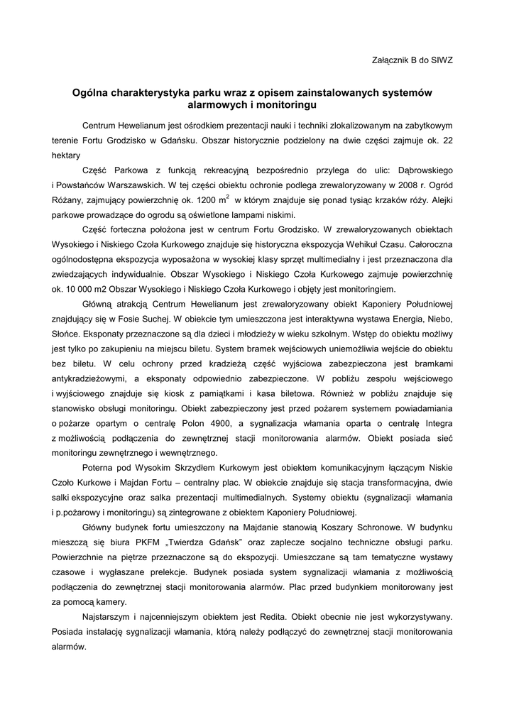 Załącznik B do SIWZ Ogólna charakterystyka parku wraz z opisem zainstalowanych systemów alarmowych i monitoringu Centrum Hewelianum jest ośrodkiem prezentacji nauki i techniki zlokalizowanym na zabytkowym terenie Fortu Grodzisko w Gdańsku. Obszar historycznie podzielony na dwie części zajmuje ok. 22 hektary Część Parkowa z funkcją rekreacyjną bezpośrednio przylega do ulic: Dąbrowskiego i Powstańców Warszawskich. W tej części obiektu ochronie podlega zrewaloryzowany w 2008 r. Ogród RóŜany, zajmujący powierzchnię ok. 1200 m 2 w którym znajduje się ponad tysiąc krzaków róŜy. Alejki parkowe prowadzące do ogrodu są oświetlone lampami niskimi. Część forteczna połoŜona jest w centrum Fortu Grodzisko. W zrewaloryzowanych obiektach Wysokiego i Niskiego Czoła Kurkowego znajduje się historyczna ekspozycja Wehikuł Czasu. Całoroczna ogólnodostępna ekspozycja wyposaŜona w wysokiej klasy sprzęt multimedialny i jest przeznaczona dla zwiedzających indywidualnie. Obszar Wysokiego i Niskiego Czoła Kurkowego zajmuje powierzchnię ok. 10 000 m2 Obszar Wysokiego i Niskiego Czoła Kurkowego i objęty jest monitoringiem. Główną atrakcją Centrum Hewelianum jest zrewaloryzowany obiekt Kaponiery Południowej znajdujący się w Fosie Suchej. W obiekcie tym umieszczona jest interaktywna wystawa Energia, Niebo, Słońce. Eksponaty przeznaczone są dla dzieci i młodzieŜy w wieku szkolnym. Wstęp do obiektu moŜliwy jest tylko po zakupieniu na miejscu biletu. System bramek wejściowych uniemoŜliwia wejście do obiektu bez biletu. W celu ochrony przed kradzieŜą część wyjściowa zabezpieczona jest bramkami antykradzieŜowymi, a eksponaty odpowiednio zabezpieczone. W pobliŜu zespołu wejściowego i wyjściowego znajduje się kiosk z pamiątkami i kasa biletowa. RównieŜ w pobliŜu znajduje się stanowisko obsługi monitoringu. Obiekt zabezpieczony jest przed poŜarem systemem powiadamiania o poŜarze opartym o centralę Polon 4900, a sygnalizacja włamania oparta o centralę Integra z moŜliwością podłączenia do zewnętrznej stacji monitorowania alarmów. Obiekt posiada sieć monitoringu zewnętrznego i wewnętrznego. Poterna pod Wysokim Skrzydłem Kurkowym jest obiektem komunikacyjnym łączącym Niskie Czoło Kurkowe i Majdan Fortu – centralny plac. W obiekcie znajduje się stacja transformacyjna, dwie salki ekspozycyjne oraz salka prezentacji multimedialnych. Systemy obiektu (sygnalizacji włamania i p.poŜarowy i monitoringu) są zintegrowane z obiektem Kaponiery Południowej. Główny budynek fortu umieszczony na Majdanie stanowią Koszary Schronowe. W budynku mieszczą się biura PKFM „Twierdza Gdańsk” oraz zaplecze socjalno techniczne obsługi parku. Powierzchnie na piętrze przeznaczone są do ekspozycji. Umieszczane są tam tematyczne wystawy czasowe i wygłaszane prelekcje. Budynek posiada system sygnalizacji włamania z moŜliwością podłączenia do zewnętrznej stacji monitorowania alarmów. Plac przed budynkiem monitorowany jest za pomocą kamery. Najstarszym i najcenniejszym obiektem jest Redita. Obiekt obecnie nie jest wykorzystywany. Posiada instalację sygnalizacji włamania, którą naleŜy podłączyć do zewnętrznej stacji monitorowania alarmów.