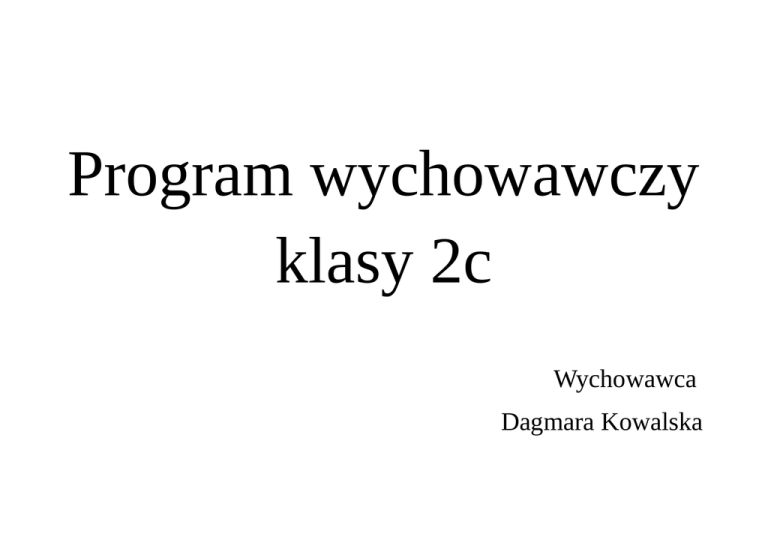 Program wychowawczy klasy 2c Wychowawca Dagmara Kowalska Cele ogólne: • wdrażanie do współdziałania i współżycia w grupie, klasie i szkole, • rozwijanie umiejętności komunikowania się z rówieśnikami i dorosłymi, • rozwijanie i poszerzanie zainteresowań dziecka, • rozwijanie wrażliwości na piękno Ojczyzny, • budzenie zainteresowań przeszłością kraju i najbliższej okolicy, • uczestnictwo w życiu kulturalnym, • rozwijanie właściwych zachowań i promowanie pozytywnych wartości, • rozwijanie więzi z rodziną, • wdrażanie do przestrzegania zasad higieny osobistej i ochrony własnego zdrowia, • wdrażanie do przestrzegania zasad bezpieczeństwa na terenie szkoły i poza nią, • zachęcanie do poszanowania przyrody, • wdrożenie do zachowania ładu i porządku w otoczeniu, • przygotowanie do samooceny i samokształcenia, • współpraca z rodzicami DZIAŁ PRACY WYCHOWAWCZEJ 1. Organizacja zespołu klasowego (edukacja środowiskowa) ZADANIA SZCZEGÓŁOWE I FORMY REALIZACJI OKRES REALIZACJI Zapoznanie z regulaminem szkolnym i egzekwowanie go od uczniów. Wrzesień Wybór samorządu klasowego. Cały rok Ustalenie obowiązku dyżurnych i wybór dyżurnych. Wdrażanie uczniów do właściwego, zdyscyplinowanego zachowania się w szkole, na lekcjach i przerwach. 2. Troska o wygląd estetyczny klasy (edukacja estetyczna). Urządzanie sali lekcyjnej- tablice przedmiotowe, dekoracje, okazy przyrodnicze. Wrzesień Cały rok Dbałość o pomoce dydaktyczne i sprzęt. Utrzymywanie czystości i porządku w sali. Dbanie o kącik książek i czasopism. Opieka nad roślinami doniczkowymi. 3. Kształtowanie właściwych postaw społecznych. Rozwijanie szacunku dla symboli tradycji narodowych i obrzędowości przez udział w apelach, uroczystościach szkolnych, klasowych. Cały rok Przygotowanie uczniów do udziału w życiu społecznym: wdrażanie do pracy w samorządzie klasowym, udział uczniów w pracach na rzecz klasy, szkoły, środowiska. Utrzymanie czystości na terenie szkoły i na boisku, szkolnym. Ład i porządek w tornistrze, na ławce i w klasie. Uczenie wzajemnego szacunku i pomocy wśród uczniów, uświadomienie konieczności szacunku wobec innych: nauczyciela, rodziców, osób starszych. Rozwijanie postaw patriotycznych, godne zachowanie wobec symboli narodowych. 4. Troska o wyniki w nauce i pozytywne zmiany w osobowości wychowanków Cząstkowa i okresowa analiza wyników nauczania. Próby samooceny wyników w nauce, zachowaniu i pracy społecznej. Opieka nad uczniami mającymi trudności w nauce, stosowanie obniżonego stopnia wymagań wobec tych dzieci, tworzenie zespołów dydaktyczno– wyrównawczych. Kontakty z rodzicami uczniów z trudnościami w nauce. Opieka nad uczniami zdolnymi, rozwijanie zainteresowań. Konkursy- wewnątrzklasowe, wewnątrzszkolne, pozaszkolne. Wdrażanie do uczestnictwa w imprezach kulturalnych. Wdrażanie do czytelnictwa książek, czasopism, aktywnego korzystania z biblioteki, czytelni. Cały rok Organizowanie „Dnia Czytelnika”. Korzystanie ze środków masowego przekazu: audycje telewizyjne, nagrania magnetofonowe, seanse filmowe, sztuki i przedstawienia teatralne, wystawy muzealne. Cały rok 5. Współżycie w zespole Wdrażanie do osobistej kultury bycia i kultury słowa poprzez gry, zabawy, konkursy, wycieczki, wspólne imprezy klasowe. Kształtowanie osobowości. Inspirowanie do osiągnięcia wysokich wyników (na miarę możliwości ucznia). Wdrażanie do wytrwałości i wysiłku. Wyrabianie odpowiedzialności za przyjęte przez siebie zobowiązania. Kształtowanie wrażliwości na piękno i dobro. Stwarzanie sytuacji sprzyjających współdziałaniu i rozwojowi pozytywnych związków uczuciowych w grupie. Rozwijanie umiejętności współżycia jednostki z pozostałymi uczniami. 6. Udział w obchodach świąt i uroczystości szkolnych i klasowych. Kształtowanie postaw społecznych, moralnych i patriotycznych Uroczyste rozpoczęcie roku szkolnego Dzień Chłopaka Uroczystość z okazji KEN Wszystkich Świętych Mikołajki Święta Bożego Narodzenia Choinka, Jasełka, Dzień Babci i Dziadka Dzień Dziewczynki Konstytucja 3 Maja Święto Rodziny Dzień Dziecka Uroczyste zakończenie roku szkolnego Wrzesień Październik Listopad Grudzień Styczeń Marzec Maj Czerwiec 7. Wspólne spędzanie wolnego czasu, wycieczki, wypoczynek. Wyrabianie kultury współżycia społecznego, umiejętności współżycia i współdziałania w zespole klasowym. Cały rok Przestrzeganie zasad i norm dobrego wychowania na co dzień. Organizacja wycieczek przedmiotowych. Uczestnictwo w zabawach szkolnych, przedstawieniach teatralnych, wycieczkach klasowych, grach i zabawach sportowych. 8. Zdrowie dziecka. Opieka psychologiczno- Wzmacnianie stanu zdrowia dzieci. Wdrażanie do higieny -pedagogiczna. Przeciwdziałanie osobistej i czystości. Wyrabianie nawyków właściwego demoralizacji i niedostosowaniu. ubierania się i hartowania ciała, racjonalnego odżywiania, współpraca z pielęgniarką. Ćwiczenia śródlekcyjne, ruch i zabawy na powietrzu. Gry i zabawy. Wdrażanie do przestrzegania bezpieczeństwa podczas pracy i wypoczynku. Higiena spożywania posiłków. Opieka psychologiczno- pedagogiczna nad dziećmi (współpraca z pedagogiem szkolnym, poradnią). Eliminowanie nadmiernych sytuacji stresowych. Różnicowanie wymagań dydaktycznych i wychowawczych w zależności od cech psychicznych i możliwości dziecka. Cały rok 9. Współpraca z rodzicami. Spotkania z rodzicami. Uczestnictwo rodziców w pracy wychowawczej. Pomoc trójki klasowej w organizacji życia w klasie. Indywidualne spotkania z rodzicami. Omawianie wyników w nauce i zachowaniu. Pomoc rodziców w organizowaniu imprez i wycieczek klasowych. Organizowanie lekcji otwartych Cały rok