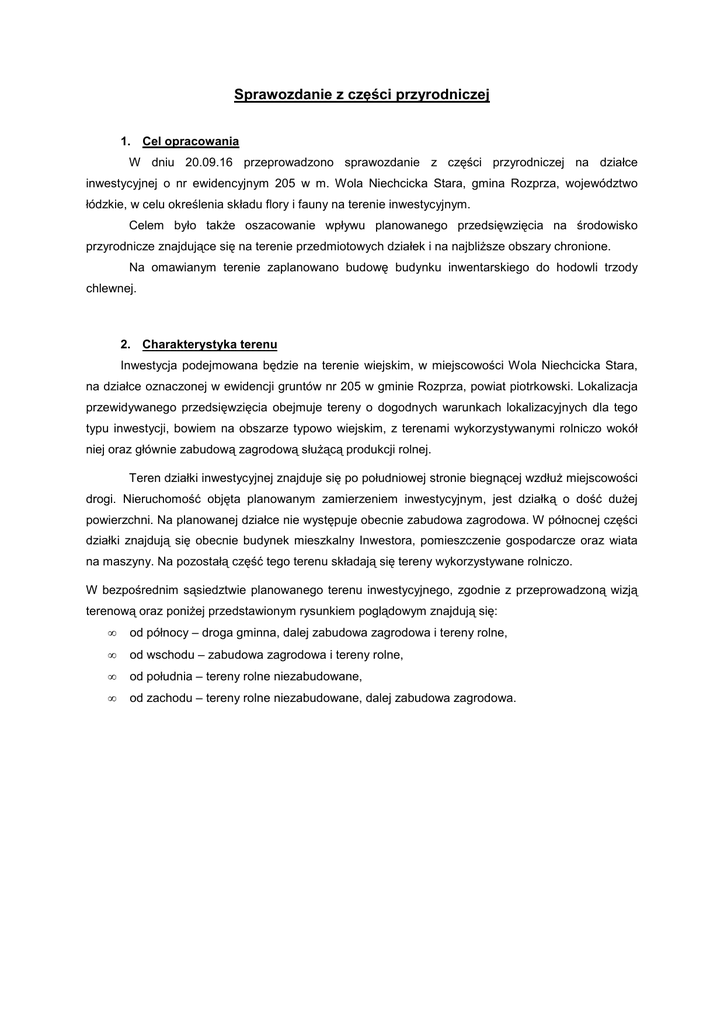 Sprawozdanie z części przyrodniczej 1. Cel opracowania W dniu 20.09.16 przeprowadzono sprawozdanie z części przyrodniczej na działce inwestycyjnej o nr ewidencyjnym 205 w m. Wola Niechcicka Stara, gmina Rozprza, województwo łódzkie, w celu określenia składu flory i fauny na terenie inwestycyjnym. Celem było także oszacowanie wpływu planowanego przedsięwzięcia na środowisko przyrodnicze znajdujące się na terenie przedmiotowych działek i na najbliższe obszary chronione. Na omawianym terenie zaplanowano budowę budynku inwentarskiego do hodowli trzody chlewnej. 2. Charakterystyka terenu Inwestycja podejmowana będzie na terenie wiejskim, w miejscowości Wola Niechcicka Stara, na działce oznaczonej w ewidencji gruntów nr 205 w gminie Rozprza, powiat piotrkowski. Lokalizacja przewidywanego przedsięwzięcia obejmuje tereny o dogodnych warunkach lokalizacyjnych dla tego typu inwestycji, bowiem na obszarze typowo wiejskim, z terenami wykorzystywanymi rolniczo wokół niej oraz głównie zabudową zagrodową służącą produkcji rolnej. Teren działki inwestycyjnej znajduje się po południowej stronie biegnącej wzdłuż miejscowości drogi. Nieruchomość objęta planowanym zamierzeniem inwestycyjnym, jest działką o dość dużej powierzchni. Na planowanej działce nie występuje obecnie zabudowa zagrodowa. W północnej części działki znajdują się obecnie budynek mieszkalny Inwestora, pomieszczenie gospodarcze oraz wiata na maszyny. Na pozostałą część tego terenu składają się tereny wykorzystywane rolniczo. W bezpośrednim sąsiedztwie planowanego terenu inwestycyjnego, zgodnie z przeprowadzoną wizją terenową oraz poniżej przedstawionym rysunkiem poglądowym znajdują się: • od północy – droga gminna, dalej zabudowa zagrodowa i tereny rolne, • od wschodu – zabudowa zagrodowa i tereny rolne, • od południa – tereny rolne niezabudowane, • od zachodu – tereny rolne niezabudowane, dalej zabudowa zagrodowa. Ryc. 1. Mapa poglądowa przedstawiająca działkę inwestycyjną nr ew. 205 oraz jej najbliższą okolicę 3. Metodyka badań a) Metody zbierania danych florystycznych Sprawozdanie z części florystycznej przeprowadzono metodą marszrutową: • Wykorzystano metodę marszrutową w celu szczegółowej penetracji powierzchni działek • W czasie analizowania powierzchni badawczej pod kątem różnorodności florystycznej i identyfikowano wszystkie napotkane rośliny, • Podczas zbierania danych korzystano z mapy terenu o skali 1:25 000. Penetrowano teren bezpośredniego oddziaływania planowanego zamierzenia inwestycyjnego w celu określenia występujących zbiorowisk roślinnych określenia składu gatunkowe flory występującej na obszarze badań. Wizja terenowe miała na celu stwierdzenie lub wykluczenia występowania przedstawicieli flory i objętej prawną ochroną gatunkową. • Dodatkowo zastosowano metodę kameralną polegającą na oznaczaniu poszczególnych roślin zielnych za pomocą odpowiedniego klucza. 2 W pierwszym etapie prac określono zasięg analiz przyrodniczych. W trakcie badań terenowych analizowano zasoby przyrodnicze danego obszaru. Wizje terenowe obejmowały miejsce planowanej inwestycji. Analiza mykologiczna terenu objętego planowanym zamierzeniem inwestycyjnym nie wykazała występowania grzybów w tym grzybów lichenizujących, które by były objęte prawną ochroną gatunkową. b) Metody zbierania danych faunistycznych • Szukano odchodów i miejsc żerowania, • Śledzono występowanie tropów pozostawionych na ziemi, • Poszukiwano potencjalnych szczątek zabitych zwierząt wzdłuż pasa gminnej drogi, • Szukano wypluwek ptaków drapieżnych, na podstawie których można było oznaczyć gatunek małych ssaków, • Szukano nor wykopanych przez ssaki, • Obecność ptaków odnotowywano na podstawie obserwacji bezpośrednich i głosowych, • Poszukiwano gniazd jak i pozostałości po potencjalnym wylęgu, • Obecność innych organizmów w tym gadów, płazów oraz bezkręgowców (owadów, pajęczaków) badano metodą eksploracji terenu. W metodologii posługiwano się fachową literaturą, jak i też konsultacjami z innymi przyrodnikami. 4. Wyniki z wizji przyrodniczej Flora Skład gatunków roślin naczyniowych obecnych na powierzchni terenu inwestycyjnego zawiera się w zbiorowisku zaliczanym do klasy Stellarietea mediae (zbiorowiska pól uprawnych i terenów ruderalnych). Przeprowadzona na terenie inwestycyjnym następujących gatunków roślin: • kupkówka pospolita Dactylis glomerata • perz właściwy Elymus repens • jasnota purpurowa Lamium purpurum • babka zwyczajna Plantago major • koniczyna biała Trifolium repens • pokrzywa zwyczajna Urtica dioica • krwawnik pospolity Achillea millefolium • rdest ptasi Pylogonum aviculare • tasznik pospolity Capsella bursa pastoris, • żółtlica drobnokwiatowa Galinsoga parviflora • bylica pospolita Artemisia vulgaris • starzec zwyczajny Sonecio vulgaris • mniszek lekarski Taraxacum officinale 3 wizja terenowa wykazała występowanie • rumianek pospolity Chamomilla recutita • szczaw tępolistny Rumex obtusifolius • rzodkiew świrzepa Raphanum raphanistrum • pięciornik gęsi Potentilla anserina Nie stwierdzono występowania flory objętej prawną ochroną gatunkową. Grzyby Nie stwierdzono występowania grzybów w tym lichenizujących, które byłyby objęte prawną ochroną gatunkową. Fauna bezkręgowce (Ivertebrata) • bielinek kapustnik (Pieris brassicae) • cuchna nawozowa (Scathophaga stercoraria) • mucha domowa (Musca domestica) • rusałka pawik (Inachis io) • krzyżak ogrodowy (Araenus diadematus) • zielenucha kształtna (Chloromyia formosa) • osa pospolita (Vespula vulgaris) • ścierwica mięsówka (Sarcophaga carnaria) kręgowce ( Vertebrata) Herpetofauna płazy bezogoniaste ( Anura) Na terenie inwestycyjnym brak jest miejsc rozrodu płazów (brak zbiorników wodnych). Nie stwierdzono wystę