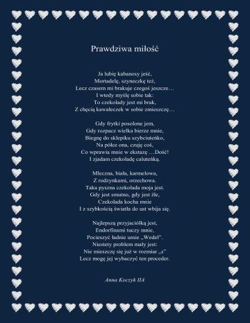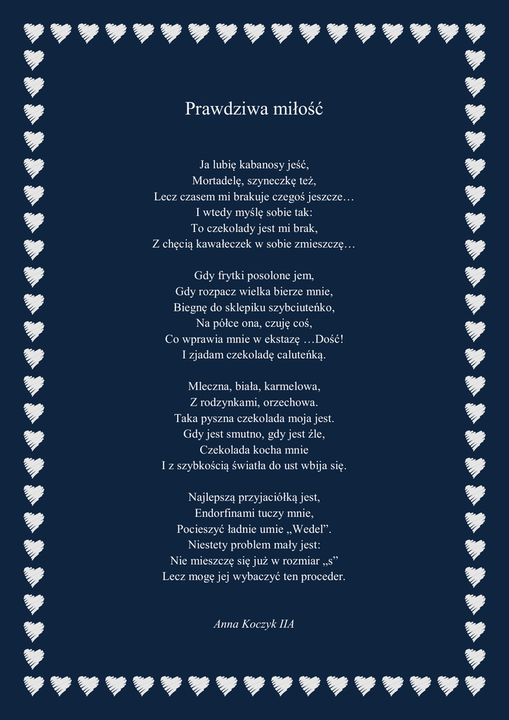 Prawdziwa miłość Ja lubię kabanosy jeść, Mortadelę, szyneczkę też, Lecz czasem mi brakuje czegoś jeszcze… I wtedy myślę sobie tak: To czekolady jest mi brak, Z chęcią kawałeczek w sobie zmieszczę… Gdy frytki posolone jem, Gdy rozpacz wielka bierze mnie, Biegnę do sklepiku szybciuteńko, Na półce ona, czuję coś, Co wprawia mnie w ekstazę …Dość! I zjadam czekoladę caluteńką. Mleczna, biała, karmelowa, Z rodzynkami, orzechowa. Taka pyszna czekolada moja jest. Gdy jest smutno, gdy jest źle, Czekolada kocha mnie I z szybkością światła do ust wbija się. Najlepszą przyjaciółką jest, Endorfinami tuczy mnie, Pocieszyć ładnie umie „Wedel”. Niestety problem mały jest: Nie mieszczę się już w rozmiar „s” Lecz mogę jej wybaczyć ten proceder. Anna Koczyk IIA