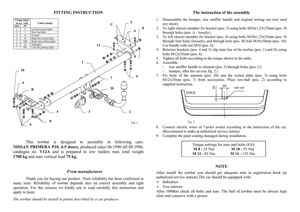 FITTING INSTRUCTION Clamp mark in acc. with ISO PN 1 L 2 + 3 31 4 R 5 58R 6 54 7 58L Cables joining The instruction of the assembly C Left directional lights Rear fog lights Ground Right directional lights Right side parking lights Stoplights Left side parking lights 5 8 A 11 8 1 10 9 7 30 6 20 B 1. Disassemble the bumper, rear muffler handle and original towing eye (not used any more). 2. To right chassis member fix bracket (pos. 5) using bolts M10x1,25x35mm (pos. 9) through holes (pos. A - loosely). 3. To left chassis member fix bracket (pos. 4) using bolts M10x1,25x35mm (pos. 9) through four holes (loosely), and through hole (pos. B) bolt M10x30mm (pos. 10). Use handle with nut M10 (pos. 6). 4. Between brackets (pos. 4 and 5) slip main bar of the towbar (pos. 1) and fix using bolts M12x35mm (pos. 8). 5. Tighten all bolts according to the torque shown in the table. 6. Assemble: - rear muffler handle to element (pos. 5) through holes (pos. C). - bumper, after his cut (see fig. 2.) 7. Fix body of the automat (pos. 20) and the socket plate (pos. 3) using bolts M12x25mm (pos. 7) from accessories. Place tow-ball (pos. 2) according to supplied instruction. 80 cut out EDGE 4 3 8 2 Fig. 1 9 Fig. 2 8. Connect electric wires of 7-poles socket according to the instruction of the car. (Recommend to make at authorized service station) 9. Complete the paint coating damaged during installation. This towbar is designed to assembly in following cars: NISSAN PRIMERA P10, 4-5 doors, produced since 06.1990 till 09.1996, catalogue no. V12A and is prepared to tow trailers max total weight 1700 kg and max vertical load 75 kg. Torque settings for nuts and bolts (8,8): M 8 - 25 Nm M 10 - 55 Nm M 12 - 85 Nm M 14 - 135 Nm NOTE From manufacturer Thank you for buying our product. Their reliability has been confirmed in many tests. Reliability of towbar depends also on correct assembly and right operation. For this reasons we kindly ask to read carefully this instruction and apply to hints. The towbar should be install in points described by a car producer. After install the towbar you should get adequate note in registration book (at authorised service station).The car should be equipped with: • Indicators • Tow mirrors After 1000km check all bolts and nuts. The ball of towbar must be always kept clear and conserve with a grease. PPUH AUTO-HAK S.J. Towbar accessories: Produkcja Haków Holowniczych Henryk & Zbigniew Nejman 76-200 SŁUPSK ul. Słoneczna 16K tel/fax (059) 8-414-414; 8-414-413 E-mail: [email protected] www. autohak.com.pl Towing hitch (without electrical set) Class: A50-X Designed for: Cat. no. V12A Manufacturer: NISSAN Model: PRIMERA Type: P10, 4-5 doors produced since 06.1990 till 09.1996 Technical data: D-value: 8,46 kN maximum trailer weight: 1700 kg maximum vertical cup load: 75 kg Approval number according to Directive 94/20/EC: e20*94/20*1067*00 Foreword This towbar is designed according to rules of safety traffic regulations. The towing hitch is a safety component and can be install only by qualified personnel. Any alteration or conversion of the towing hitch is prohibited and would lead to cancellation of design certification. Remove insulating compound and underseal from vehicle (if present) in the area of the matting surfaces of the towing hitch. The vehicle manufacturer’s specifications regarding trailer load and max. vertical cup load are decisive for driving, and values for the towing hitch cannot be exceeded. D-value formula: Max trailer weight [kg] x Max trailer weight [kg] + Max vehicle weight [kg] Max vehicle weight [kg] X 9,81 = 1000 D [kN] INSTRUKCJA MontaŜu i eksploatacji zaczepu kulowego Oznaczenie zacisku wg ISO PN 1 L 2 + 3 31 4 R 5 58R 6 54 7 58L C Kolejność czynności przy montaŜu 1. 5 Łączenie przewodów 8 A Kierunkowskazy lewe Tylne światła przeciwmgłowe Masa Kierunkowskazy prawe Światła pozycyjne prawe Światła hamowania Światła pozycyjne lewe 2. 3. 11 4. 5. 6. 8 1 10 7. 9 7 6 W celu zamontowania zaczepu naleŜy zdemontować zderzak, tylne zawiesie tłumika oraz fabryczne ucho holownicze (nie będzie ponownie montowane). Do prawej podłuŜnicy przykręcić wspornik (poz. 5) śrubami M10x1,25x35mm (poz. 9) przez otwory (poz. A) luźno. Do lewej podłuŜnicy przykręcić wspornik (poz. 4) śrubami M10x1,25x35mm (poz. 9) przez cztery otwory luźno, oraz przez otwór (poz. B) śrubą M10x30mm (poz. 10). Wykorzystać nakrętkę na wysięgniku kątowym (poz. 6). Pomiędzy wsporniki (poz. 4 i 5) wsunąć belkę główną zaczepu (poz. 1) i skręcić śrubami M12x35mm (poz. 8). Dokręcić wszystkie śruby z momentem jak pokazano w tabeli . Przykręcić: - tylne zawiesie tłumika na element zaczepu (poz. 5) przez otwory (poz. C). - zderzak po uprzednim wycięciu jego fragmentu jak pokazano na rys. 2. Przykręcić korpus automatu (poz. 20) śrubami M12x25mm (poz. 7) wraz z blachą pod gniazdo (poz. 3). Zamocować kulę zgodnie z instrukcją dołączaną do zaczepu z końcówką szybkodemontowalną. 20 30 B 80 Wyciąć RANT 4 3 8 2 Rys. 1 9 Rys. 2 Zaczep kulowy przeznaczony jest do zamontowania w samochodzie: NISSAN PRIMERA P10, 4-5 drz., produkowanym od 06.1990r. do 09.1996r., numer katalogowy V12A i słuŜy do ciągnięcia przyczep o masie całkowitej 1700 kg i nacisku na kulę max 75 kg. OD PRODUCENTA Dziękujemy za wybór produkowanego przez naszą firmę zaczepu kulowego. Jego niezawodność została potwierdzona licznymi testami oraz opiniami zadowolonych klientów. JednakŜe niezawodność zaczepów kulowych jest zaleŜna równieŜ od prawidłowego montaŜu oraz prawidłowej eksploatacji. Z tego powodu prosimy Państwa o staranne przeczytanie niniejszej instrukcji montaŜu oraz przestrzeganie zawartych wskazówek. Zaczep naleŜy zamontować w miejscach do tego celu przeznaczonych przez producenta samochodu. 8. Podłączyć przewody gniazdka 7 – bieg. do instalacji elektrycznej zgodnie z instrukcją fabryczną samochodu (zaleca się wykonanie w ASO). 9. Uz