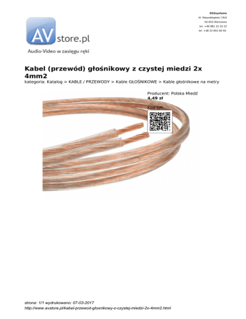 DSSsystems Al. Niepodległości 19/4 02-653 Warszawa tel. +48 881 22 33 22 tel. +48 22 852 00 50 Kabel (przewód) głośnikowy z czystej miedzi 2x 4mm2 kategoria: Katalog > KABLE / PRZEWODY > Kable GŁOŚNIKOWE > Kable głośnikowe na metry Producent: Polska Miedź 4,49 zł Kod QR: strona: 1/1 wydrukowano: 07-03-2017 http://www.avstore.pl/kabel-przewod-glosnikowy-z-czystej-miedzi-2x-4mm2.html