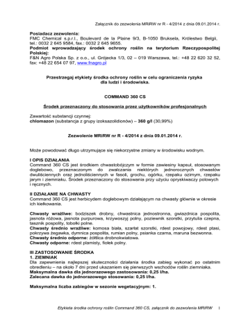 Załącznik do zezwolenia MRiRW nr R - 4/2014 z dnia 09.01.2014 r. Posiadacz zezwolenia: FMC Chemical s.p.r.l., Boulevard de la Plaine 9/3, B-1050 Bruksela, Królestwo Belgii, tel.: 0032 2 645 9584, fax.: 0032 2 645 9655. Podmiot wprowadzający środek ochrony roślin na terytorium Rzeczypospolitej Polskiej: F&N Agro Polska Sp. z o.o., ul. Grójecka 1/3, 02 – 019 Warszawa, tel.: +48 22 620 32 52, fax: +48 22 654 07 97, www.fnagro.pl Przestrzegaj etykiety środka ochrony roślin w celu ograniczenia ryzyka dla ludzi i środowiska. COMMAND 360 CS Środek przeznaczony do stosowania przez użytkowników profesjonalnych Zawartość substancji czynnej: chlomazon (substancja z grupy izoksazolidionów) – 360 g/l (30,99%) Zezwolenie MRiRW nr R - 4/2014 z dnia 09.01.2014 r. Może powodować długo utrzymujące się niekorzystne zmiany w środowisku wodnym. I OPIS DZIAŁANIA Command 360 CS jest środkiem chwastobójczym w formie zawiesiny kapsuł, stosowanym doglebowo, przeznaczonym do zwalczania niektórych jednorocznych chwastów dwuliściennych oraz jednoliściennych w fasoli, grochu, ogórku, rzepaku ozimym, rzepaku jarym i ziemniaku. Środek przeznaczony do stosowania przy użyciu opryskiwaczy polowych i ręcznych. II DZIAŁANIE NA CHWASTY Command 360 CS jest herbicydem doglebowym działającym na chwasty głównie w okresie ich kiełkowania. Chwasty wrażliwe: bodziszek drobny, chwastnica jednostronna, gwiazdnica pospolita, jasnota różowa, jasnota purpurowa, krzywoszyj polny, poziewnik szorstki, przytulia czepna, tasznik pospolity, tobołki polne. Chwasty średnio wrażliwe: komosa biała, szarłat szorstki, rdest powojowy, rdest ptasi, pokrzywa żegawka, dymnica pospolita, rumian polny, psianka czarna, maruna bezwonna. Chwasty średnio odporne: żółtlica drobnokwiatowa. Chwasty odporne: rdest plamisty, fiołek polny. III ZASTOSOWANIE ŚRODKA 1. ZIEMNIAK Dla zapewnienia najlepszej skuteczności działania środka zabieg wykonać po ostatnim obredleniu – na około 7 dni przed ukazaniem się pierwszych wschodów roślin ziemniaka. Maksymalna dawka dla jednorazowego zastosowania: 0,25 l/ha. Zalecana dawka do jednorazowego stosowania: 0,25 l/ha. Maksymalna liczba zabiegów w sezonie wegetacyjnym: 1. Etykieta środka ochrony roślin Command 360 CS, załącznik do zezwolenia MRiRW 1 Zalecana ilość wody: 200-300 l/ha. Zalecane opryskiwanie: średniokropliste. W celu rozszerzenia zakresu zwalczania chwastów (np. fiołka polnego, maruny bezwonnej) środek można stosować w tym samym terminie łącznie ze środkiem Sencor 70 WG. Zalecana dawka: Command 360 CS 0,25 l/ha + Sencor 70 WG 0,4-0,5 kg/ha. 2. RZEPAK OZIMY Środek stosować bezpośrednio po siewie rzepaku, na starannie uprawioną (bez grud) glebę. Nasiona rzepaku wysiewać na jednakową głębokość, dokładnie przykryć glebą. Przestrzegać innych zaleceń zapewniających właściwe przygotowanie roślin do przezimowania. Maksymalna dawka dla jednorazowego zastosowania: 0,33 l/ha. Zalecana dawka do jednorazowego stosowania: 0,25 - 0,33 l/ha. Maksymalna liczba zabiegów w sezonie wegetacyjnym: 1. Zalecana ilość wody: 200-300 l/ha. Zalecane opryskiwanie: średniokropliste. 3. RZEPAK JARY Środek stosować bezpośrednio po siewie rzepaku, na starannie uprawioną (bez grud) glebę. Nasiona rzepaku wysiewać na jednakową głębokość, dokładnie przykryć glebą. Maksymalna dawka dla jednorazowego zastosowania: 0,25 l/ha. Zalecana dawka do jednorazowego stosowania: 0,2 - 0,25 l/ha. Maksymalna liczba zabiegów w sezonie wegetacyjnym: 1. Zalecana ilość wody: 200-300 l/ha. Zalecane opryskiwanie: średniokropliste. UWAGI 1. Wyższą z zalecanych dawek stosować na glebach zwięzłych, o dużej zawartości próchnicy. 2. W niektórych odmianach rzepaku jarego mogą wystąpić przejściowe objawy fitotoksyczności nie mające wpływu na plonowanie. 3. Nie stosować na odmianach rzepaku jarego typu Canola. 4. GROCH Środek stosować bezpośrednio po siewie, na starannie uprawioną (bez grud) glebę. Maksymalna dawka dla jednorazowego zastosowania: 0,25 l/ha. Zalecana dawka do jednorazowego stosowania: 0,25 l/ha. Maksymalna liczba zabiegów w sezonie wegetacyjnym: 1. Zalecana ilość wody: 200-300 l/ha. Zalecane opryskiwanie: średniokropliste. 5. FASOLA Środek stosować bezpośrednio po siewie, na starannie uprawioną (bez grud) glebę. Maksymalna dawka dla jednorazowego zastosowania: 0,25 l/ha. Zalecana dawka do jednorazowego stosowania: 0,25 l/ha. Maksymalna liczba zabiegów w sezonie wegetacyjnym: 1. Etykieta środka ochrony roślin Command 360 CS, załącznik do zezwolenia MRiRW 2 Zalecana ilość wody: 200-300 l/ha. Zalecane opryskiwanie: średniokropliste. 6. OGÓREK Środek stosować bezpośrednio po siewie (najpóźniej do 2 dni po siewie) na starannie uprawioną (bez grud) glebę. Maksymalna dawka dla jednorazowego zastosowania: 0,25 l/ha. Zalecana dawka do jednorazowego stosowania: 0,25 l/ha. Maksymalna liczba zabiegów w sezonie wegetacyjnym: 1. Zalecana ilość wody: 200-300 l/ha. Zalecane opryskiwanie: średniokropliste. UWAGI: 1. Wyższą z zalecanych dawek stosować na glebach zwięzłych, o dużej zawartości próchnicy. 2. Stosowanie środka wymaga szczególnie dobrych warunków agrotechnicznych obejmujących prawidłową uprawę, wilgotność gleby itp. 3. Silne opady deszczu występujące w okresie kiełkowania i wschodów mogą powodować przemijające przebarwienia niektórych roślin uprawnych, szczególnie w przypadku występowania w tym czasie niskich temperatur, jednak bez wpływu na plon. 4. W przypadku zniesienia cieczy użytkowej środek może spowodować przebarwienia uprawianych w sąsiedztwie: zbóż jarych, kukurydzy, lucerny i buraków. 5. W przypadku stosowania środka ochrony roślin Command 360 CS w mieszaninach z innymi środkami ochrony roślin należy stosować się do zaleceń określonych w etykietach tych środków. 7. PRZECIWWSKAZANIA 1. Środka (również w mieszaninie z innym herbicydem )
