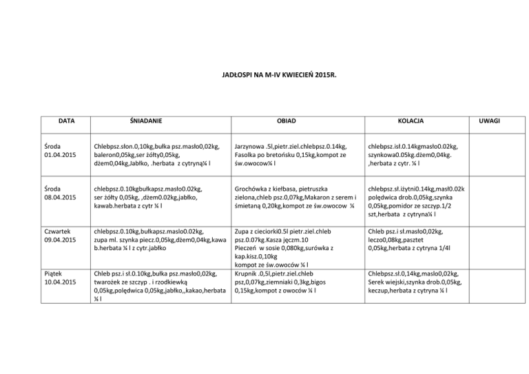 JADŁOSPI NA M-IV KWIECIEŃ 2015R. DATA ŚNIADANIE OBIAD KOLACJA Środa 01.04.2015 Chlebpsz.słon.0,10kg,bułka psz.masło0,02kg, baleron0,05kg,ser żółty0,05kg, dżem0,04kg,Jabłko, .herbata z cytryną¼ l Jarzynowa .5l,pietr.ziel.chlebpsz.0.14kg, Fasolka po bretońsku 0,15kg,kompot ze św.owocow¼ l chlebpsz.isł.0.14kgmasło0.02kg, szynkowa0.05kg.dżem0,04kg. ,herbata z cytr. ¼ l Środa 08.04.2015 chlebpsz.0.10kgbułkapsz.masło0.02kg, ser żółty 0,05kg, ,dżem0.02kg,jabłko, kawab.herbata z cytr ¼ l Grochówka z kiełbasa, pietruszka zielona,chleb psz.0,07kg,Makaron z serem i śmietaną 0,20kg,kompot ze św.owocow ¼ chlebpsz.sł.iżytni0.14kg,masł0.02k polędwica drob.0,05kg,szynka 0,05kg,pomidor ze szczyp.1/2 szt,herbata z cytryna¼ l Czwartek 09.04.2015 chlebpsz.0.10kg,bułkapsz.maslo0.02kg, zupa ml. szynka piecz.0,05kg,dżem0,04kg,kawa b.herbata ¼ l z cytr.jabłko Chleb psz.i sł.masło0,02kg, leczo0,08kg,pasztet 0,05kg,herbata z cytryna 1/4l Piątek 10.04.2015 Chleb psz.i sł.0.10kg,bułka psz.masło0,02kg, twarożek ze szczyp . i rzodkiewką 0,05kg,polędwica 0,05kg,jabłko,,kakao,herbata ¼l Zupa z cieciorki0.5l pietr.ziel.chleb psz.0.07kg.Kasza jęczm.10 Pieczeń w sosie 0,080kg,surówka z kap.kisz.0,10kg kompot ze św.owoców ¼ l Krupnik .0,5l,pietr.ziel.chleb psz,0,07kg,ziemniaki 0,3kg,bigos 0,15kg,kompot z owoców ¼ l Chlebpsz.sł.0,14kg,maslo0,02kg, Serek wiejski,szynka drob.0,05kg, keczup,herbata z cytryna ¼ l UWAGI Poniedziałek 13.04.2015 Wtorek 14.04.2015 Środa 15.04.2015 Czwartek 16.04.2015r. piątek 17.04.2015 Chleb psz.i sł.0,10kg,bułka psz.maslo0,02kg, baleron0,05kg,,dżem 0,04kg, jabłko, ,herbata z cytryna ¼ l chlebpsz.isł.0.10kg,bułkapsz.masło0.02kg,zupa ml.0.3l,szynka0.05kg,dżem0,04kg, jabłko, bułka maś.kawa b,herbata z cytryną ¼ l Brukselkowa ,5l,pietr.ziel.chleb psz.0.07kg,spaghetti 0,20kg,kompot ze sw.owocow ¼ l Pomidorowazmak.05l,pietr.ziel.chlebpsz0,07 ziemniaki0,3kg,udko pieczone,marchewka gotowana0,14kg, kompot ze św. owoców ¼ chlebpsz.i sł.0.10kg,bułka psz.masło0.02kgser ogórkowa0.5l,pietr.ziel.chlebpsz.0.07kg, b.0,05kg,miód,.szynka kons..0,05kg. ryżi0.1kg,pierś z kurczaka z ananasem0,12kg, jabłko.rogalik nadz.,kakao,herbata z cytryna ¼ l ,sur,z białej kap.0l10kg,kompot z owoców ¼ l Chleb psz.isł.0.10kg,bułkapsz.masło0.02kg, zupaml.0.3l,schab drob. 0,05kg,ser żółty 0,05kg,dżem 0,04kg, jabłko,,kawa b.herbata z cytryną ¼ l Chleb psz.i s…0,10kg,bułk apsz,masło0,02kg, pasta z jajek ze szczyp.0,08kg,polędwica 0,05kg, kakao,herbata z cytryna ¼ l,jabłko, chlebpsz.i sł.0.14kg.maslo0.02kg, pasta z jajek z kukurydza 0.10kg,pieczeń.05kg.herbata z cytr. ¼ lbanan chlebpsz.sł.izytni0.14kg,masło0.02 kg,schab drob..05kg, sałatka gyros0,12kg, ,herbata z cytryna ¼ Chleb psz.i sł.0.14kg,masło0,02kg, Szynka 0,05kg,pieczeń wiosenna0,05kg,jajko w maj.1 szt,pomidor ze szczyp.1/2 sztherbata z cytryna ¼ l Barszcz ukr.,5l,pietr.ziel.chleb psz.0.07kg,ziemn. ,0,10kg,koperek,kotlet s piersi kurczaka0,12kg, surówka z kap.pek..0,10kg,kompot ze sw.owoców ¼ l Chleb psz.i sł.0,14kg,masło0,02kg, szynkowa 0,05kg,Pol.drob.0,05kg, pasta z ryby 0,05kg,ogórek św.0,05kg.herbata z cytryna ¼ l Zupa z soczewicy,0,5l,pietr.ziel.chleb psz.0.07kg,ziemniaki 0,3kg,koperek,ryba w jarzynach 0,12kg,kompot ze św.owocow ¼ l Chleb psz.i sł.0,14kg,masło0,02kg szynka,0,05kg,ser biały0,05kg,miód herbata z cytryna ¼ l poniedziałek 20.04.2015 Chlebpsz.isł.0,10kg,bułka psz.masłl00,02kg, twarożek ze szczyp.0,05kg,baleron0,05kg, jabłko, herbata z cytryna ¼ l koperkowa.0.5lchleb psz.0.07kg, risotto 0,15kg, Kompot z owocow ¼ l chleb0.14kgmasło0.02kg,sałatka jarzynowa0,08kg,baleron 0,05kg,. Herbata z cytryną ¼ l wtorek 21.04.2015 chlebpsz.0.10kgbułkapszmasło0.02kg zupa ml.0.3lszynka0.05kg,dżem 0.04kg, jabłko,.kakao,herbata1/4 l Rosół z mak.,0,5l,chleb psz.0,07kg,ziemniaki 0,3kg,potrawka z kurczaka 0,15kg, sur.z marchwi i jabłka0,10kg,kompot z owoców ¼ l Chlebpsz.sł.0.14kgmaslo0.02kg,lec zo 0,12kg,szynkowa 0,05kg,herbata z cytryną ¼ l środa 22.04.2015 chlebpsz.bułkapsz.masło0.02kgszynka0.05kg, jabłko,serek top. Jabłko,,ciastko kawa b herbata ¼ l jarzynowa0,5l,pietr.ziel.chleb psz.0,07kg,, gołąbki w sosie0,12 kg, kompot z owoców ¼ l Chlebpsz.sł.0,14kg,masło0,02kg,sc hab piecz.0,05kg,Pol.drob.0,05kg, pomodor ze szczyp.1/2 szt.herbata z cytryną 1/4l Czwartek 23.04.2015 Chleb psz.isł.0,10kg,bułkapsz.masło0,02kg,zupa ml.ser żółty 0,05kg,szynka 0,05kg,kg,jabłko,herbata z cytryna ¼ l Szczawiowa z jajkiem, 0,5l,Pier.ziel.chleb psz.0,07kg,kasza grycz.0,10kg,pieczeń w sosie0,06kg,buraczki0,14kg,,kompot z owocow ¼ ll. Chleb psz.i sł.0,14kg,masło0,02kg, Ser żółty0,05kg,wędz.krot.0,05kg, pmidor ½ szt ze szczyp.szt,herbata z cytrna ¼ l chlebpsz.bułkapsz.maslo0.02kg,jajecznica ze szczyp.0.10kg,szynkowa .jabłko,ciastko, kawa b.herbata ¼ l fasolowa0.5lpietr.ziel.chleb psz.0.07kg, makaron z mięsem i kap.15kg,napoj ¼ l Chleb psz.i sł.masło0,02kg,pieczeń 0,05kg,schab dr.0,05kg,ogórek św.0,05kg,herbata z cytryną ¼ l piątek 24.04.2015 poniedziałek 27.04.2015 Chlebpsz.,sł.0,10kg,masło0,02kg,szynka dr.0,05kg,jajko w maj.1 szt.jabłko,bułka słodka,herbata z cytryna ¼ l wtorek 28.04.2015 chlebpsz.0.10kgbułkapsz.masło0.02kgzupaml.0. barszcz ukr.0.5lpietr.ziel.chleb psz.0.07kg. wędz.krot..0.05kg,dżem0.02kg,jabłko.ciastko, kasza grycz,.0.3kgklopsik w sosiew sosie kawa b.herbata ¼ l chrzanowym0.10kg.sur. z kap.kisz.0.10kg. napoj ¼ l , chlebpsz.bułkapsz.masło0.02kg,schab Ogórkowa 0.5lpietr.ziel.ch;leb drob..0.05kg,ser żółty 0,05kg,dżem psz.0.07kg,ziemniaki0,3kg,koperek 0,04kg,jabłko,ciastko, Kotlet mielony 0,10kg,mizeria kawab.herbata1/4 l 0,10kg,,kompot z owoców ¼ l, chlebpszisl0.14kgmasło0.02kg,sała tka wiosenna 0,08kg,schab dro,0.05kg keczup0.02kg,owoc ,herbata z cytryna ¼ l chlebpsz.isl.0.14kgmasło0.wędlina wiosenna.0.05kg, szynka0.05kg,rzodkiewka 3sztherbata1/4 l Chle