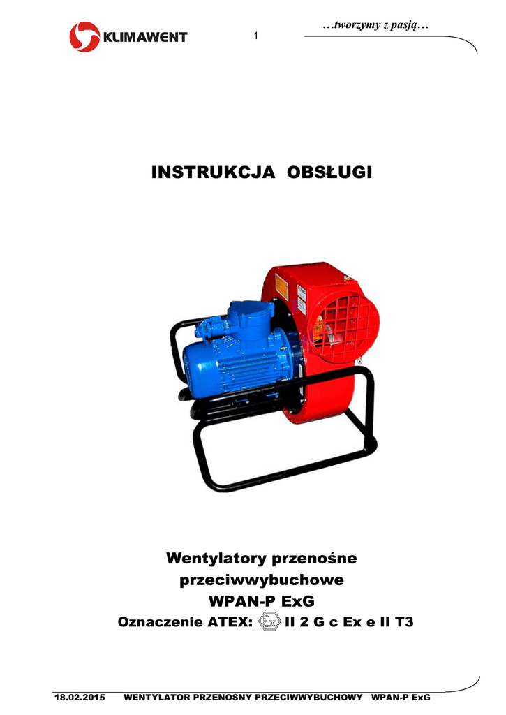 …tworzymy z pasją… 1 INSTRUKCJA OBSŁUGI Wentylatory przenośne przeciwwybuchowe WPAN-P ExG Oznaczenie ATEX: 18.02.2015 II 2 G c Ex e II T3 WENTYLATOR PRZENOŚNY PRZECIWWYBUCHOWY WPAN-P ExG …tworzymy z pasją… 2 Spis treści 1. Uwagi wstępne ……………………………………………... 3 2. Przeznaczenie ………………………………………………. 4 3. Zastrzeżenia producenta …………………………………. 5 4. Dane techniczne ……………………………………............ 5 5. Budowa i działanie …………………………………………. 7 6. Montaż i uruchomienie ……………………………………. 8 7. Użytkowanie ………………………………………………… 9 8. Zakłócenia w pracy, przyczyny, środki zaradcze .……. 10 9. Konserwacja ………………………………………………… 11 10. Instrukcja BHP ……………………………………………... 11 11. Transport i przechowywanie …………………………….. 12 12. Warunki gwarancji .…………………………………………. 12 13. Deklaracja zgodności .……………………………………... 14 WENTYLATOR PRZENOŚNY PRZECIWWYBUCHOWY WPAN-P ExG 18.02.2015 …tworzymy z pasją… 3 1. UWAGI WSTĘPNE Niniejsza instrukcja obsługi przeznaczona jest dla nabywcy i przyszłego użytkownika wentylatorów przeciwwybuchowych przenośnych typu WPAN-P ExG. Są w niej zamieszczone wskazówki dotyczące zastosowania, uruchamiania i eksploatacji w/w wyrobów. Właśnie dlatego przed przystąpieniem do montażu urządzenia na stanowisku pracy i jego uruchomieniem należy dokładnie zapoznać się z treścią niniejszej instrukcji. Ze względu na stałe udoskonalanie swoich wyrobów producent zastrzega sobie możliwość zmian konstrukcyjnych, których celem jest podwyższenie walorów użytkowych oraz bezpieczeństwo urządzenia. W razie stwierdzenia wadliwej pracy wentylatora należy zwrócić się z zapytaniem do producenta lub jego upoważnionego przedstawiciela. Konstrukcja wentylatorów WPAN-P ExG odpowiada wymaganiom aktualnego poziomu techniki oraz zapewnienia bezpieczeństwa i zdrowia zamieszczonym w następujących aktach prawnych: ● Dyrektywa 2006/42/WE Parlamentu Europejskiego i Rady z dnia17 maja 2006 r. w sprawie maszyn zmieniająca dyrektywę 95/16/WE (przekształcenie) /Dz. Urz. UE L157 z dn. 09 czerwca 2006 r. str. 24/ Rozporządzenie Ministra Gospodarki z dnia 21 października 2008 r. w sprawie wymagań dla maszyn (Dz. U. Nr 199 z 2008 r. poz. 1228) ● Dyrektywa 2006/95/WE Parlamentu Europejskiego i Rady z dnia12 grudnia 2006 r. w sprawie harmonizacji ustawodawstw państw członkowskich odnoszących się do stosowania w określonych granicach napięcia /Dz. Urz. UE L 374 z dn. 27.grudnia 2006 r. str.10/ Rozporządzenie Ministra Gospodarki z dnia 21 sierpnia 2007 r. w sprawie zasadniczych wymagań dla sprzętu elektrycznego (Dz. U. Nr 155 z 2007 r. poz. 1089) ● Dyrektywa ATEX 94/9/WE Parlamentu Europejskiego i Rady z dnia 23 marca 1994 r. w sprawie zbliżenia ustawodawstw Państw Członkowskich dotyczących urządzeń i systemów ochronnych przeznaczonych do użytku w przestrzeniach zagrożonych wybuchem /Dz. Urz. UE L100 z dnia 19 kwietnia 1994 r./ Rozporządzenie ministra Gospodarki Przemysłu Polityki Społecznej z dn. 29 maja 2003r. /Dz. U. Nr 263 / 2005r. poz. 2203/. Spełnia również wymagania następujących norm zharmonizowanych: PN-EN ISO 12100:2012 Bezpieczeństwo maszyn - Ogólne zasady projektowania – Ocena ryzyka i zmniejszanie ryzyka PN-EN 60204-1:2010 Bezpieczeństwo maszyn – Wyposażenie elektryczne maszyn. Cz.1: Wymagania ogólne. PN-EN ISO 13857:2010 Bezpieczeństwo maszyn – Odległości bezpieczeństwa uniemożliwiające sięganie kończynami górnymi i dolnymi do stref niebezpiecznych PN-EN 60079-0:2013/A11:2014E Urządzenia elektryczne w przestrzeniach zagrożonych wybuchem gazów – Część 0: Wymagania ogólne PN-EN 60079-7:2010 Urządzenia elektryczne w przestrzeniach zagrożonych wybuchem gazów - Część 7: Budowa wzmocniona “e” PN-EN 1127-1:2011P Atmosfery wybuchowe – zapobieganie wybuchowi i ochrona przed wybuchem Pojęcia podstawowe i metodologia. 18.02.2015 WENTYLATOR PRZENOŚNY PRZECIWWYBUCHOWY WPAN-P ExG …tworzymy z pasją… 4 Urządzenia nieelektryczne w przestrzeniach zagrożonych wybuchem. Część 1. Podstawowe założenia i wymagania. PN-EN 14986; 2009 Projektowanie wentylatorów stosowanych w przestrzeniach zagrożonych wybuchem ISO 14694:2003+AMD1:2010 Wentylatory przemysłowe – Wytyczne do jakości wyważania i poziomu drgań. PN-ISO 14695:2008 Wentylatory przemysłowe – Metoda pomiaru drgań wentylatorów. PN-EN 13463-1: 2010 2. PRZEZNACZENIE Wentylatory WPAN-P ExG są przeznaczone do pracy w przestrzeniach zagrożonych wybuchem, w których może wystąpić atmosfera wybuchowa tj. mieszanina substancji palnych w postaci gazów i par z powietrzem, w której po wystąpieniu zapłonu, spalanie rozprzestrzenia się na całą niespaloną mieszaninę. Podwyższony spręż tych wentylatorów pozwala na ich współpracę z odciągami miejscowymi urządzeniami wentylacyjnymi, a także z siecią wentylacyjną o znacznych oporach. Wentylatory mogą pracować w zakresie temperatur -20°C do +40°C. Są przeznaczone do przetłaczania powietrza suchego o zapyleniu nie większym niż 0,3 g/m3, bez zanieczyszczeń lepkich, żrących i temperaturze maksymalnej +60°C. Zgodnie z Dyrektywą 94/9/WE ATEX oraz normą PN-EN 13463-1 urządzenie daje poziom zabezpieczenia: „WYSOKI” – jako urządzenie sklasyfikowane w grupie II kategoria 2 i jest przeznaczone do użycia w przestrzeniach, w których jest prawdopodobne pojawienie się atmosfer wybuchowych. Urządzenie może pracować w strefach 1, 2 (G). Urządzenie jest oznaczone na tabliczce znamionowej - II 2 G c Ex e II T3. Oznaczenie warunków pracy urządzenia- grupa / kategoria / zagrożenie / klasa ■