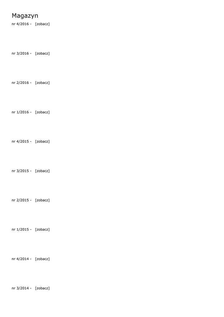 Magazyn nr 4/2016 - [zobacz] nr 3/2016 - [zobacz] nr 2/2016 - [zobacz] nr 1/2016 - [zobacz] nr 4/2015 - [zobacz] nr 3/2015 - [zobacz] nr 2/2015 - [zobacz] nr 1/2015 - [zobacz] nr 4/2014 - [zobacz] nr 3/2014 - [zobacz] nr 2/2014 - [zobacz] nr 1/2014 - [zobacz] nr 5/2013 - [zobacz] nr 4/2013 - [zobacz] nr 3/2013 - [zobacz] nr 2/2013 - [pobierz] (format pdf, rozmiar 21,4 MB) nr 1/2013 - [pobierz] (format pdf, rozmiar 20,1 MB) Jesień 2012 - [pobierz] (format pdf, rozmiar 10,8 MB) Lato 2012 - [pobierz] (format pdf, rozmiar 10 MB) Wiosna 2012 - [pobierz] (format pdf, rozmiar 14,3 MB) Zima 2011/2012 - [pobierz] (format pdf, rozmiar 11,7 MB) Jesień 2011 - [pobierz] (format pdf, rozmiar 13,5 MB) Lato 2011 - [pobierz] (format pdf, rozmiar 17,6 MB) Wiosna 2011 - [pobierz] (format pdf, rozmiar 11,9 MB) Zima 2010/2011 - [pobierz] (format pdf, rozmiar 12,9 MB) Jesień 2010 - [pobierz] (format pdf, rozmiar 23,2 MB) Lato 2010 - [pobierz] (format pdf, rozmiar 19,3 MB) Wiosna 2010 - [pobierz] (format pdf, rozmiar 11,1 MB)