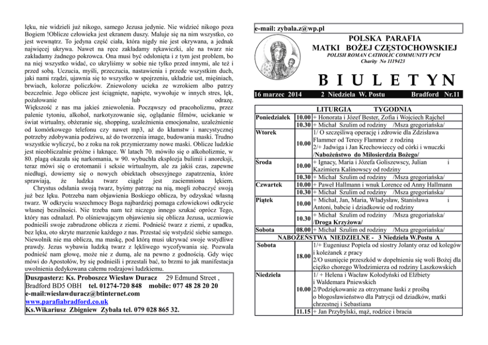 lęku, nie widzieli już nikogo, samego Jezusa jedynie. Nie widzieć nikogo poza Bogiem !Oblicze człowieka jest ekranem duszy. Maluje się na nim wszystko, co jest wewnątrz. To jedyna część ciała, która nigdy nie jest okrywana, a jednak najwięcej ukrywa. Nawet na ręce zakładamy rękawiczki, ale na twarz nie zakładamy żadnego pokrowca. Ona musi być odsłonięta i z tym jest problem, bo na niej wszystko widać, co ukryliśmy w sobie nie tylko przed innymi, ale też i przed sobą. Uczucia, myśli, przeczucia, nastawienia i przede wszystkim duch, jaki nami rządzi, ujawnia się to wszystko w spojrzeniu, układzie ust, mięśniach, brwiach, kolorze policzków. Zniewolony ucieka ze wzrokiem albo patrzy bezczelnie. Jego oblicze jest ściągnięte, napięte, wywołuje w innych stres, lęk, pożałowanie lub odrazę. Większość z nas ma jakieś zniewolenia. Począwszy od pracoholizmu, przez palenie tytoniu, alkohol, narkotyzowanie się, oglądanie filmów, uciekanie w świat wirtualny, obżeranie się, shopping, uzależnienia emocjonalne, uzależnienie od komórkowego telefonu czy nawet mp3, aż do kłamstw i narcystycznej potrzeby zdobywania podziwu, aż do tworzenia image, budowania maski. Trudno wszystkie wyliczyć, bo z roku na rok przymierzamy nowe maski. Oblicze ludzkie jest nieobliczalnie próżne i łaknące. W latach 70. mówiło się o alkoholizmie, w 80. plagą okazała się narkomania, w 90. wybuchła eksplozja bulimii i anoreksji, teraz mówi się o erotomanii i seksie wirtualnym, ale za jakiś czas, zapewne niedługi, dowiemy się o nowych obiektach obsesyjnego zapatrzenia, które sprawiają, że ludzka twarz ciągle jest zaciemniona lękiem. Chrystus odsłania swoją twarz, byśmy patrząc na nią, mogli zobaczyć swoją już bez lęku. Potrzeba nam objawienia Boskiego oblicza, by odzyskać własną twarz. W odkryciu wszechmocy Boga najbardziej pomaga człowiekowi odkrycie własnej bezsilności. Nie trzeba nam też niczego innego szukać oprócz Tego, który nas odnalazł. Po olśniewającym objawieniu się oblicza Jezusa, uczniowie podnieśli swoje zabrudzone oblicza z ziemi. Podnieść twarz z ziemi, z upadku, bez lęku, oto skryte marzenie każdego z nas. Przestać się wstydzić siebie samego. Niewolnik nie ma oblicza, ma maskę, pod którą musi ukrywać swoje wstydliwe prawdy. Jezus wybawia ludzką twarz z lękliwego wycofywania się. Pozwala podnieść nam głowę, może nie z dumą, ale na pewno z godnością. Gdy więc mówi do Apostołów, by się podnieśli i przestali bać, to brzmi to jak manifestacja uwolnienia dedykowana całemu rodzajowi ludzkiemu. Duszpasterz: Ks. Proboszcz Wiesław Duracz 29 Edmund Street , Bradford BD5 OBH tel. 01274-720 848 mobile: 077 48 28 20 20 e-mail:[email protected] www.parafiabradford.co.uk Ks.Wikariusz Zbigniew Zybała tel. 079 028 865 32. e-mail: [email protected] POLSKA PARAFIA MATKI BOŻEJ CZĘSTOCHOWSKIEJ POLISH ROMAN CATHOLIC COMMUNITY PCM Charity No 1119423 B I U L E T YN 16 marzec 2014 2 Niedziela W. Postu LITURGIA Bradford Nr.11 TYGODNIA Poniedziałek 10.00 + Honorata i Józef Bester, Zofia i Wojciech Rajchel 10.30 + Michał Szulim od rodziny /Msza gregoriańska/ Wtorek 1/ O szczęśliwą operację i zdrowie dla Zdzisława Flammer od Teresy Flammer z rodziną 10.00 2/+ Jadwiga i Jan Krechowieccy od córki i wnuczki /Nabożeństwo do Miłosierdzia Bożego/ Środa + Ignacy, Maria i Józefa Goliszewscy, Julian i 10.00 Kazimiera Kalinowscy od rodziny 10.30 + Michał Szulim od rodziny /Msza gregoriańska/ Czwartek 10.00 + Paweł Hallmann i wnuk Lorence od Anny Hallmann 10.30 + Michał Szulim od rodziny /Msza gregoriańska/ Piątek + Michał, Jan, Maria, Władysław, Stanisława i 10.00 Antoni, babcie i dziadkowie od rodziny + Michał Szulim od rodziny /Msza gregoriańska/ 10.30 /Droga Krzyżowa/ Sobota 08.00 + Michał Szulim od rodziny /Msza gregoriańska/ NABOŻEŃSTWA NIEDZIELNE - 3 Niedziela W.Postu A Sobota 1/+ Eugeniusz Popiela od siostry Jolanty oraz od kolegów i koleżanek z pracy 18.00 2/O usunięcie przeszkód w dopełnieniu się woli Bożej dla ciężko chorego Włodzimierza od rodziny Laszkowskich Niedziela 1/ + Helena i Wacław Kołodyński od Elżbiety i Waldemara Pniewskich 10.00 2/Podziękowanie za otrzymane łaski z prośbą o błogosławieństwo dla Patrycji od dziadków, matki chrzestnej i Sebastiana 11.15 + Jan Przybylski, mąż, rodzice i bracia /Gorzkie Żale/ Lektorzy - Sobota 22.03.2014 g.18.00 Laszkowscy Niedziela 23.03.2014 g. 10.00 E.Pniewska g.11.15 - J.Jelito Dyżur przedstawiciela PRD Sali św. Brata Alberta, sobota i niedziela 22-23.03.2014 – J.J.Nowicki OFIARY Na potrzeby parafii – M.K.Musztafa £20;Wynajem POK-u £60. Na kwiaty – £ Taca dla parafii – 09.03.2014 - £482.90 Gift Aid 02.02.2014 - £88 Jeżeli ktoś z Parafian pragnie złożyć ofiarę czekiem/na dowolny cel parafialny/, prosimy go wypisać na –P.C.M. BRADFORD. Wszystkim ofiarodawcom składamy serdeczne podziękowanie za złożone ofiary na nasze cele parafialne. Bóg zapłać. *** OGŁOSZENIA DUSZPASTERSKIE *** Dzisiaj będzie zebrana druga taca i przeznaczona dla potrzeb misji „Ad gentes”. Dziękujemy za ofiary. 1. Dzisiejsza, druga niedziela Wielkiego Postu kieruje nasz wzrok na Chrystusa uwielbionego, abyśmy nie zapominali, że trud, którego doświadczamy obecnie, nie jest pozbawiony sensu, lecz ma nas prowadzić do udziału w chwale Bożej. 2. Obchodzimy dziś dzień modlitw za misje i misjonarzy. Wpatrując się w przemienione oblicze Jezusa, nie możemy zapominać, że na świecie wciąż są ludzie, do których nie dotarła jeszcze dobra nowina o zbawieniu. Dlatego też otoczmy serdeczną modlitwą i troską, także materialną, tych, którzy podejmują Boże wezwanie skierowane do nich tak, jak do Abrahama: „Wyjdź z twojej ziemi rodzinnej”. 3. Pamiętajmy również, że każdy z nas może stawać się misjonarzem w swoim środowisku pracy i w swojej rodzinie, dzieląc się darem wiary, który o