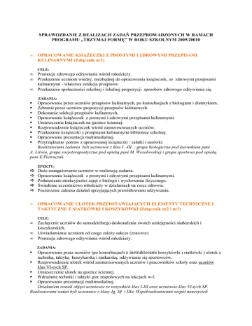 SPRAWOZDANIE Z REALIZACJI ZADAŃ PRZEPROWADZONYCH W RAMACH PROGRAMU „TRZYMAJ FORMĘ” W ROKU SZKOLNYM 2009/20010 • OPRACOWANIE KSIĄśECZKI Z PROSTYMI I ZDROWYMI PRZEPISAMI KULINARNYMI (Załącznik nr1) • • Promocja zdrowego odŜywiania wśród młodzieŜy. Przekazanie uczniom wiedzy, niezbędnej do opracowania ksiąŜeczek, ze zdrowymi przepisami kulinarnymi - właściwa selekcja przepisów. Przekazanie społeczności szkolnej i lokalnej propozycji sposobów zdrowego odŜywiania się. • CELE: ZADANIA: Opracowanie przez uczniów przepisów kulinarnych, po konsultacjach z biologiem i dietetykiem. Zebranie przez uczniów propozycji przepisów kulinarnych. Dokonanie selekcji przepisów kulinarnych. Opracowanie ksiąŜeczek z prostymi i zdrowymi przepisami kulinarnymi. Umieszczenie ksiąŜeczek na gazetce ściennej. Rozprowadzenie ksiąŜeczek wśród zainteresowanych uczniów. Przekazanie ksiąŜeczki z przepisami kulinarnymi bibliotece szkolnej. Opracowanie prezentacji multimedialnej. Przyrządzanie potraw z opracowanej ksiąŜeczki : sałatki i surówki. Realizatorami zadania byli uczniowie z klas I –III ; grupa biologiczna pod kierunkiem pani A. Litwin, grupa socjoterapeutyczna pod opieką pani M. Wesołowskiej i grupa sportowa pod opieką pani E.Pietruczuk. EFEKTY: DuŜe zaangaŜowanie uczniów w realizację zadania. Opracowanie ksiąŜeczek z prostymi i zdrowymi przepisami kulinarnymi. Podniesienie atrakcyjności zajęć z biologii i wychowania fizycznego. Świadome uczestnictwo młodzieŜy w działaniach na rzecz zdrowia. Poszerzenie zakresu działań sprzyjających prawidłowemu odŜywianiu. • OPRACOWANIE ULOTEK PRZEDSTAWIAJĄCYCH ELEMENTY TECHNICZNE I TAKTYCZNE Z SIATKÓWKI I KOSZYKÓWKI (Załącznik nr2 i nr3) • • • CELE: Zachęcenie uczniów do samodzielnego doskonalenia swoich umiejętności siatkarskich i koszykarskich. Uświadomienie uczniom od czego zaleŜy sukces (ZDROWIE!) Promocja zdrowego odŜywiania wśród młodzieŜy. ZADANIA: Opracowanie przez uczniów (po konsultacjach z instruktorami koszykówki i siatkówki ) ulotek z techniką, taktyką koszykarską i siatkarską; odŜywianie się sportowców. Rozprowadzenie ulotek wśród zainteresowanych uczniów i pracowników szkoły oraz uczniów klas VI-tych SP. Umieszczenie ulotek na gazetce ściennej. WdraŜanie techniki i taktyki gier zespołowych na lekcjach w-f. Opracowanie prezentacji multimedialnej. Działaniem zostali objęci uczniowie ze wszystkich klas I-III oraz uczniowie klas VI-tych SP. Realizatorami zadań byli uczennice z klasy Ig, IIf i IIIa. Współrealizatorami zespół nauczycieli wychowania fizycznego. Ulotka została umieszczona na gazetce i szkolnej stronie internetowej. Odbiorcami była społeczność szkolna i lokalna. EFEKTY: Rozpowszechnienie wśród uczniów, pracowników szkoły i społeczności lokalnej . Świadome uczestnictwo młodzieŜy w działaniach na rzecz zdrowia. Poszerzenia zakresu działań wpływających pozytywnie na sylwetkę i prawidłowy rozwój organizmu. Podniesienia atrakcyjności zajęć z wychowania fizycznego. DuŜe zainteresowanie i zaangaŜowanie uczniów w realizację zadania. • ZWYCIĘSTWO NASZYCH SIATKAREK! 21 listopada 2009r. reprezentacja siatkarek naszej szkoły wzięła udział w turnieju siatkarskim o PUCHAR DYREKTORA ZESPOŁU SZKÓŁ W DĄBROWIE BISKUPIEJ. Walkę sportową podjęły 3 zespoły, prezentując wysoki poziom gry siatkarskiej. Po pełnych emocji meczach puchar Dyrektora trafił w ręce druŜyny z Gniewkowa, która zajęła I miejsce, kolejno II miejsce zajęli gospodarze turnieju, natomiast III miejsce przypadło w udziale gimnazjalnym siatkarkom z Rojewa. W w/w turnieju nasze gimnazjum reprezentowały uczennice naleŜące do koła sportowego z siatkówki, prowadzonego przez p. E. Pietruczuk. EFEKTY: Zaspokojenie potrzeby aktywności ruchowej i aspiracji sportowych młodzieŜy Promocja zdrowego stylu Ŝycia wśród młodzieŜy Promocja gimnazjum w środowisku lokalnym Integracja młodzieŜy gimnazjalnej Aktywne i bezpieczne spędzenie czasu wolnego przez młodzieŜ Podniesienie poziomu sprawności ogólnej i specjalnej uczennic Promocja wśród młodzieŜy pozytywnych postaw społecznych Wzrost odporności psychicznej związanej z walką sportową Sukcesy w w/w turnieju : zajęcie I miejsca Integracja nauczycieli wychowania fizycznego i wymiana doświadczeń związanych z realizacją programu „Trzymaj formę!”. • MIKOŁAJKOWY TURNIEJ SIATKARSKI Został zorganizowany przez Stowarzyszenie Rozwoju Wierzchosławic, w dniu 04.12.2009r. w Wierzchosławicach. Walkę siatkarską podjęli uczniowie i absolwenci naszego Gimnazjum w składach mieszanych. I m-ce zajął zespół „Cykor-SPA”, w składzie: Julia Urbaniak, Sandra DróŜdŜ, Przemysław Gołębiewski, Krystian Jędrasik, Filip Sadowski, Natalia Markowska, Katarzyna Kuźniacka II m-ce zajął zespół „Klub Marjana”, w składzie: Filip Marjanowski, Kamil Brzustowicz, Eryk Andrzejewski, Michał Dopierała, Filip Walaszczyk, Patryk Moruń, Karol PraŜniewski III m-ce zajął zespół „Delecta”, w składzie: Natalia Łącka, Agnieszka Wojtczak, Agata Milewska, Anna Wachowiak, Agata Sieradzka, Anna Matyjasik, Paweł Pietruczuk. Uczestnicy otrzymali dyplomy i upominki. EFEKTY: Zaspokojenie potrzeby aktywności ruchowej i aspiracji sportowych młodzieŜy Promocja zdrowego stylu Ŝycia wśród młodzieŜy Integracja młodzieŜy gimnazjalnej i ponadgimnazjalnej Aktywne i bezpieczne spędzenie czasu wolnego przez młodzieŜ Promocja wśród młodzieŜy pozytywnych postaw społecznych Wzrost odporności psychicznej związanej z walką sportową • NASZE CHEERLEADERS W WARSZAWIE W dniu 13.03.2010r.w Warszawie odbył się VII Halowy Turniej Piłki NoŜnej o Puchar Ambasadora Francji VIIEME TOURNOI DE FOOTBALL POUR LA COUPE DE LA CCIFP zorganizowany przez Francuską Izbę Przemysłowo-Handlową w Polsce. W turnieju wzięło udział 28 zespołów (składających się z graczy