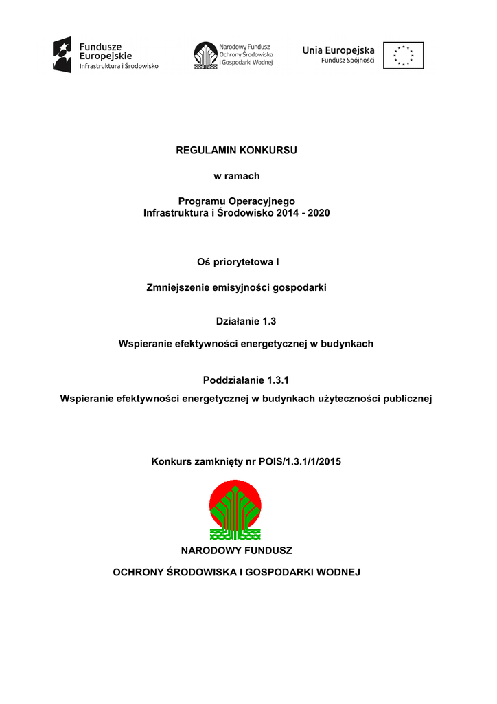 REGULAMIN KONKURSU w ramach Programu Operacyjnego Infrastruktura i Środowisko 2014 - 2020 Oś priorytetowa I Zmniejszenie emisyjności gospodarki Działanie 1.3 Wspieranie efektywności energetycznej w budynkach Poddziałanie 1.3.1 Wspieranie efektywności energetycznej w budynkach użyteczności publicznej Konkurs zamknięty nr POIS/1.3.1/1/2015 NARODOWY FUNDUSZ OCHRONY ŚRODOWISKA I GOSPODARKI WODNEJ §1 Podstawy prawne 1. Regulacje krajowe 1) Ustawa z dnia 11 lipca 2014 r. o zasadach realizacji programów w zakresie polityki spójności finansowanych w perspektywie finansowej 2014-2020 (Dz. U. poz. 1146, z późn. zm.), zwana dalej „ustawą wdrożeniową”; 2) Program Operacyjny Infrastruktura i Środowisko 2014-2020 zatwierdzony decyzją Komisji Europejskiej z dnia 16 grudnia 2014 r., zwany dalej „POIiŚ”; 3) Szczegółowy opis osi priorytetowych Programu Operacyjnego Infrastruktura i Środowisko zaakceptowany przez sekretarza stanu w Ministerstwie Infrastruktury i Rozwoju w dniu 29 października 2015 r. (wersja 1.1), zwany dalej „SzOOP” - wraz z załącznikami (w tym w szczególności z załącznikiem nr 6, tj. Systemem oceny i wyboru projektów w ramach Programu Operacyjnego Infrastruktura i Środowisko 2014-2020); 4) Wytyczne w zakresie kwalifikowalności wydatków w ramach Europejskiego Funduszu Rozwoju Regionalnego, Europejskiego Funduszu Społecznego oraz Funduszu Spójności na lata 2014 – 2020; 5) Wytyczne w zakresie kwalifikowalności wydatków w ramach Programu Operacyjnego Infrastruktura i Środowisko na lata 2014-2020; 6) Wytyczne w zakresie trybów wyboru projektów na lata 2014-2020; 2. Regulacje wspólnotowe 1) Rozporządzenie Parlamentu Europejskiego i Rady (UE) nr 1303/2013 z dnia 17 grudnia 2013 r. ustanawiającym wspólne przepisy dotyczące Europejskiego Funduszu Rozwoju Regionalnego, Europejskiego Funduszu Społecznego, Funduszu Spójności, Europejskiego Funduszu Rolnego na rzecz Rozwoju Obszarów Wiejskich oraz Europejskiego Funduszu Morskiego i Rybackiego oraz ustanawiające przepisy ogólne dotyczące Europejskiego Funduszu Rozwoju Regionalnego, Europejskiego Funduszu Społecznego, Funduszu Spójności i Europejskiego Funduszu Morskiego i Rybackiego oraz uchylające rozporządzenie Rady (WE) nr 1083/2006 (Dz. Urz. UE L 347 z 20.12.2013 r., s. 320), zwane dalej „rozporządzeniem ogólnym”; 2) Rozporządzenie Parlamentu Europejskiego i Rady (UE) Nr 1300/2013 z dnia 17 grudnia 2013 r. w sprawie Funduszu Spójności uchylające rozporządzenie (WE) nr 1084/2006 (Dz. Urz. UE L 347 z 20.12.2013 r. s.281), zwane dalej „rozporządzeniem FS”. 2 §2 Definicje Użyte w Regulaminie określenia oznaczają: 1) Beneficjent - podmiot, będący stroną umowy o dofinansowanie, zawartej w ramach POIiŚ lub podmiot upoważniony do ponoszenia wydatków wskazany we wniosku o dofinansowanie projektu; 2) dochód - dochód, o którym mowa w art. 61 ust. 1 rozporządzenia Parlamentu Europejskiego i Rady (UE) Nr 1303/2013, obliczony zgodnie z zasadami ustalonymi w Wytycznych w zakresie zagadnień związanych z przygotowaniem projektów inwestycyjnych, w tym projektów generujących dochód i projektów hybrydowych na lata 2014-2020; 3) dofinansowanie - współfinansowanie UE lub współfinansowanie krajowe udzielone Beneficjentowi na podstawie umowy o dofinansowanie; 4) duży projekt - projekt, który zgodnie z art. 100 rozporządzenia ogólnego, obejmuje szereg robót, działań lub usług służący wykonaniu niepodzielnego zadania o sprecyzowanym charakterze gospodarczym lub technicznym, który posiada jasno określone cele i którego całkowite koszty kwalifikowane przekraczają kwotę 50 000 000 EUR. W przypadku projektów generujących dochód, do identyfikacji dużych projektów należy stosować skorygowane całkowite koszty kwalifikowalne projektu/inwestycji. W celu ustalenia, czy całkowity koszt kwalifikowalny danego projektu jest dużym projektem, należy zastosować kurs wymiany EUR/PLN, stanowiący średnią arytmetyczną kursów średnich miesięcznych Narodowego Banku polskiego, z ostatnich sześciu miesięcy poprzedzających miesiąc złożenia wniosku o dofinansowanie. Ustalony w momencie złożenia wniosku o dofinansowanie kurs wymiany EUR/PLN jest stosowany również w celu identyfikacji, czy dany projekt nie uzyskałby statusu dużego projektu w przypadku zmiany całkowitego kosztu kwalifikowanego na późniejszym etapie; 3 5) Generator Wniosków o Dofinansowanie (GWD) - narzędzie informatyczne udostępnione za pośrednictwem strony internetowej Instytucji Wdrażającej, umożliwiające Wnioskodawcy przygotowanie i przekazanie do Instytucji Wdrażającej wniosku o dofinansowanie, w ramach ogłoszonego konkursu. Korzystanie z GWD wymaga indywidualnie utworzonego konta i polega na rejestrowaniu danych przez sieć Internet w bazie Instytucji Wdrażającej; 6) Instytucja Audytowa (IA) - Generalnego Inspektora Kontroli Skarbowej; 7) Instytucja Certyfikująca (IC) - minister właściwy do spraw rozwoju regionalnego, którego obsługę w zakresie certyfikacji zapewnia Instytucja Zarządzająca wskazana w SzOOP POIiŚ 2014-2020; 8) Instytucja Organizująca Konkurs (IOK) - Narodowy Fundusz Ochrony Środowiska i Gospodarki Wodnej, któremu zgodnie z Umową POIiŚ nr 1 MG–NFOŚiGW/2014 w sprawie realizacji Programu Operacyjnego Infrastruktura i Środowisko na lata 2014-2020 zawartą w dniu 18 grudnia 2014 r. (z późn.zm.), powierzono zadania z zakresu organizacji systemu i przeprowadzenia wyboru projektów w trybie konkursowym; 9) Instytucja Pośrednicząca (IP) - minister właściwy do spraw energii, którego zadania w tym zakresie wykonuje właściwa komórka organizacyjna w urzędzie obsługującym tego ministra wskazana w SzOOP 2014-2020; 10) Instytucja Wdrażająca (IW) - Narodowy Fundusz Ochrony Środowiska i Gospodarki Wodnej (NFOŚiGW), któremu na podstawie Umowy POIiŚ nr 1 MG–NFOŚiGW/2014 w sprawie realizacji Programu Operacyjnego Infra