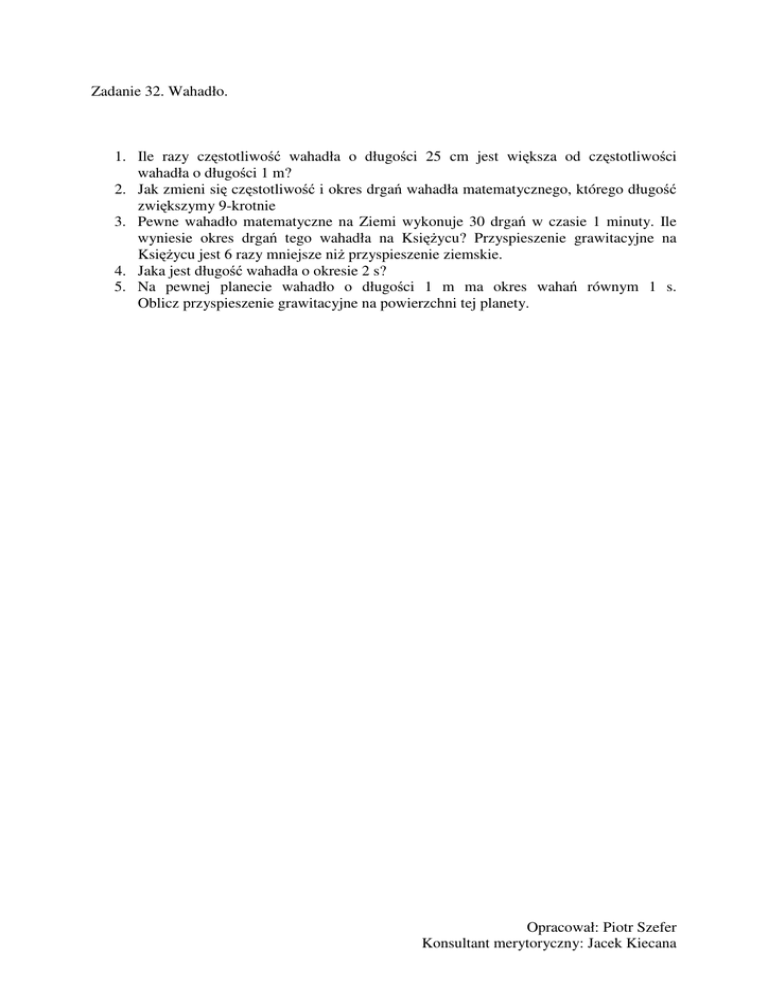 Zadanie 32. Wahadło. 1. Ile razy częstotliwość wahadła o długości 25 cm jest większa od częstotliwości wahadła o długości 1 m? 2. Jak zmieni się częstotliwość i okres drgań wahadła matematycznego, którego długość zwiększymy 9-krotnie 3. Pewne wahadło matematyczne na Ziemi wykonuje 30 drgań w czasie 1 minuty. Ile wyniesie okres drgań tego wahadła na Księżycu? Przyspieszenie grawitacyjne na Księżycu jest 6 razy mniejsze niż przyspieszenie ziemskie. 4. Jaka jest długość wahadła o okresie 2 s? 5. Na pewnej planecie wahadło o długości 1 m ma okres wahań równym 1 s. Oblicz przyspieszenie grawitacyjne na powierzchni tej planety. Opracował: Piotr Szefer Konsultant merytoryczny: Jacek Kiecana