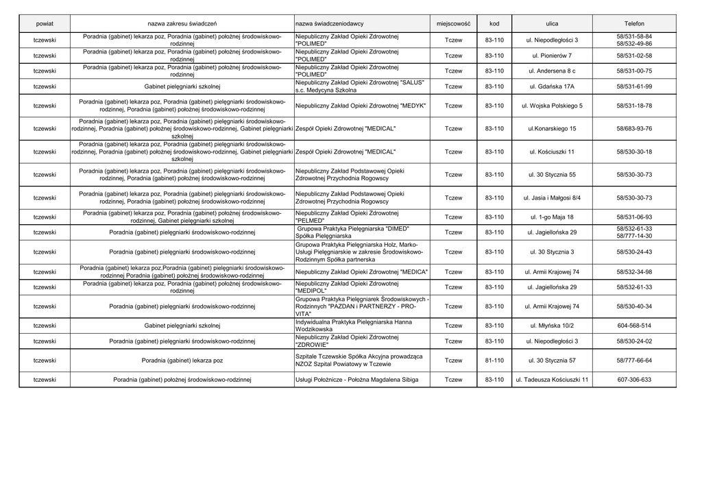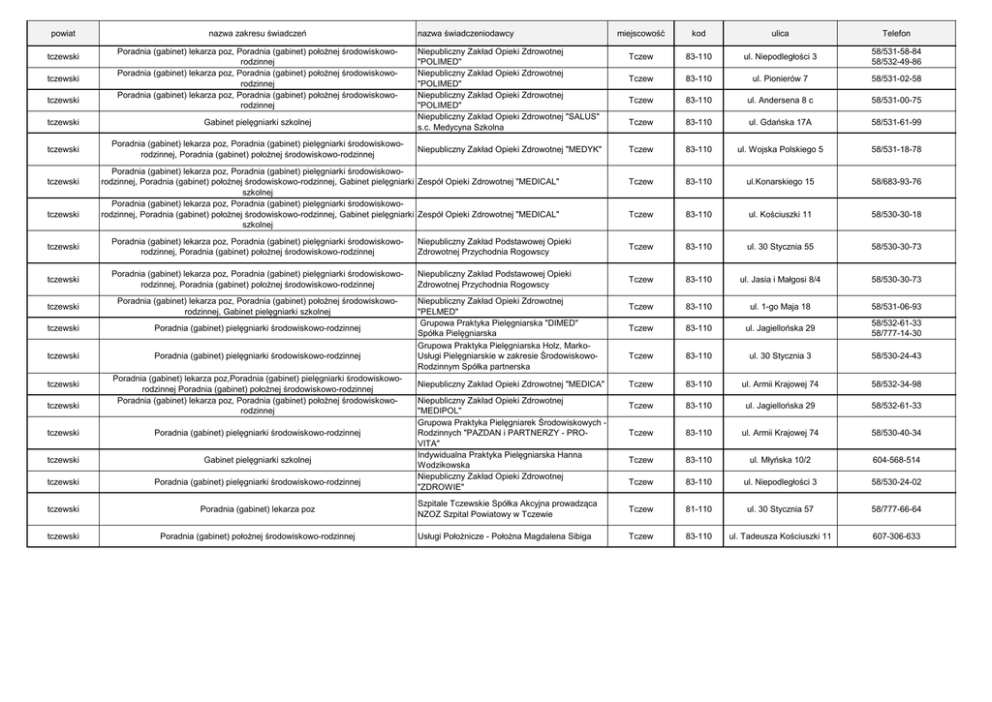 powiat tczewski tczewski tczewski nazwa zakresu świadczeń Poradnia (gabinet) lekarza poz, Poradnia (gabinet) położnej środowiskoworodzinnej Poradnia (gabinet) lekarza poz, Poradnia (gabinet) położnej środowiskoworodzinnej Poradnia (gabinet) lekarza poz, Poradnia (gabinet) położnej środowiskoworodzinnej tczewski Gabinet pielęgniarki szkolnej tczewski Poradnia (gabinet) lekarza poz, Poradnia (gabinet) pielęgniarki środowiskoworodzinnej, Poradnia (gabinet) położnej środowiskowo-rodzinnej tczewski tczewski nazwa świadczeniodawcy Niepubliczny Zakład Opieki Zdrowotnej "POLIMED" Niepubliczny Zakład Opieki Zdrowotnej "POLIMED" Niepubliczny Zakład Opieki Zdrowotnej "POLIMED" Niepubliczny Zakład Opieki Zdrowotnej "SALUS" s.c. Medycyna Szkolna Niepubliczny Zakład Opieki Zdrowotnej "MEDYK" Poradnia (gabinet) lekarza poz, Poradnia (gabinet) pielęgniarki środowiskoworodzinnej, Poradnia (gabinet) położnej środowiskowo-rodzinnej, Gabinet pielęgniarki Zespół Opieki Zdrowotnej "MEDICAL" szkolnej Poradnia (gabinet) lekarza poz, Poradnia (gabinet) pielęgniarki środowiskoworodzinnej, Poradnia (gabinet) położnej środowiskowo-rodzinnej, Gabinet pielęgniarki Zespół Opieki Zdrowotnej "MEDICAL" szkolnej miejscowość kod ulica Telefon Tczew 83-110 ul. Niepodległości 3 58/531-58-84 58/532-49-86 Tczew 83-110 ul. Pionierów 7 58/531-02-58 Tczew 83-110 ul. Andersena 8 c 58/531-00-75 Tczew 83-110 ul. Gdańska 17A 58/531-61-99 Tczew 83-110 ul. Wojska Polskiego 5 58/531-18-78 Tczew 83-110 ul.Konarskiego 15 58/683-93-76 Tczew 83-110 ul. Kościuszki 11 58/530-30-18 tczewski Poradnia (gabinet) lekarza poz, Poradnia (gabinet) pielęgniarki środowiskoworodzinnej, Poradnia (gabinet) położnej środowiskowo-rodzinnej Niepubliczny Zakład Podstawowej Opieki Zdrowotnej Przychodnia Rogowscy Tczew 83-110 ul. 30 Stycznia 55 58/530-30-73 tczewski Poradnia (gabinet) lekarza poz, Poradnia (gabinet) pielęgniarki środowiskoworodzinnej, Poradnia (gabinet) położnej środowiskowo-rodzinnej Niepubliczny Zakład Podstawowej Opieki Zdrowotnej Przychodnia Rogowscy Tczew 83-110 ul. Jasia i Małgosi 8/4 58/530-30-73 tczewski Poradnia (gabinet) lekarza poz, Poradnia (gabinet) położnej środowiskoworodzinnej, Gabinet pielęgniarki szkolnej Tczew 83-110 ul. 1-go Maja 18 58/531-06-93 tczewski Poradnia (gabinet) pielęgniarki środowiskowo-rodzinnej Tczew 83-110 ul. Jagiellońska 29 58/532-61-33 58/777-14-30 tczewski Poradnia (gabinet) pielęgniarki środowiskowo-rodzinnej Tczew 83-110 ul. 30 Stycznia 3 58/530-24-43 Tczew 83-110 ul. Armii Krajowej 74 58/532-34-98 Tczew 83-110 ul. Jagiellońska 29 58/532-61-33 Tczew 83-110 ul. Armii Krajowej 74 58/530-40-34 Tczew 83-110 ul. Młyńska 10/2 604-568-514 Tczew 83-110 ul. Niepodległości 3 58/530-24-02 Szpitale Tczewskie Spółka Akcyjna prowadząca NZOZ Szpital Powiatowy w Tczewie Tczew 81-110 ul. 30 Stycznia 57 58/777-66-64 Usługi Położnicze - Położna Magdalena Sibiga Tczew 83-110 ul. Tadeusza Kościuszki 11 607-306-633 tczewski tczewski Poradnia (gabinet) lekarza poz,Poradnia (gabinet) pielęgniarki środowiskoworodzinnej Poradnia (gabinet) położnej środowiskowo-rodzinnej Poradnia (gabinet) lekarza poz, Poradnia (gabinet) położnej środowiskoworodzinnej tczewski Poradnia (gabinet) pielęgniarki środowiskowo-rodzinnej tczewski Gabinet pielęgniarki szkolnej tczewski Poradnia (gabinet) pielęgniarki środowiskowo-rodzinnej tczewski Poradnia (gabinet) lekarza poz tczewski Poradnia (gabinet) położnej środowiskowo-rodzinnej Niepubliczny Zakład Opieki Zdrowotnej "PELMED" Grupowa Praktyka Pielęgniarska "DIMED" Spółka Pielęgniarska Grupowa Praktyka Pielęgniarska Holz, MarkoUsługi Pielęgniarskie w zakresie ŚrodowiskowoRodzinnym Spółka partnerska Niepubliczny Zakład Opieki Zdrowotnej "MEDICA" Niepubliczny Zakład Opieki Zdrowotnej "MEDIPOL" Grupowa Praktyka Pielęgniarek Środowiskowych Rodzinnych "PAZDAN i PARTNERZY - PROVITA" Indywidualna Praktyka Pielęgniarska Hanna Wodzikowska Niepubliczny Zakład Opieki Zdrowotnej "ZDROWIE"
