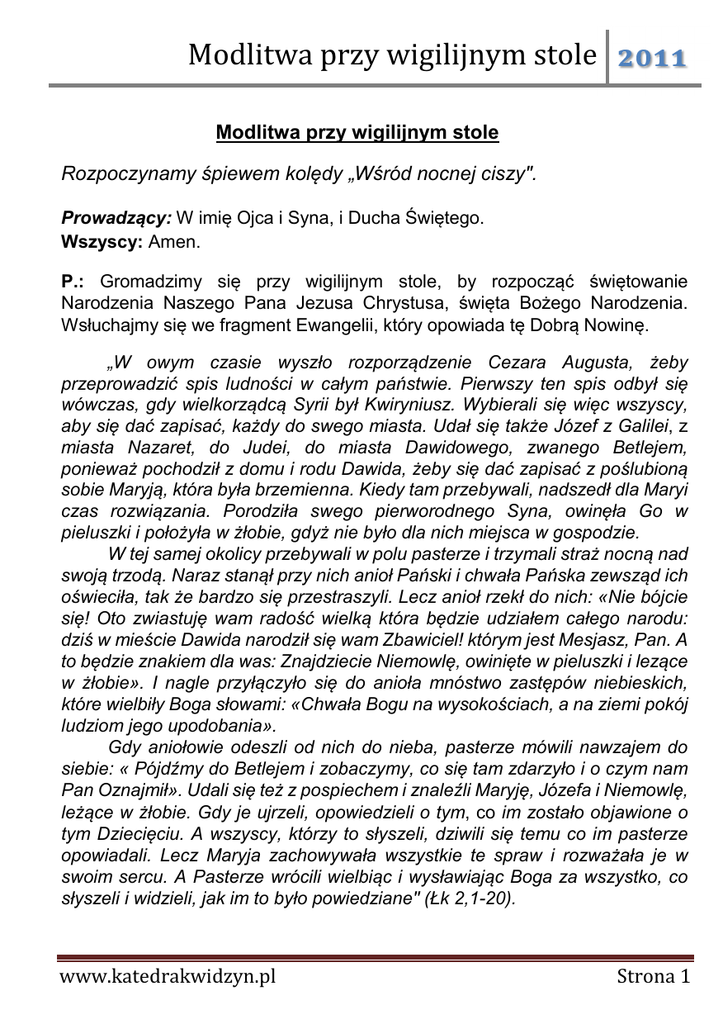 Modlitwa przy wigilijnym stole ͟͟͠͞ Modlitwa przy wigilijnym stole Rozpoczynamy śpiewem kolędy „Wśród nocnej ciszy". Prowadzący: W imię Ojca i Syna, i Ducha Świętego. Wszyscy: Amen. P.: Gromadzimy się przy wigilijnym stole, by rozpocząć świętowanie Narodzenia Naszego Pana Jezusa Chrystusa, święta Bożego Narodzenia. Wsłuchajmy się we fragment Ewangelii, który opowiada tę Dobrą Nowinę. „W owym czasie wyszło rozporządzenie Cezara Augusta, żeby przeprowadzić spis ludności w całym państwie. Pierwszy ten spis odbył się wówczas, gdy wielkorządcą Syrii był Kwiryniusz. Wybierali się więc wszyscy, aby się dać zapisać, każdy do swego miasta. Udał się także Józef z Galilei, z miasta Nazaret, do Judei, do miasta Dawidowego, zwanego Betlejem, ponieważ pochodził z domu i rodu Dawida, żeby się dać zapisać z poślubioną sobie Maryją, która była brzemienna. Kiedy tam przebywali, nadszedł dla Maryi czas rozwiązania. Porodziła swego pierworodnego Syna, owinęła Go w pieluszki i położyła w żłobie, gdyż nie było dla nich miejsca w gospodzie. W tej samej okolicy przebywali w polu pasterze i trzymali straż nocną nad swoją trzodą. Naraz stanął przy nich anioł Pański i chwała Pańska zewsząd ich oświeciła, tak że bardzo się przestraszyli. Lecz anioł rzekł do nich: «Nie bójcie się! Oto zwiastuję wam radość wielką która będzie udziałem całego narodu: dziś w mieście Dawida narodził się wam Zbawiciel! którym jest Mesjasz, Pan. A to będzie znakiem dla was: Znajdziecie Niemowlę, owinięte w pieluszki i lezące w żłobie». I nagle przyłączyło się do anioła mnóstwo zastępów niebieskich, które wielbiły Boga słowami: «Chwała Bogu na wysokościach, a na ziemi pokój ludziom jego upodobania». Gdy aniołowie odeszli od nich do nieba, pasterze mówili nawzajem do siebie: « Pójdźmy do Betlejem i zobaczymy, co się tam zdarzyło i o czym nam Pan Oznajmił». Udali się też z pospiechem i znaleźli Maryję, Józefa i Niemowlę, leżące w żłobie. Gdy je ujrzeli, opowiedzieli o tym, co im zostało objawione o tym Dziecięciu. A wszyscy, którzy to słyszeli, dziwili się temu co im pasterze opowiadali. Lecz Maryja zachowywała wszystkie te spraw i rozważała je w swoim sercu. A Pasterze wrócili wielbiąc i wysławiając Boga za wszystko, co słyszeli i widzieli, jak im to było powiedziane" (Łk 2,1-20). www.katedrakwidzyn.pl Strona 1 Modlitwa przy wigilijnym stole ͟͟͠͞ P.: W ciszy rozważmy Tajemnicę miłości Boga do człowieka. Przez krótką chwilę wszyscy modlą się w milczeniu. Pierwsza gwiazda na niebie ma nam przypomnieć gwiazdę, która doprowadziła mędrców na spotkanie ze Zbawicielem.. Chcemy Go spotkać, zaprosić do naszego życia i dzielić się radością ze wszystkimi. Wspominając tych, których kochamy, i tych, których kochamy jeszcze za mało, módlmy się teraz wspólnie: Wszyscy: Przyjdź do nas, Panie, i pozostań z nami - prośmy za tych, których z nami dziś nie ma, aby Pan Bóg czuwał nad ich drogami; Wszyscy: Przyjdź do nas, Panie, i pozostań z nami - prośmy za wszystkich samotnych i cierpiących, aby ich towarzyszem i pocieszycielem był sam Bóg; Wszyscy: Przyjdź do nas, Panie, i pozostań z nami -prośmy za tych, których nie potrafimy kochać, aby to Jezus dawał im to, czego od nas nie dostają, a nasze serca przemieniał; Wszyscy: Przyjdź do nas, Panie, i pozostań z nami - wypowiedzmy teraz prośby w myślach, które nosimy w sercach...(chwila ciszy) Wszyscy: Przyjdź do nas, Panie, i pozostań z nami - prośmy za naszą rodzinę, abyśmy codziennie żyli miłością i umieli sobie przebaczać; Wszyscy: Przyjdź do nas, Panie, i pozostań z nami. P.: Z ufnością pomódlmy się słowami Pana Jezusa: Ojcze nasz. . Teraz podzielimy się opłatkiem na znak pokoju, jedności i wzajemnej życzliwości. Niech ten biały chleb będzie znakiem przebaczenia i pojednania, a życzenia wypowiadane przy dzieleniu się nim niech płyną z głębi serca. Teraz wszyscy składają sobie życzenia. Później , przed zajęciem miejsc przy stole, można zaśpiewać" Bóg się rodzi". www.katedrakwidzyn.pl Strona 2