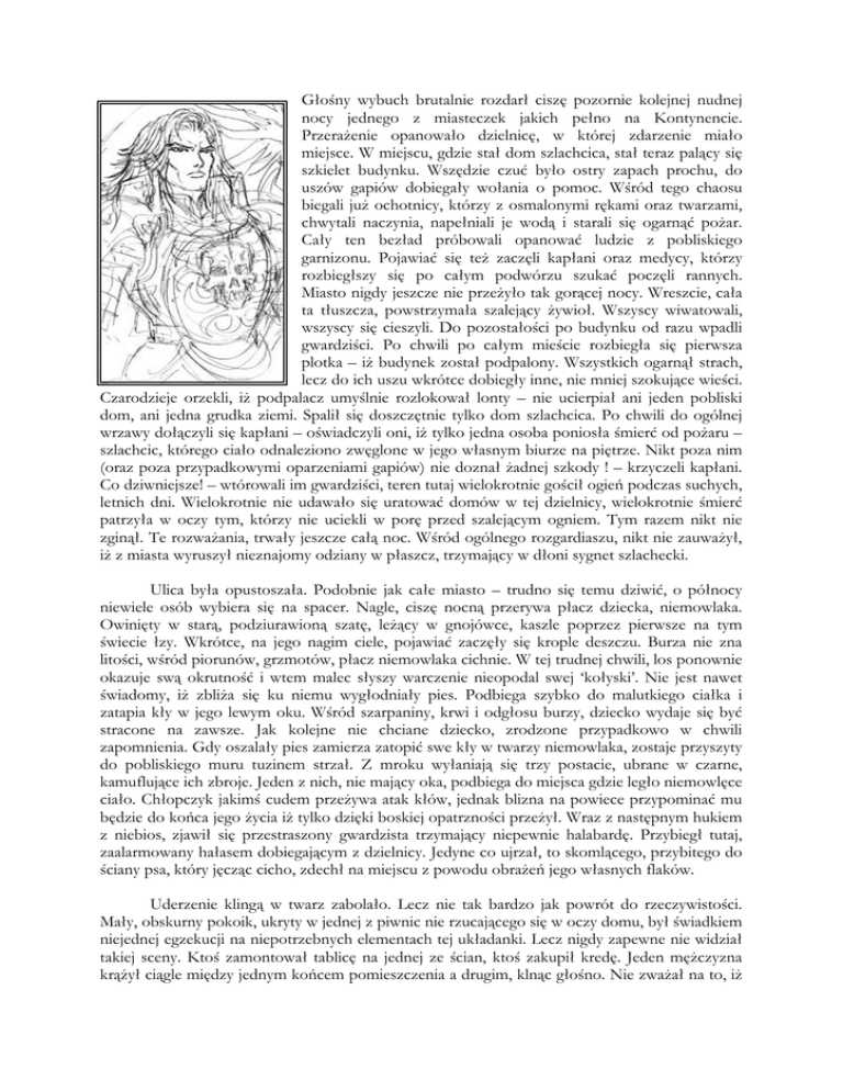 Głośny wybuch brutalnie rozdarł ciszę pozornie kolejnej nudnej nocy jednego z miasteczek jakich pełno na Kontynencie. Przerażenie opanowało dzielnicę, w której zdarzenie miało miejsce. W miejscu, gdzie stał dom szlachcica, stał teraz palący się szkielet budynku. Wszędzie czuć było ostry zapach prochu, do uszów gapiów dobiegały wołania o pomoc. Wśród tego chaosu biegali już ochotnicy, którzy z osmalonymi rękami oraz twarzami, chwytali naczynia, napełniali je wodą i starali się ogarnąć pożar. Cały ten bezład próbowali opanować ludzie z pobliskiego garnizonu. Pojawiać się też zaczęli kapłani oraz medycy, którzy rozbiegłszy się po całym podwórzu szukać poczęli rannych. Miasto nigdy jeszcze nie przeżyło tak gorącej nocy. Wreszcie, cała ta tłuszcza, powstrzymała szalejący żywioł. Wszyscy wiwatowali, wszyscy się cieszyli. Do pozostałości po budynku od razu wpadli gwardziści. Po chwili po całym mieście rozbiegła się pierwsza plotka – iż budynek został podpalony. Wszystkich ogarnął strach, lecz do ich uszu wkrótce dobiegły inne, nie mniej szokujące wieści. Czarodzieje orzekli, iż podpalacz umyślnie rozlokował lonty – nie ucierpiał ani jeden pobliski dom, ani jedna grudka ziemi. Spalił się doszczętnie tylko dom szlachcica. Po chwili do ogólnej wrzawy dołączyli się kapłani – oświadczyli oni, iż tylko jedna osoba poniosła śmierć od pożaru – szlachcic, którego ciało odnaleziono zwęglone w jego własnym biurze na piętrze. Nikt poza nim (oraz poza przypadkowymi oparzeniami gapiów) nie doznał żadnej szkody ! – krzyczeli kapłani. Co dziwniejsze! – wtórowali im gwardziści, teren tutaj wielokrotnie gościł ogień podczas suchych, letnich dni. Wielokrotnie nie udawało się uratować domów w tej dzielnicy, wielokrotnie śmierć patrzyła w oczy tym, którzy nie uciekli w porę przed szalejącym ogniem. Tym razem nikt nie zginął. Te rozważania, trwały jeszcze całą noc. Wśród ogólnego rozgardiaszu, nikt nie zauważył, iż z miasta wyruszył nieznajomy odziany w płaszcz, trzymający w dłoni sygnet szlachecki. Ulica była opustoszała. Podobnie jak całe miasto – trudno się temu dziwić, o północy niewiele osób wybiera się na spacer. Nagle, ciszę nocną przerywa płacz dziecka, niemowlaka. Owinięty w starą, podziurawioną szatę, leżący w gnojówce, kaszle poprzez pierwsze na tym świecie łzy. Wkrótce, na jego nagim ciele, pojawiać zaczęły się krople deszczu. Burza nie zna litości, wśród piorunów, grzmotów, płacz niemowlaka cichnie. W tej trudnej chwili, los ponownie okazuje swą okrutność i wtem malec słyszy warczenie nieopodal swej ‘kołyski’. Nie jest nawet świadomy, iż zbliża się ku niemu wygłodniały pies. Podbiega szybko do malutkiego ciałka i zatapia kły w jego lewym oku. Wśród szarpaniny, krwi i odgłosu burzy, dziecko wydaje się być stracone na zawsze. Jak kolejne nie chciane dziecko, zrodzone przypadkowo w chwili zapomnienia. Gdy oszalały pies zamierza zatopić swe kły w twarzy niemowlaka, zostaje przyszyty do pobliskiego muru tuzinem strzał. Z mroku wyłaniają się trzy postacie, ubrane w czarne, kamuflujące ich zbroje. Jeden z nich, nie mający oka, podbiega do miejsca gdzie legło niemowlęce ciało. Chłopczyk jakimś cudem przeżywa atak kłów, jednak blizna na powiece przypominać mu będzie do końca jego życia iż tylko dzięki boskiej opatrzności przeżył. Wraz z następnym hukiem z niebios, zjawił się przestraszony gwardzista trzymający niepewnie halabardę. Przybiegł tutaj, zaalarmowany hałasem dobiegającym z dzielnicy. Jedyne co ujrzał, to skomlącego, przybitego do ściany psa, który jęcząc cicho, zdechł na miejscu z powodu obrażeń jego własnych flaków. Uderzenie klingą w twarz zabolało. Lecz nie tak bardzo jak powrót do rzeczywistości. Mały, obskurny pokoik, ukryty w jednej z piwnic nie rzucającego się w oczy domu, był świadkiem niejednej egzekucji na niepotrzebnych elementach tej układanki. Lecz nigdy zapewne nie widział takiej sceny. Ktoś zamontował tablicę na jednej ze ścian, ktoś zakupił kredę. Jeden mężczyzna krążył ciągle między jednym końcem pomieszczenia a drugim, klnąc głośno. Nie zważał na to, iż jego partner okłada drewnianą linijką na oko dziesięcioletniego chłopca. Ten, dzielnie znosi ciosy. Wiedział przecież, iż otrzymuje karę za to, iż się pomylił. Wszak ‘opiekunowie’ nie uderzają za nic. Po chwili, sytuacja wraca do normalności. Chodzący mężczyzna znów siada wygodnie na jednym ze krzeseł, przystawionym dość blisko do małego. Drugi zaś znów łapie się za głowę i miast sztyletem, operuje przy tablicy kredą by następnie linijką wskazywać poszczególne litery. Uczeń skrzętnie powtarza za swym nauczycielem, ku uciesze jednookiego partnera w swej ławce. I tak, litery układają się w sylaby, sylaby w wyrazy, te zaś w zdania. Mijał kolejny rok, pełny ciężkiej i trudnej nauki czytania i pisania. Malec zaś, ten sam, który cudem został uratowany przed kłami psa, kończy właśnie swe dwunaste urodziny. Dni mijały szybko. Malec rósł, uczył się wciąż nowych rzeczy. Zaś troskliwi rodzice wpajali w niego całą swą wiedzę na wszelakie tematy związane z ich fachem. Prócz tego wypleniali z umysłu chłopaka błędy, jakie ongiś sami w podobnych sytuacjach popełniali. Wreszcie, w dniu jego czternastych urodzin, szef całej bandy, dał mu do rąk opasłą księgę, poplamioną tłuszczem i mającą swe lata świetności dawno za sobą. Chłopiec otworzył ją i na polecenie swych kamratów, wskazał palcem dwa wyrazy. Pierwszym z nich, był „shak” – co w Starej Mowie oznaczało tyle co „ulica”. Drugim wybranym przez chłopca wyrazem, była „ira”, słowo oznaczające w Starej Mowie „szczęście”. Odtąd, malec przestał być bezimiennym chłopcem – stał się niemal dorosłym mężczyzną,