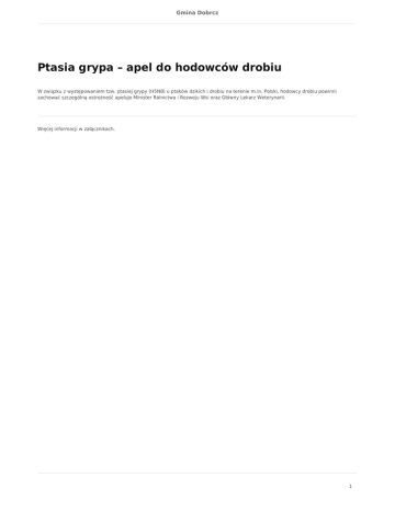 Gmina Dobrcz Ptasia grypa – apel do hodowców drobiu W związku z występowaniem tzw. ptasiej grypy (H5N8) u ptaków dzikich i drobiu na terenie m.in. Polski, hodowcy drobiu powinni zachować szczególną ostrożność apeluje Minister Rolnictwa i Rozwoju Wsi oraz Główny Lekarz Weterynarii. Więcej informacji w załącznikach. 1