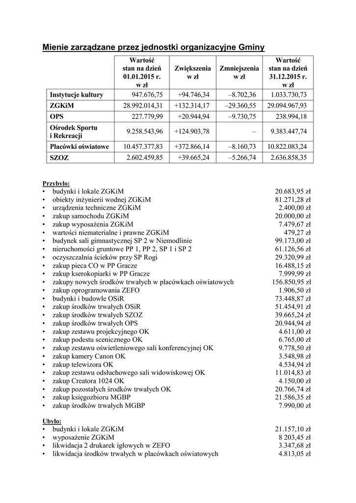Mienie zarządzane przez jednostki organizacyjne Gminy Instytucje kultury Wartość stan na dzień 01.01.2015 r. w zł 947.676,75 ZGKiM OPS Ośrodek Sportu i Rekreacji Placówki oświatowe SZOZ +94.746,34 –8.702,36 Wartość stan na dzień 31.12.2015 r. w zł 1.033.730,73 28.992.014,31 +132.314,17 –29.360,55 29.094.967,93 227.779,99 +20.944,94 –9.730,75 238.994,18 9.258.543,96 +124.903,78 – 9.383.447,74 10.457.377,83 +372.866,14 –8.160,73 10.822.083,24 2.602.459,85 +39.665,24 –5.266,74 2.636.858,35 Zwiększenia w zł Zmniejszenia w zł Przybyło: • • • • • • • • • • • • • • • • • • • • • • • • • • • budynki i lokale ZGKiM obiekty inżynierii wodnej ZGKiM urządzenia techniczne ZGKiM zakup samochodu ZGKiM zakup wyposażenia ZGKiM wartości niematerialne i prawne ZGKiM budynek sali gimnastycznej SP 2 w Niemodlinie nieruchomości gruntowe PP 1, PP 2, SP 1 i SP 2 oczyszczalnia ścieków przy SP Rogi zakup pieca CO w PP Gracze zakup kserokopiarki w PP Gracze zakupy nowych środków trwałych w placówkach oświatowych zakup oprogramowania ZEFO budynki i budowle OSiR zakup środków trwałych OSiR zakup środków trwałych SZOZ zakup środków trwałych OPS zakup zestawu projekcyjnego OK zakup podestu scenicznego OK zakup zestawu oświetleniowego sali konferencyjnej OK zakup kamery Canon OK zakup telewizora OK zakup zestawu odsłuchowego sali widowiskowej OK zakup Creatora 1024 OK zakup pozostałych środków trwałych OK zakup księgozbioru MGBP zakup środków trwałych MGBP 20.683,95 zł 81.271,28 zł 2.400,00 zł 20.000,00 zł 7.479,67 zł 479,27 zł 99.173,00 zł 61.126,56 zł 29.320,99 zł 16.488,15 zł 7.999,99 zł 156.850,95 zł 1.906,50 zł 73.448,87 zł 51.454,91 zł 39.665,24 zł 20.944,94 zł 4.611,00 zł 6.765,00 zł 9.778,50 zł 3.548,98 zł 4.534,94 zł 11.014,83 zł 4.150,00 zł 20.766,74 zł 21.586,35 zł 7.990,00 zł Ubyło: • • • • budynki i lokale ZGKiM wyposażenie ZGKiM likwidacja 2 drukarek igłowych w ZEFO likwidacja środków trwałych w placówkach oświatowych 21.157,10 zł 8 203,45 zł 3.347,68 zł 4.813,05 zł • • • • likwidacja środków trwałych SZOZ likwidacja środków trwałych OPS likwidacja środków trwałych MGBP likwidacja księgozbioru MGBP 5.266,74 zł 9.730,75 zł 2.078,70 zł 6.623,66 zł Dochody: 1. z tytułu wydzierżawiania nieruchomości – 723.980,96 zł, w tym: • gospodarka gruntami i nieruchomościami – 719.509,26 zł, • urzędy gmin (miast i miast na prawach powiatu) – 4.471,70 zł. 2. z tytułu opłat za użytkowanie wieczyste – 180.040,39 zł, 3. z tytułu zbycia prawa własności nieruchomości – 117.738,20 zł, 4. z tytułu przekształcenia prawa użytkowania wieczystego w prawo własności – 68.030,72 zł. Gmina nie posiada akcji oraz udziałów w spółkach.