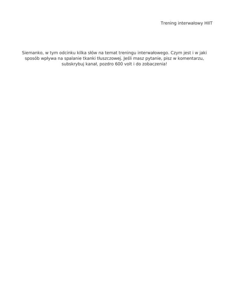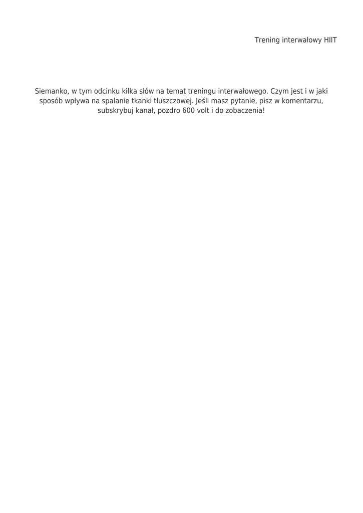 Trening interwałowy HIIT Siemanko, w tym odcinku kilka słów na temat treningu interwałowego. Czym jest i w jaki sposób wpływa na spalanie tkanki tłuszczowej. Jeśli masz pytanie, pisz w komentarzu, subskrybuj kanał, pozdro 600 volt i do zobaczenia!