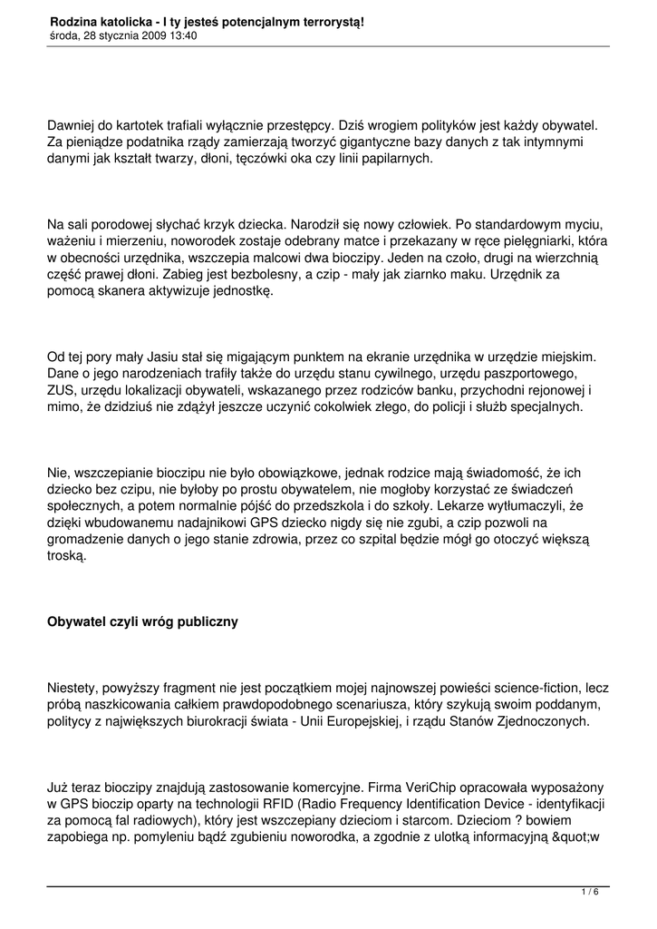 Rodzina katolicka - I ty jesteś potencjalnym terrorystą! środa, 28 stycznia 2009 13:40 Dawniej do kartotek trafiali wyłącznie przestępcy. Dziś wrogiem polityków jest każdy obywatel. Za pieniądze podatnika rządy zamierzają tworzyć gigantyczne bazy danych z tak intymnymi danymi jak kształt twarzy, dłoni, tęczówki oka czy linii papilarnych. Na sali porodowej słychać krzyk dziecka. Narodził się nowy człowiek. Po standardowym myciu, ważeniu i mierzeniu, noworodek zostaje odebrany matce i przekazany w ręce pielęgniarki, która w obecności urzędnika, wszczepia malcowi dwa bioczipy. Jeden na czoło, drugi na wierzchnią część prawej dłoni. Zabieg jest bezbolesny, a czip - mały jak ziarnko maku. Urzędnik za pomocą skanera aktywizuje jednostkę. Od tej pory mały Jasiu stał się migającym punktem na ekranie urzędnika w urzędzie miejskim. Dane o jego narodzeniach trafiły także do urzędu stanu cywilnego, urzędu paszportowego, ZUS, urzędu lokalizacji obywateli, wskazanego przez rodziców banku, przychodni rejonowej i mimo, że dzidziuś nie zdążył jeszcze uczynić cokolwiek złego, do policji i służb specjalnych. Nie, wszczepianie bioczipu nie było obowiązkowe, jednak rodzice mają świadomość, że ich dziecko bez czipu, nie byłoby po prostu obywatelem, nie mogłoby korzystać ze świadczeń społecznych, a potem normalnie pójść do przedszkola i do szkoły. Lekarze wytłumaczyli, że dzięki wbudowanemu nadajnikowi GPS dziecko nigdy się nie zgubi, a czip pozwoli na gromadzenie danych o jego stanie zdrowia, przez co szpital będzie mógł go otoczyć większą troską. Obywatel czyli wróg publiczny Niestety, powyższy fragment nie jest początkiem mojej najnowszej powieści science-fiction, lecz próbą naszkicowania całkiem prawdopodobnego scenariusza, który szykują swoim poddanym, politycy z największych biurokracji świata - Unii Europejskiej, i rządu Stanów Zjednoczonych. Już teraz bioczipy znajdują zastosowanie komercyjne. Firma VeriChip opracowała wyposażony w GPS bioczip oparty na technologii RFID (Radio Frequency Identification Device - identyfikacji za pomocą fal radiowych), który jest wszczepiany dzieciom i starcom. Dzieciom ? bowiem zapobiega np. pomyleniu bądź zgubieniu noworodka, a zgodnie z ulotką informacyjną "w 1/6 Rodzina katolicka - I ty jesteś potencjalnym terrorystą! środa, 28 stycznia 2009 13:40 USA zdarza się ponad 20 tys. takich przypadków rocznie". Sędziwi wiekiem czipują się, aby w razie zasłabnięcia czy utraty przytomności, lekarz za pomocą skanera mógł pobrać z bioczipa, kartę choroby pacjenta, aby zareagować jak najszybciej i skierować delikwenta na odpowiednią terapię. W Europie czipuje się na razie tylko zwierzęta. Bioczipy służą naszym czworonożnym pupilom jako elektroniczne paszporty, ale nie sposób nie dostrzec tutaj prób testowania na zwierzętach systemu tego typu kontroli w praktyce. Po co zwierzętom implanty, przecież poświadczenie odbycia odpowiednich szczepień, poświadczają zwykłe papierowe książeczki zdrowia? Bioczipy lansuje się także jako ostatni krzyk mody. Tak jak w dyskotece Baja Beach Club w Barcelonie, gdzie od kilku lat klientom ze strefy VIP, implantuje się bioczipa w ramieniu. Po uruchomieniu specjalnego konta, czip służy jako karta kredytowa i automatycznie reguluje płatności za drinki. Kelnerzy stają się zbędni, a klient czuje się wyjątkowo i może zabawić się do woli. Trochę techniki i człowiek się gubi Nowe technologie zawdzięczają swoje powodzenie wielkiemu biznesowi. RFID jest z powodzeniem wykorzystywane w handlu hurtowym i wielkopowierzchniowym. Takie marki jak Metro AG, Daimler-Chrystler, Dell Computer czy Wal-Mart, nie wyobrażają sobie zarządzania zapasami bez tagów RFID. Technologia jest doskonalsza od kodu kreskowego, gdyż umożliwia skanowanie bez konieczności zbliżania towaru do czytnika. W ten sposób wszelkie informacje o ruchu produktów, trafiają wprost do odpowiednich programów komputerowych, a zarządzanie zapasami przypomina dobrze ułożone puzzle. Dzięki RFID skrócił się czas dostaw, towary gromadzone są zawsze na czas, spadły koszty magazynowania, a kradzieże czy zwykłe pomyłki należą do rzadkości. Na co liczą więc politycy? Dla polityków RFID, wykorzystywany w tzw. dokumentach biometrycznych: paszportach czy dowodach osobistych, umożliwiają szybszy i łatwiejszy dostęp do danych. Dostęp często wbrew woli zainteresowanych, bo nie możemy mieć gwarancji, że czytnik fal radiowych nie będzie umiejscowiony na ulicy czy w przejeżdżającym radiowozie. W bioczipach można gromadzić wiele danych. Specjaliści przewidują łączenie funkcji identyfikacyjnych, prawa jazdy, paszportu, karty ubezpieczenia społecznego, karty kredytowej, elektronicznego podpisu, elektronicznych kluczy, GPS, czy telefonu komórkowego. 2/6 Rodzina katolicka - I ty jesteś potencjalnym terrorystą! środa, 28 stycznia 2009 13:40 Jeszcze więcej pokus dostarcza mariaż technologii RFID z biometrią, czyli identyfikacji za pomocą indywidualnych cech ludzkiego organizmu: odcisków palców, geometrii dłoni, barwy głosu, struktury tęczówki oka czy układu naczyń krwionośnym. Tego typu formy identyfikacji w krajach rozwijających się znane są głównie z filmów science-fiction, w krajach rozwiniętych stanowią codzienność wielkich korporacji, gdzie dostęp do określonych zasobów jest silnie spersonalizowany. O ile można zrozumieć stosowanie tak zaawansowanych technologii np. na lotniskach ? w San Francisco czy izraelskim Ben Turion podobne zabezpieczenia są stosowane od lat 90. ubiegłego wieku - to pokusa gromadzenia najintymniejszych cech obywateli w gigantycznych bazach danych, wzbudza poważne zaniepokojenie. Jeśli urzędnik będzie miał nasze odciski palców, będzie nas w stanie z nas zlokalizować, będzie wiedział wszystko o naszym stanie zdrowia, preferencjach konsumenckich i