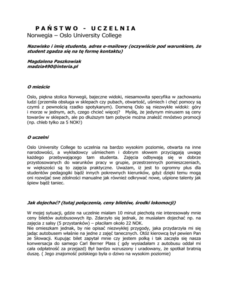 PAŃSTWO - UCZELNIA Norwegia – Oslo University College Nazwisko i imię studenta, adres e-mailowy (oczywiście pod warunkiem, że student zgadza się na tę formę kontaktu) Magdalena Paszkowiak [email protected] O mieście Oslo, piękna stolica Norwegii, bajeczne widoki, niesamowita specyfika w zachowaniu ludzi (przemiła obsługa w sklepach czy pubach, otwartość, uśmiech i chęć pomocy są czymś z pewnością rzadko spotykanym). Domeną Oslo są niezwykłe widoki: góry i morze w jednym, ach, czego chcieć więcej? Myślę, że jedynym minusem są ceny towarów w sklepach, ale po dłuższym tam pobycie można znaleźć mnóstwo promocji (np. chleb tylko za 5 NOK!) O uczelni Oslo University College to uczelnia na bardzo wysokim poziomie, otwarta na inne narodowości, a wykładowcy uśmiechem i dobrym słowem przyciągają uwagę każdego przebywającego tam studenta. Zajęcia odbywają się w dobrze przystosowanych do warunków pracy w grupie, przestrzennych pomieszczeniach, w większości są to zajęcia praktyczne. Uważam, iż jest to ogromny plus dla studentów pedagogiki bądź innych pokrewnych kierunków, gdyż dzięki temu mogą oni rozwijać swe zdolności manualne jak również odkrywać nowe, uśpione talenty jak śpiew bądź taniec. Jak dojechać? (tutaj połączenia, ceny biletów, środki lokomocji) W mojej sytuacji, gdzie na uczelnie miałam 10 minut piechotą nie interesowały mnie ceny biletów autobusowych itp. Zdarzyło się jednak, że musiałam dojechać np. na zajęcia z salsy (5 przystanków) – płaciłam około 22 NOK. Nie omieszkam jednak, by nie opisać niezwykłej przygody, jaka przydarzyła mi się jadąc autobusem właśnie na jedne z zajęć tanecznych. Otóż kierowcą był pewien Pan ze Słowacji. Kupując bilet zapytał mnie czy jestem polką i tak zaczęła się nasza konwersacja do samego Carl Berner Plass ( gdy wysiadałam z autobusu oddał mi cała odpłatność za przejazd) Był bardzo wzruszony i uradowany, że spotkał bratnią duszę. ( Jego znajomość polskiego była o dziwo na wysokim poziomie) Komunikacja miejska czyli Jak jeździć na miejscu? Komunikacja miejska bez zarzutów i jakichkolwiek problemów. Na jeden bilet tj. 44 NOK (ważny 1h) można podróżować zarówno autobusem, tramwajem jak i metrem. Ceny: To jest chyba najbardziej mroczna strona Oslo. Wszystko bardzo drogie, ale jak już wcześniej wspomniałam zdarza się mnóstwo promocji. ( owoce, chleb lub kosmetyki najtańsze nawet za 4 NOK!) Dużo gotowych dań – makaron 5 NOK + sos 7 NOK = 12 zł obiad:) LP. NAZWA PRODUKTU JEDN. CENA 1. Mleko 1L 14NOK 2. Sok w kartonie 1L 19NOK 3. Olej 1L !2NOK 4. Makaron 1 kg Od 5NOK 5. Mąka 1 kg 6. Cukier 1 kg 7. Ser żółty 1 kg 8. Serek biały 9. Masło 10. Margaryna 11. Dżem 12. Ketchup 13. Ziemniaki 14. Ryż 15. Piwo 16. Cebula 1 kg 2NOK 17. Pomidory 1 kg 2NOK 18. Ogórki 1 kg 19. Pomarańcze 1 kg 20. Marchewka 1 kg 21. Chleb zwykły 1 kg 22. Czekolada 23. Lody 24. Jajka 25. Jogurt 26. Szynka 27. Kiełbasa 28. Jabłka 29. Gazeta ogłoszeniowa 30. Długopis 31. Znaczek pocztowy Europa Od 12 NOK 15NOK 16NOK 1 kg 23NOK Od 5 29NOK 6 szt. 12NOK 1 kg 0d 7NOK 1 kg 0d 12 NOK UWAGI Gdzie warto kupować? Market KIWI okazał się najtańszy i chyba najlepszy: to właśnie tam chleb kosztował 5 NOK, a za makaron także tyle. Bardzo popularne w Oslo są Rema i Extra Rema Co wziąć ze sobą? Cieple ciuchy, wygodne buty i mnóstwo jedzenia:) Mieszkanie (gdzie i za ile, do kogo zwrócić się po przyjeździe po klucze, itp., jaki standard) Myślę, że najtaniej będzie w akademiku. Mieszkałam w St.Hanshaugen (prawie w centrum) i płaciłam 2 718 NOK. Pokój jednoosobowy, przestronny z pięknym widokiem, bo jaki może być z 10 piętra;) Opłaty (za prawo pobytu, bankowe, dodatkowe opłaty na uczelni) Nie mam. Uwagi i spostrzeżenia Nie mam.