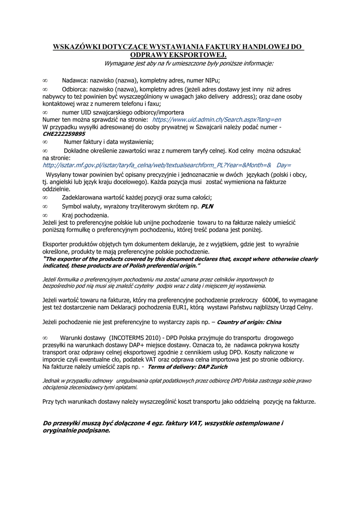 WSKAZÓWKI DOTYCZĄCE WYSTAWIANIA FAKTURY HANDLOWEJ DO ODPRAWY EKSPORTOWEJ. Wymagane jest aby na fv umieszczone były poniższe informacje: • • Nadawca: nazwisko (nazwa), kompletny adres, numer NIPu; Odbiorca: nazwisko (nazwa), kompletny adres (jeżeli adres dostawy jest inny niż adres nabywcy to też powinien być wyszczególniony w uwagach jako delivery address); oraz dane osoby kontaktowej wraz z numerem telefonu i faxu; • numer UID szwajcarskiego odbiorcy/importera Numer ten można sprawdzić na stronie: https://www.uid.admin.ch/Search.aspx?lang=en W przypadku wysyłki adresowanej do osoby prywatnej w Szwajcarii należy podać numer CHE222259895 • Numer faktury i data wystawienia; • Dokładne określenie zawartości wraz z numerem taryfy celnej. Kod celny można odszukać na stronie: http://isztar.mf.gov.pl/isztar/taryfa_celna/web/textualsearchform_PL?Year=&Month=& Day= Wysyłany towar powinien być opisany precyzyjnie i jednoznacznie w dwóch językach (polski i obcy, tj. angielski lub język kraju docelowego). Każda pozycja musi zostać wymieniona na fakturze oddzielnie. • Zadeklarowana wartość każdej pozycji oraz suma całości; • Symbol waluty, wyrażony trzyliterowym skrótem np. PLN • Kraj pochodzenia. Jeżeli jest to preferencyjne polskie lub unijne pochodzenie towaru to na fakturze należy umieścić poniższą formułkę o preferencyjnym pochodzeniu, której treść podana jest poniżej. Eksporter produktów objętych tym dokumentem deklaruje, że z wyjątkiem, gdzie jest to wyraźnie określone, produkty te mają preferencyjne polskie pochodzenie. “The exporter of the products covered by this document declares that, except where otherwise clearly indicated, these products are of Polish preferential origin.” Jeżeli formułka o preferencyjnym pochodzeniu ma zostać uznana przez celników importowych to bezpośrednio pod nią musi się znaleźć czytelny podpis wraz z datą i miejscem jej wystawienia. Jeżeli wartość towaru na fakturze, który ma preferencyjne pochodzenie przekroczy 6000€, to wymagane jest też dostarczenie nam Deklaracji pochodzenia EUR1, którą wystawi Państwu najbliższy Urząd Celny. Jeżeli pochodzenie nie jest preferencyjne to wystarczy zapis np. – Country of origin: China • Warunki dostawy (INCOTERMS 2010) - DPD Polska przyjmuje do transportu drogowego przesyłki na warunkach dostawy DAP+ miejsce dostawy. Oznacza to, że nadawca pokrywa koszty transport oraz odprawy celnej eksportowej zgodnie z cennikiem usług DPD. Koszty naliczone w imporcie czyli ewentualne cło, podatek VAT oraz odprawa celna importowa jest po stronie odbiorcy. Na fakturze należy umieścić zapis np. - Terms of delivery: DAP Zurich Jednak w przypadku odmowy uregulowania opłat podatkowych przez odbiorcę DPD Polska zastrzega sobie prawo obciążenia zleceniodawcy tymi opłatami. Przy tych warunkach dostawy należy wyszczególnić koszt transportu jako oddzielną pozycję na fakturze. Do przesyłki muszą być dołączone 4 egz. faktury VAT, wszystkie ostemplowane i oryginalnie podpisane.