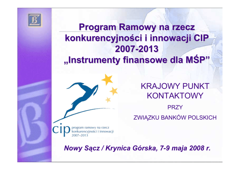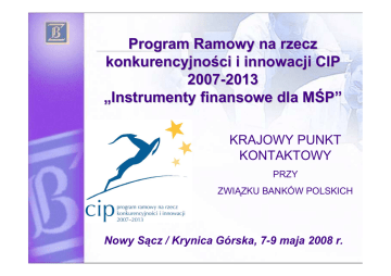 Program Ramowy na rzecz konkurencyjności i innowacji CIP 2007-2013 „Instrumenty finansowe dla MŚP” KRAJOWY PUNKT KONTAKTOWY PRZY ZWIĄZKU BANKÓW POLSKICH Nowy Sącz / Krynica Górska, 7-9 maja 2008 r. CIP - Program Ramowy na rzecz konkurencyjności i innowacji 2007-2013 Ustanowiony decyzją Parlamentu Europejskiego i Rady UE z 2006 r. (1639/2006) Główne cele: •Zwiększenie konkurencyjności przedsiębiorstw, szczególnie MSP •Promowanie wszelkich form innowacji, w tym innowacji ekologicznych •Przyśpieszenie tworzenia społeczeństwa informacyjnego •Promowanie efektywności energetycznej oraz odnawialnych źródeł energii 2 Program składa się z 3 programów szczegółowych: •Program na rzecz przedsiębiorczości (EIP) BudŜet: 2,166 mld EUR, w tym 1,13 mld EUR na komponent „Instrumenty finansowe dla MSP” •Program na rzecz wspierania polityki w zakresie technologii informacyjnych i komunikacyjnych (ICT) BudŜet: 728 mln EUR •Program Inteligentna Energia dla Europy (IEE) BudŜet: 727 mln EUR 3 Podział budŜetu pomiędzy programy szczegółowe 20% Instrumenty 31% finansowe 20% 60% EIP (w tym 1/5 na ekoinnowacje) ICT IEE BudŜet łączny programu CIP to 3,6 mld EUR Program nie zapewnia bezpośredniego finansowania MSP – zawiera jedynie „miękkie” działania 4 wspierające MSP pośrednio. Adresaci CIP: instytucje otoczenia biznesu, uczelnie wyŜsze, samorządy, administracja, organizacje goszczące ośrodki EIC, IRC Instrumenty finansowe dla MSP Beneficjenci bezpośredni: Instytucje finansowe banki, fundusze poŜyczkowe i poręczeniowe, fundusze kapitałowe, anioły biznesu Dostępne instrumenty mają zachęcić te instytucje do zwiększenia finansowania innowacyjnych MSP, na róŜnych etapach ich rozwoju: przy zakładaniu, w fazie startu i ekspansji, na etapie transferu firmy. Beneficjenci pośredni: MSP W rezultacie program ma ułatwić firmom uzyskanie środków na inwestycje związane z wiedzą (innowacje i eko-innowacje, transfer technologii). 5 Instrumenty finansowe dla MSP Instrumenty oferowane instytucjom finansowym to: GIF - instrument na rzecz wysokiego wzrostu i innowacji w MSP; SMEG - system poręczeń dla MSP; CBS - system rozwijania zdolności instytucji pośrednictwa finansowego. 6 GIF - Instrument na rzecz wysokiego wzrostu i innowacji w MSP Obejmuje inwestycje w wyspecjalizowane fundusze podwyŜszonego ryzyka, w tym: •fundusze finansujące wczesne stadium rozwoju firmy (seed capital), •fundusze działające w skali regionu lub skupione na określonych sektorach/ technologiach, •fundusze typu venture capital finansujące działania badawczo-rozwojowe itp. Wsparte fundusze udostępniają następnie kapitał innowacyjnym MSP, umoŜliwiając im rozpoczęcie i rozwój działalności, wprowadzenie produktów i usług na rynek, czy prowadzenie działalności B+R. 7 GIF1 – Fundusze Pośredniczące Wyspecjalizowane fundusze venture-capital: • fundusze finansujące wczesne stadium rozwoju firmy, • fundusze mogące pełnić rolę katalizatora w rozwoju ryków kapitału dla danej technologii lub regionie, • podmioty utworzone celem dokonywania transferu technologii. Fundusze powinny dysponować szerokim wachlarzem inwestorów (pojedynczy inwestor – max. do 50% kapitału Funduszu Pośredniczącego) Beneficjenci końcowi: • innowacyjne MSP, o wysokim potencjale wzrostu, • inwestujące w rozwój technologiczny, innowacje (w tym eko-innowacje), transfer technologii, 8 GIF1 – Fundusze Pośredniczące Okres finansowania – inwestycje kapitałowe 5-12letnie, max. do XI 2026 r. (umowy z EFI do XII 2013 r.) Kwota udziału GIF1 w Funduszu Pośredniczącym – max. 30 mln EUR, co stanowić moŜe: 1.od 10% do 25% wkładów ogółem w Fundusz 2.do 50% w przypadku nowego Funduszu pełniącego funkcję katalizatora Jeśli beneficjenci końcowi wdraŜają eko-innowacje: 1.do 50% wielkości Funduszu przy inwestycjach >50% udziałów w firmach 2.do 25% + dodatkowy uzgodniony udział na kaŜdą inwestycję eko-innowacyjną przy inwestycjach <50% udziałów w firmach 9 GIF1 – współpraca z sieciami Aniołów Biznesu MoŜliwe jest współinwestowanie GIF1 w fundusze współpracujące z jedną lub wieloma sieciami Aniołów Biznesu MoŜliwy jest oddzielny wkład kapitałowy GIF1 do kaŜdej wskazanej przez sieć Aniołów Biznesu inwestycji w firmę - beneficjenta końcowego. (ale udział GIF1 w proponowanej przez sieć Aniołów Biznesu inwestycji musi być <50% kapitału beneficjenta końcowego) 10 GIF2 - Fundusze Pośredniczące Wyspecjalizowane fundusze podwyŜszonego ryzyka •fundusze finansujące firmy o wysokim potencjale wzrostu na etapie ekspansji; • fundusze mogące pełnić rolę katalizatora w rozwoju rynków kapitału dla danej technologii lub regionie, • fundusze prowadzące strategię buy-and-build (zapewnienie długotrwałego wzrostu zatrudnienia i wartości firmy), • fundusze, których polityka inwestycyjna zakłada >50% udział w firmach-beneficjentach końcowych Beneficjenci końcowi: • innowacyjne MSP, o wysokim potencjale wzrostu, • inwestujące w rozwój technologiczny, innowacje (w tym eko-innowacje), transfer technologii 11 • będące na etapie ekspansji. GIF2 – Fundusze Pośredniczące Okres finansowania – inwestycje kapitałowe 5-12letnie, max. do XI 2026 r. (umowy z EFI do XII 2013 r.) Kwota udziału GIF1 w Funduszu Pośredniczącym – max. 30 mln EUR, co stanowić moŜe: 1.od 7,5% do 15% wkładów ogółem w Fundusz 2.do 25% w przypadku nowego Funduszu pełniącego funkcję katalizatora lub Funduszu utworzonego przez początkujący zespół zarządzający Jeśli beneficjenci końcowi wdraŜają eko-innowacje: 1.do 25% wielkości Funduszu przy inwestycjach >50% udziałów w firmach 2.do 15% + dodatkowy uzgodniony udział na kaŜdą inwestycję eko-innowacyjną przy inwestycjach <50% 12 udziałów w firmach SMEG - System poręczeń dla MSP Zapewnia dodatkowe gwarancje (poręczenia, regwarancje) dla dział