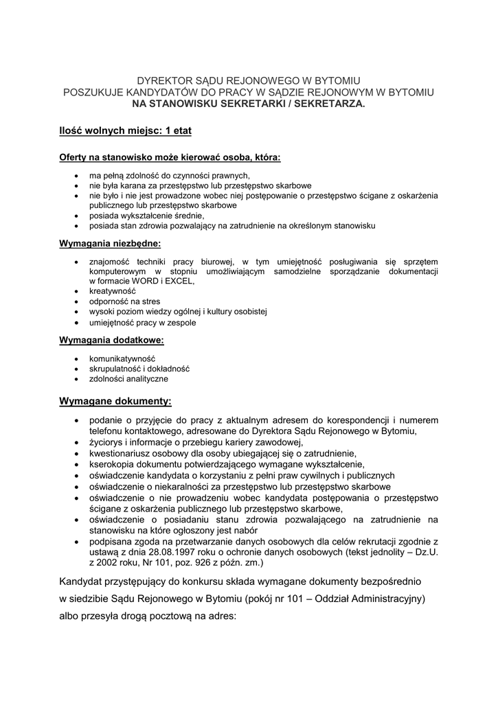 DYREKTOR SĄDU REJONOWEGO W BYTOMIU POSZUKUJE KANDYDATÓW DO PRACY W SĄDZIE REJONOWYM W BYTOMIU NA STANOWISKU SEKRETARKI / SEKRETARZA. Ilość wolnych miejsc: 1 etat Oferty na stanowisko może kierować osoba, która: ma pełną zdolność do czynności prawnych, nie była karana za przestępstwo lub przestępstwo skarbowe nie było i nie jest prowadzone wobec niej postępowanie o przestępstwo ścigane z oskarżenia publicznego lub przestępstwo skarbowe posiada wykształcenie średnie, posiada stan zdrowia pozwalający na zatrudnienie na określonym stanowisku Wymagania niezbędne: znajomość techniki pracy biurowej, w tym umiejętność posługiwania się sprzętem komputerowym w stopniu umożliwiającym samodzielne sporządzanie dokumentacji w formacie WORD i EXCEL, kreatywność odporność na stres wysoki poziom wiedzy ogólnej i kultury osobistej umiejętność pracy w zespole Wymagania dodatkowe: komunikatywność skrupulatność i dokładność zdolności analityczne Wymagane dokumenty: podanie o przyjęcie do pracy z aktualnym adresem do korespondencji i numerem telefonu kontaktowego, adresowane do Dyrektora Sądu Rejonowego w Bytomiu, życiorys i informacje o przebiegu kariery zawodowej, kwestionariusz osobowy dla osoby ubiegającej się o zatrudnienie, kserokopia dokumentu potwierdzającego wymagane wykształcenie, oświadczenie kandydata o korzystaniu z pełni praw cywilnych i publicznych oświadczenie o niekaralności za przestępstwo lub przestępstwo skarbowe oświadczenie o nie prowadzeniu wobec kandydata postępowania o przestępstwo ścigane z oskarżenia publicznego lub przestępstwo skarbowe, oświadczenie o posiadaniu stanu zdrowia pozwalającego na zatrudnienie na stanowisku na które ogłoszony jest nabór podpisana zgoda na przetwarzanie danych osobowych dla celów rekrutacji zgodnie z ustawą z dnia 28.08.1997 roku o ochronie danych osobowych (tekst jednolity – Dz.U. z 2002 roku, Nr 101, poz. 926 z późn. zm.) Kandydat przystępujący do konkursu składa wymagane dokumenty bezpośrednio w siedzibie Sądu Rejonowego w Bytomiu (pokój nr 101 – Oddział Administracyjny) albo przesyła drogą pocztową na adres: Sąd Rejonowy w Bytomiu Oddział Administracyjny Ul. Piekarska 1 41-902 Bytom z zaznaczeniem sygnatury konkursu – Adm 1102-12/13. Dokumenty należy złożyć w terminie do: 17 czerwca 2013 roku W razie przesłania dokumentu drogą pocztową, za datę ich złożenia uważa się datę stempla pocztowego. Oferty przesłane po terminie nie będą rozpatrywane. Kandydaci zakwalifikowani do dalszego etapu zostaną powiadomieni przez ogłoszenie na stronie BIP Sądu Rejonowego w Bytomiu w zakładce OFERTY PRACY oraz na tablicy ogłoszeń przed wejściem do Oddziału Administracyjnego w/m o terminie i miejscu jego przeprowadzenia. PRZEBIEG PROCESU SELEKCJI ETAP I – Selekcja wstępna zgłoszeń kandydatów pod kątem spełnienia wymogów formalnych. Do drugiego etapu konkursu dopuszcza się osoby, które prawidłowo i we wskazanym terminie złożyły wszystkie wymagane oświadczenia i dokumenty. ETAP II – Praktyczne sprawdzenie umiejętności ETAP III – Rozmowa kwalifikacyjna Rozmowa kwalifikacyjna obejmuje sprawdzenie predyspozycji osobistych kandydata i ogólną weryfikację przydatności kandydata do pracy na stanowisku na które został rozpisany konkurs Sąd Rejonowy w Bytomiu informuje, że w miesiącu poprzedzającym datę upublicznienia ogłoszenia wskaźnik zatrudnienia osób niepełnosprawnych w jednostce, w rozumieniu przepisów o rehabilitacji zawodowej i społecznej oraz zatrudnieniu osób niepełnosprawnych, wyniósł poniżej 6%.