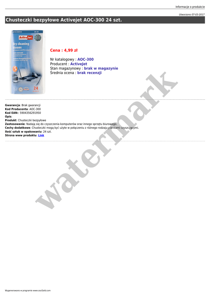 Informacje o produkcie Utworzono 07-03-2017 Chusteczki bezpyłowe Activejet AOC-300 24 szt. Cena : 4,99 zł er m ar k Nr katalogowy : AOC-300 Producent : ActiveJet Stan magazynowy : brak w magazynie Średnia ocena : brak recenzji w at Gwarancja: Brak gwarancji Kod Producenta: AOC-300 Kod EAN:: 5904356291950 Opis: Produkt: Chusteczki bezpyłowe Zastosowanie: Nadają się do czyszczenia komputerów oraz innego sprzętu biurowego. Cechy dodatkowe: Chusteczki mogą być użyte w połączeniu z różnego rodzaju piankami czyszczącymi. Ilość sztuk w opakowaniu: 24 szt. Strona www produktu: Link Wygenerowano w programie www.oscGold.com
