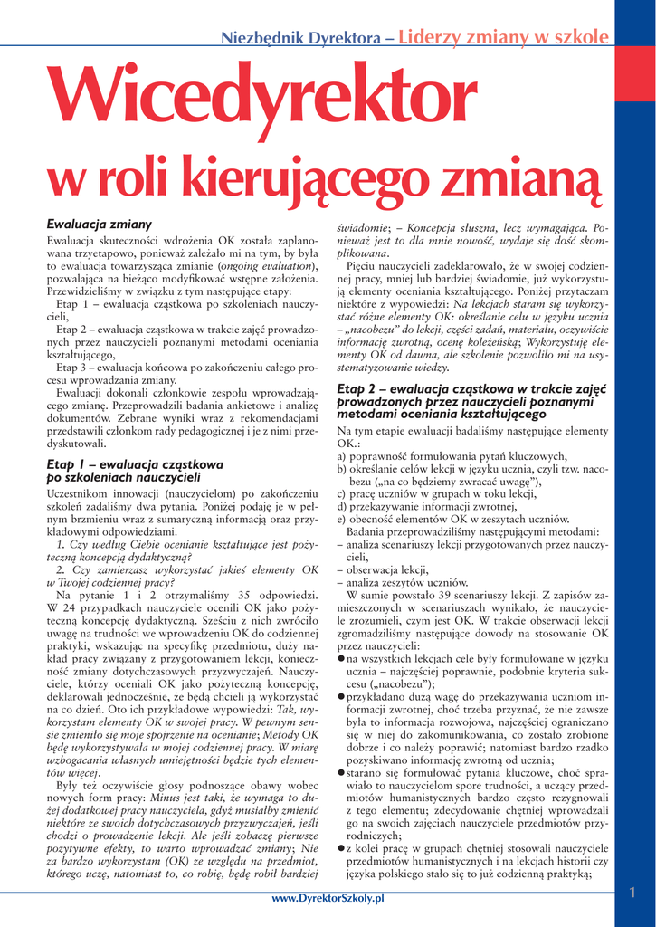Niezbędnik Dyrektora – Liderzy zmiany w szkole Wicedyrektor w roli kierującego zmianą Ewaluacja zmiany Ewaluacja skuteczności wdrożenia OK została zaplanowana trzyetapowo, ponieważ zależało mi na tym, by była to ewaluacja towarzysząca zmianie (ongoing evaluation), pozwalająca na bieżąco modyfikować wstępne założenia. Przewidzieliśmy w związku z tym następujące etapy: Etap 1 – ewaluacja cząstkowa po szkoleniach nauczycieli, Etap 2 – ewaluacja cząstkowa w trakcie zajęć prowadzonych przez nauczycieli poznanymi metodami oceniania kształtującego, Etap 3 – ewaluacja końcowa po zakończeniu całego procesu wprowadzania zmiany. Ewaluacji dokonali członkowie zespołu wprowadzającego zmianę. Przeprowadzili badania ankietowe i analizę dokumentów. Zebrane wyniki wraz z rekomendacjami przedstawili członkom rady pedagogicznej i je z nimi przedyskutowali. Etap 1 – ewaluacja cząstkowa po szkoleniach nauczycieli Uczestnikom innowacji (nauczycielom) po zakończeniu szkoleń zadaliśmy dwa pytania. Poniżej podaję je w pełnym brzmieniu wraz z sumaryczną informacją oraz przykładowymi odpowiedziami. 1. Czy według Ciebie ocenianie kształtujące jest pożyteczną koncepcją dydaktyczną? 2. Czy zamierzasz wykorzystać jakieś elementy OK w Twojej codziennej pracy? Na pytanie 1 i 2 otrzymaliśmy 35 odpowiedzi. W 24 przypadkach nauczyciele ocenili OK jako pożyteczną koncepcję dydaktyczną. Sześciu z nich zwróciło uwagę na trudności we wprowadzeniu OK do codziennej praktyki, wskazując na specyfikę przedmiotu, duży nakład pracy związany z przygotowaniem lekcji, konieczność zmiany dotychczasowych przyzwyczajeń. Nauczyciele, którzy oceniali OK jako pożyteczną koncepcję, deklarowali jednocześnie, że będą chcieli ją wykorzystać na co dzień. Oto ich przykładowe wypowiedzi: Tak, wykorzystam elementy OK w swojej pracy. W pewnym sensie zmieniło się moje spojrzenie na ocenianie; Metody OK będę wykorzystywała w mojej codziennej pracy. W miarę wzbogacania własnych umiejętności będzie tych elementów więcej. Były też oczywiście głosy podnoszące obawy wobec nowych form pracy: Minus jest taki, że wymaga to dużej dodatkowej pracy nauczyciela, gdyż musiałby zmienić niektóre ze swoich dotychczasowych przyzwyczajeń, jeśli chodzi o prowadzenie lekcji. Ale jeśli zobaczę pierwsze pozytywne efekty, to warto wprowadzać zmiany; Nie za bardzo wykorzystam (OK) ze względu na przedmiot, którego uczę, natomiast to, co robię, będę robił bardziej świadomie; – Koncepcja słuszna, lecz wymagająca. Ponieważ jest to dla mnie nowość, wydaje się dość skomplikowana. Pięciu nauczycieli zadeklarowało, że w swojej codziennej pracy, mniej lub bardziej świadomie, już wykorzystują elementy oceniania kształtującego. Poniżej przytaczam niektóre z wypowiedzi: Na lekcjach staram się wykorzystać różne elementy OK: określanie celu w języku ucznia – „nacobezu” do lekcji, części zadań, materiału, oczywiście informację zwrotną, ocenę koleżeńską; Wykorzystuję elementy OK od dawna, ale szkolenie pozwoliło mi na usystematyzowanie wiedzy. Etap 2 – ewaluacja cząstkowa w trakcie zajęć prowadzonych przez nauczycieli poznanymi metodami oceniania kształtującego Na tym etapie ewaluacji badaliśmy następujące elementy OK.: a) poprawność formułowania pytań kluczowych, b) określanie celów lekcji w języku ucznia, czyli tzw. nacobezu („na co będziemy zwracać uwagę”), c) pracę uczniów w grupach w toku lekcji, d) przekazywanie informacji zwrotnej, e) obecność elementów OK w zeszytach uczniów. Badania przeprowadziliśmy następującymi metodami: – analiza scenariuszy lekcji przygotowanych przez nauczycieli, – obserwacja lekcji, – analiza zeszytów uczniów. W sumie powstało 39 scenariuszy lekcji. Z zapisów zamieszczonych w scenariuszach wynikało, że nauczyciele zrozumieli, czym jest OK. W trakcie obserwacji lekcji zgromadziliśmy następujące dowody na stosowanie OK przez nauczycieli: na wszystkich lekcjach cele były formułowane w języku ucznia – najczęściej poprawnie, podobnie kryteria sukcesu („nacobezu”); przykładano dużą wagę do przekazywania uczniom informacji zwrotnej, choć trzeba przyznać, że nie zawsze była to informacja rozwojowa, najczęściej ograniczano się w niej do zakomunikowania, co zostało zrobione dobrze i co należy poprawić; natomiast bardzo rzadko pozyskiwano informację zwrotną od ucznia; starano się formułować pytania kluczowe, choć sprawiało to nauczycielom spore trudności, a uczący przedmiotów humanistycznych bardzo często rezygnowali z tego elementu; zdecydowanie chętniej wprowadzali go na swoich zajęciach nauczyciele przedmiotów przyrodniczych; z kolei pracę w grupach chętniej stosowali nauczyciele przedmiotów humanistycznych i na lekcjach historii czy języka polskiego stało się to już codzienną praktyką; www.DyrektorSzkoly.pl 1 Niezbędnik Dyrektora – Liderzy zmiany w szkole najciekawszą, moim zdaniem, lekcję z wykorzystaniem pracy w grupach przeprowadziła nauczycielka matematyki – uczniowie obliczyli różne stężenia procentowe zalewy do ogórków, ukisili je i po określonym czasie sprawdzili efekt swoich działań – ogórki okazały się bardzo smaczne. Z kolei z analizy zeszytów uczniów wynikało, że najczęściej znajdowały się w nich zapisy o celach lekcji oraz „nacobezu”. Kilku nauczycieli, stosujących już wcześniej z powodzeniem elementy OK, wprowadziło samoocenę i ocenę koleżeńską (historia, język polski). Etap 3 – ewaluacja końcowa Co się według nas udało? Dużą rolę odegrały szkolenia. Nauczyciele w anonimowej ankiecie w większości ocenili OK jako metodę pożyteczną i zadeklarowali jej wykorzystywanie w swojej codziennej praktyce. Plusem były na pewno także koleżeńskie obserwacje lekcji. Uczestniczyliśmy w 10 zajęciach, na których można było ujrzeć niema