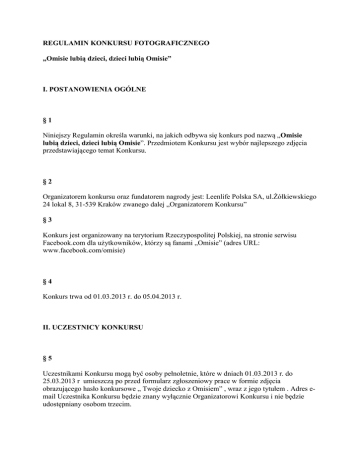 REGULAMIN KONKURSU FOTOGRAFICZNEGO „Omisie lubią dzieci, dzieci lubią Omisie” I. POSTANOWIENIA OGÓLNE §1 Niniejszy Regulamin określa warunki, na jakich odbywa się konkurs pod nazwą „Omisie lubią dzieci, dzieci lubią Omisie”. Przedmiotem Konkursu jest wybór najlepszego zdjęcia przedstawiającego temat Konkursu. §2 Organizatorem konkursu oraz fundatorem nagrody jest: Leenlife Polska SA, ul.Żółkiewskiego 24 lokal 8, 31-539 Kraków zwanego dalej „Organizatorem Konkursu” §3 Konkurs jest organizowany na terytorium Rzeczypospolitej Polskiej, na stronie serwisu Facebook.com dla użytkowników, którzy są fanami „Omisie” (adres URL: www.facebook.com/omisie) §4 Konkurs trwa od 01.03.2013 r. do 05.04.2013 r. II. UCZESTNICY KONKURSU §5 Uczestnikami Konkursu mogą być osoby pełnoletnie, które w dniach 01.03.2013 r. do 25.03.2013 r umieszczą po przed formularz zgłoszeniowy prace w formie zdjęcia obrazującego hasło konkursowe „ Twoje dziecko z Omisiem” , wraz z jego tytułem . Adres email Uczestnika Konkursu będzie znany wyłącznie Organizatorowi Konkursu i nie będzie udostępniany osobom trzecim. §6 Uczestnikami Konkursu nie mogą być pracownicy ani osoby pozostające w stosunku zlecenia lub w innym stosunku prawnym, do którego stosuje się przepisy o zleceniu z Organizatorem Konkursu oraz członkowie rodzin wskazanych osób, do drugiego stopnia pokrewieństwa. §7 Administratorem danych osobowych uczestników Konkursu jest Organizator. Dane osobowe przekazane Organizatorowi przez wyłonionych laureatów Konkursu będą przetwarzane w celu realizacji Konkursu. Dane osobowe mogą być także przetwarzane, gdy jest to niezbędne dla wypełnienia prawnie usprawiedliwionych celów administratora danych. Podanie danych osobowych jest dobrowolne, jednak ich niepodanie uniemożliwi laureatom otrzymanie nagród. III. ZASADY I PRZEBIEG KONKURSU §8 1. Nad prawidłowym przebiegiem Konkursu i przyznaniem nagród czuwają Osoby Odpowiedzialne powołane przez Organizatora (zwane administratorami konkursu) 2. Uczestnicy serwisu Facebook.com - fani profilu „Omisie” będą oddawać swoje głosy na wybrane zdjęcia konkursowe, od 01.03.2010 do 25.03.2014, do godziny 00:00 włącznie, w zakładce "Konkurs" profilu na Facebooku za pomocą narzędzia „Zagłosuj na zdjęcie”. 3. Liczba głosów fanów profilu „Omisie” wyłoni zwycięzców Konkursu. 4. W przypadku uzyskania takiej samej liczby głosów przez finalistów konkurs, przez administratora konkursu zostanie powołana specjalna komisja, której zadaniem będzie wybranie najładniejszego zdjęcia. §9 1. Aby przystąpić do Konkursu należy: • mieć status fana na stronie profilu „Omisie” dostępnego w serwisie Facebook na stronie https://www.facebook.com/omisie • • zapoznać się z Regulaminem Konkursu wysłać zdjęcie poprzez formularz zgłoszeniowy 2. Zgłoszone do Konkursu zdjęcie powinno zawierać tytuł zdjęcia. 3. Celem postawionym przed uczestnikami Konkursu jest zaprezentowanie za pomocą fotografii interesującego motywu, zdjęcia dziecka z „Omisiem” , etc. Sposób ujęcia tematu jest dowolny. 4. Każdy z uczestników Konkursu może wysłać tylko jedno zdjęcie (wraz z opisem) w formacie JPG, w maksymalnym rozmiarze 5 MB. 5. Wysyłając swoje zgłoszenie, Uczestnik oświadcza i potwierdza, że zgłoszone do Konkursu zdjęcie jest jego własnością i zostało wykonane przez niego samego oraz, że przysługują mu autorskie prawa majątkowe i osobiste do tego zdjęcia, w tym prawo do wysyłania go na Konkurs. 6 . Rozstrzygnięcie Konkursu (opublikowanie wyników) nastąpi 05.04.2013 r. około godziny 19:00. 7. Wyniki Konkursu oraz zwycięzcy zostaną opublikowanie w formie notatki na fan page https://www.facebook.com/omisie IV. NAGRODY § 10 W konkursie przewidziano: 3 nagrody: • • • § 11 PIERWSZE MIEJCSE: Tablet Samsung Tab 2 GT P5110 biały oraz zapas Omisi na cały miesiąc 36 szt. DRUGIE MIEJSCE: Aparat cyfrowy Nikon Coolpix S6300 niebieski oraz zapas Omisi na cały miesiąc 36szt. TRZECIE MIEJSCE: Zestaw Omisi na cały miesiąc 36szt. Organizator zastrzega, iż z chwilą wydania Nagród nabywa autorskie prawa majątkowe do prac konkursowych, na następujących wszystkich znanych polach eksploatacji, w tym w szczególności: • prawa do utrwalania i zwielokrotniania na płytach CD i DVD i w pamięci komputera lub innych nośnikach, wprowadzania do obrotu, publicznego wykonania lub publicznego odtwarzania, wyświetlania, najmu, dzierżawy, nadania za pomocą wizji lub fonii przewodowej albo bezprzewodowej przez stację naziemną i nadawania za pośrednictwem satelity, prawa do powielania utworu (wykonania) w całości lub części, odpłatnego lub bezpłatnego rozpowszechniania, wynajmu, wypożyczania oraz udostępniania w inny sposób i archiwizacji powielonych kopii; prawa do publicznej prezentacji Utworu całościowego lub częściowego, prawa do przerabiania i przetwarzania Utworu z zachowaniem osobistych praw autorskich, • • prawa do wykorzystania w mediach interaktywnych, tj. prawa do powielania i rozpowszechniania utworów powstałych na bazie utworu na nośnikach obrazu, dźwięku przeznaczonych wyłącznie lub głównie do użytku interaktywnego, tzn. do indywidualnej obróbki, kształtowania lub innej zmiany produkcji albo jej pojedynczych składników obrazowych, także łączenia z innymi dziełami; prawa do korzystania i rozporządzenia opracowaniami Utworu (prawa zezwalania na wykonywanie zależnego prawa autorskiego); publicznego udostępniania Utworu w taki sposób, aby każdy mógł mieć do niego dostęp w miejscu i w czasie przez siebie wybranym, w tym w sieci Internet. Organizatorowi przysługuje także prawo przeniesienia na osoby trzecie praw, o których mowa powyżej. V. POSTANOWIENIA KOŃCOWE § 12 1. Uczestnik oświadcza, że przysługują mu autorskie prawa osobiste i majątkowe do wszystkich zgłoszonych do Konkursu zdjęć i prawa t