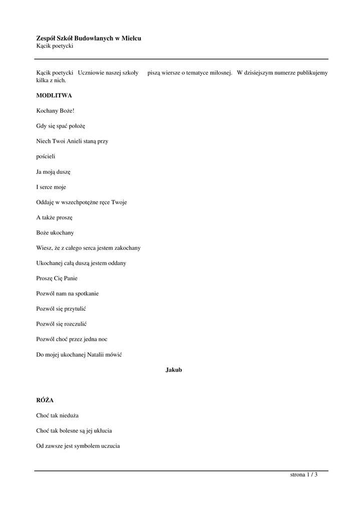 Zespół Szkół Budowlanych w Mielcu Kącik poetycki Kącik poetycki Uczniowie naszej szkoły kilka z nich. piszą wiersze o tematyce miłosnej. W dzisiejszym numerze publikujemy MODLITWA Kochany Boże! Gdy się spać położę Niech Twoi Anieli staną przy pościeli Ja moją duszę I serce moje Oddaję w wszechpotężne ręce Twoje A także proszę Boże ukochany Wiesz, że z całego serca jestem zakochany Ukochanej całą duszą jestem oddany Proszę Cię Panie Pozwól nam na spotkanie Pozwól się przytulić Pozwól się rozczulić Pozwól choć przez jedna noc Do mojej ukochanej Natalii mówić Jakub RÓŻA Choć tak nieduża Choć tak bolesne są jej ukłucia Od zawsze jest symbolem uczucia strona 1 / 3 Zespół Szkół Budowlanych w Mielcu Kącik poetycki Uczucia pięknego Uczucia lirycznego Uczucia przez ludzi upragnionego Dzięki takiej kruszynce Można przeżyć coś pięknego. Jakub Miłość Z Tobą związana jest nadzieja… Z Tobą płakać i cieszyć się… Z Tobą marzyć, Z Tobą śnić… Z Tobą przez resztę życia iść… To los mnie na Twojej drodze postawił! Byś odnalazł mnie! I bym ja mogła odnaleźć Ciebie! Owszem były wzloty i upadki Tak jak nadal przed nami czają się! Mimo to nasze uczucie nie słabnie… Wręcz odwrotnie wzmacnia się…! Stałeś się częścią mnie A nadzieja mówi, że i ja stanę się częścią Ciebie! strona 2 / 3 Zespół Szkół Budowlanych w Mielcu Kącik poetycki Lecz dopiero czas pokaże Czy to co łączy nas… I przed Bogiem Miłości przysięgą się stanie MM strona 3 / 3