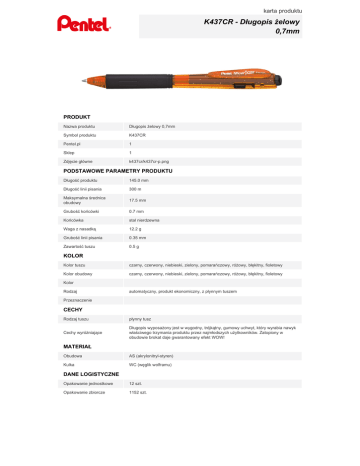 karta produktu K437CR - Długopis żelowy 0,7mm PRODUKT Nazwa produktu Długopis żelowy 0,7mm Symbol produktu K437CR Pentel.pl 1 Sklep 1 Zdjęcie główne k437cr/k437cr-p.png PODSTAWOWE PARAMETRY PRODUKTU Długość produktu 145.0 mm Długość linii pisania 300 m Maksymalna średnica obudowy 17.5 mm Grubość końcówki 0.7 mm Końcówka stal nierdzewna Waga z nasadką 12.2 g Grubość linii pisania 0.35 mm Zawartość tuszu 0.5 g KOLOR Kolor tuszu czarny, czerwony, niebieski, zielony, pomarańczowy, różowy, błękitny, fioletowy Kolor obudowy czarny, czerwony, niebieski, zielony, pomarańczowy, różowy, błękitny, fioletowy Kolor Rodzaj automatyczny, produkt ekonomiczny, z płynnym tuszem Przeznaczenie CECHY Rodzaj tuszu płynny tusz Cechy wyróżniające Długopis wyposażony jest w wygodny, trójkątny, gumowy uchwyt, który wyrabia nawyk właściwego trzymania produktu przez najmłodszych użytkowników. Zatopiony w obudowie brokat daje gwarantowany efekt WOW! MATERIAŁ Obudowa AS (akrylonitryl-styren) Kulka WC (węglik wolframu) DANE LOGISTYCZNE Opakowanie jednostkowe 12 szt. Opakowanie zbiorcze 1152 szt. Kod kreskowy data wygenerowania karty: 07.03.2017 K437CR-A 0072512244326 czarny K437CR-B 0072512244357 czerwony K437CR-C 0072512244388 niebieski K437CR-D 0072512244418 zielony K437CR-F 0072512244449 pomarańczowy K437CR-P 0072512244470 różowy K437CR-S 0072512244500 błękitny K437CR-V 0072512244531 fioletowy
