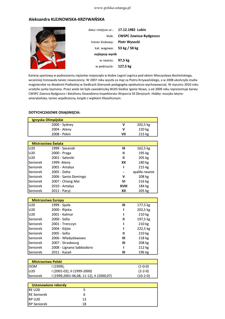 www.polska-sztanga.pl Aleksandra KLEJNOWSKA-KRZYWAŃSKA data i miejsce ur.: klub: trener klubowy: kat. wagowa: 17.12.1982 Lubin CWSPC Zawisza Bydgoszcz Piotr Wysocki 53 kg / 58 kg najlepszy wynik w rwaniu: w podrzucie: 97,5 kg 127,5 kg Karierę sportową w podnoszeniu ciężarów rozpoczęła w klubie Legrol Legnica pod okiem Mieczysława Bocheńskiego, wcześniej trenowała taniec nowoczesny. W 2007 roku wyszła za mąż za Piotra Krzywańskiego, a w 2008 ukończyła studia magisterskie na Akademii Podlaskiej w Siedlcach (kierunek pedagogika opiekuńczo-wychowawcza). W styczniu 2010 roku urodziła synka Szymona. Przez wiele lat była zawodniczką WLKS Siedlce Iganie Nowe, a od 2009 roku reprezentuje barwy CWSPC Zawisza Bydgoszcz i Batalionu Dowodzena Inspektoratu Wsparcia Sił Zbrojnych. Hobby: muzyka latynoamerykańska, taniec współczesny, ksiązki z wątkiem filozoficznym. DOTYCHCZASOWE OSIĄGNIĘCIA: Igrzyska Olimpijskie 2000 - Sydney 2004 - Ateny 2008 - Pekin Mistrzostwa Świata U20 1999 - Savanah U20 2000 - Praga U20 2001 - Saloniki Seniorek 1999- Ateny Seniorek 2001 - Antalya Seniorek 2005 - Doha Seniorek 2006 - Santo Domingo Seniorek 2007 - Chiang Mai Seniorek 2010 - Antalya Seniorek 2011 - Paryż Mistrzostwa Europy U20 1999 - Spała U20 2000 - Rijeka U20 2001 - Kalmar Seniorek 2000 - Sofia Seniorek 2001 - Trenczyn Seniorek 2004 - Kijów Seniorek 2005 - Sofia Seniorek 2006 - Władysławowo Seniorek 2007 - Strasbourg Seniorek 2008 - Lignano Sabbiadoro Seniorek 2011 - Kazań Mistrzostwa Polski OOM I (1999), U20 I (2001-02), II (1999-2000) Seniorek I (1999,2001-06,08, 11-12), II (2000,07) Ustanowione rekordy RE U20 RE Seniorek RP U20 RP Seniorek 5 6 13 18 V V VII 202,5 kg 220 kg 215 kg IX II II XX I V VI XVIII XII 162,5 kg 195 kg 205 kg 180 kg 215 kg spaliła rwanie 208 kg 216 kg 184 kg 205 kg III I I II I I II III III I III 177,5 kg 202,5 kg 210 kg 197,5 kg 210 kg 222,5 kg 210 kg 218 kg 208 kg 212 kg 196 kg (1-0-0) (2-2-0) (10-2-0)