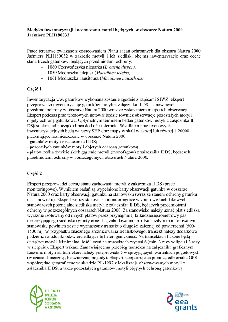 Medyka inwentaryzacji i oceny stanu motyli będących w obszarze Natura 2000 Jaćmierz PLH180032 Prace terenowe związane z opracowaniem Planu zadań ochronnych dla obszaru Natura 2000 Jaćmierz PLH180032 w zakresie motyli i ich siedlisk, obejmą inwentaryzację oraz ocenę stanu trzech gatunków, będących przedmiotami ochrony: 1060 Czerwończyka nieparka (Lycaena dispar), 1059 Modraszka telejusa (Maculinea telejus), 1061 Modraszka nausitousa (Maculinea nausithous) Część 1 Inwentaryzacja ww. gatunków wykonana zostanie zgodnie z zapisami SIWZ: ekspert przeprowadzi inwentaryzację gatunków motyli z załącznika II DS, stanowiących przedmiot ochrony w obszarze Natura 2000 wraz ze wskazaniem miejsc ich obserwacji. Ekspert podczas prac terenowych notował będzie również obserwacje pozostałych motyli objęty ochroną gatunkową. Optymalnym terminem badań gatunków motyli z załącznika II DSjest okres od początku lipca do końca sierpnia. Wynikiem prac terenowych inwentaryzacyjnych będą warstwy SHP oraz mapy w skali większej lub równej 1:20000 prezentujące rozmieszczenie w obszarze Natura 2000: - gatunków motyli z załącznika II DS; - pozostałych gatunków motyli objętych ochroną gatunkową, - płatów roślin żywicielskich gąsienic motyli (monofagów) z załącznika II DS, będących przedmiotami ochrony w poszczególnych obszarach Natura 2000. Część 2 Ekspert przeprowadzi ocenę stanu zachowania motyli z załącznika II DS (prace monitoringowe). Wynikiem badań są wypełnione karty obserwacji gatunku w obszarze Natura 2000 oraz karty obserwacji gatunku na stanowisku (wraz ze stanem ochrony gatunku na stanowisku). Ekspert założy stanowiska monitoringowe w zbiorowiskach łąkowych stanowiących potencjalne siedliska motyli z załącznika II DS, będących przedmiotami ochrony w poszczególnych obszarach Natura 2000. Za stanowisko należy uznać płat siedliska wyraźnie izolowany od innych płatów przez przynajmniej kilkudziesięciometrowy pas niesprzyjającego siedliska (grunty orne, las, zabudowania itp.). Na każdym monitorowanym stanowisku powinien zostać wyznaczony transekt o długości zależnej od powierzchni (5001500 m). W przypadku znacznego zróżnicowania siedliskowego, transekt należy dodatkowo podzielić na odcinki odzwierciedlające tę heterogeniczność. Na transektach liczone będą imagines motyli. Minimalna ilość liczeń na transektach wynosi 6 (min. 3 razy w lipcu i 3 razy w sierpniu). Ekspert wskaże Zamawiającemu przebieg transektu na załączniku graficznym. Liczenia motyli na transekcie należy przeprowadzić w sprzyjających warunkach pogodowych (w czasie słonecznej, bezwietrznej pogody). Ekspert zarejestruje za pomocą odbiornika GPS współrzędne geograficzne w układzie PL-1992 z lokalizacją obserwowanych motyli z załącznika II DS, a także pozostałych gatunków motyli objętych ochroną gatunkową. Ogółem planuje się założyć 2-3 transekty monitoringowe dla każdego z gatunków. Transekty dla poszczególnych gatunków mogą się pokrywać. Minimalna liczba transektów to jeden/gatunek. Jeśli siedlisko gatunku zostanie stwierdzone w obszarze, bez wątpienia jeden transekt trzeba będzie założyć. Jeśli nie zostanie stwierdzone/potwierdzone transekt nie zostanie założony. Każdy przedmiot ochrony zostanie udokumentowany 10 zdjęciami fotograficznymi. Zdjęcia dokumentować będą głównie zajmowane siedliska. Definicję parametrów i wskaźników służących do oceny stanu ww. gatunków przyjmuje się wg opisu zawartego w zał. nr 1,2, 3 (w przypadku czerwończyka nieparka ocena zostanie oparta na metodyce dla przeplatki aurini). Przykładowe karty, które zostaną zawarte w końcowym raporcie, zamieszczono poniżej. Literatura: Pałka K. 2010. Przeplatka aurinia. W: Makomaska-Juchniewicz M. (red.). Monitoring gatunków zwierząt. Przewodnik metodyczny. Część I. GIOŚ, Warszawa, s. 59-72. Sielezniew M. 2012. Modraszek nausitous. W: Makomaska-Juchniewicz M., Baran P. (red.). Monitoring gatunków zwierząt. Przewodnik metodyczny. Część II. GIOŚ, Warszawa, s. 178198. Sielezniew M. 2012. Modraszek telejus. W: Makomaska-Juchniewicz M., Baran P. (red.). Monitoring gatunków zwierząt. Przewodnik metodyczny. Część II. GIOŚ, Warszawa, s. 199218. Przykład wypełnionej karty obserwacji gatunku na stanowisku (taki sam dla obu modraszków). Przykład wypełnionej karty obserwacji gatunku na stanowisku (dla czerwończyka nieparka). Opracował: Dominik Wróbel Jasło, maj 2015 r.
