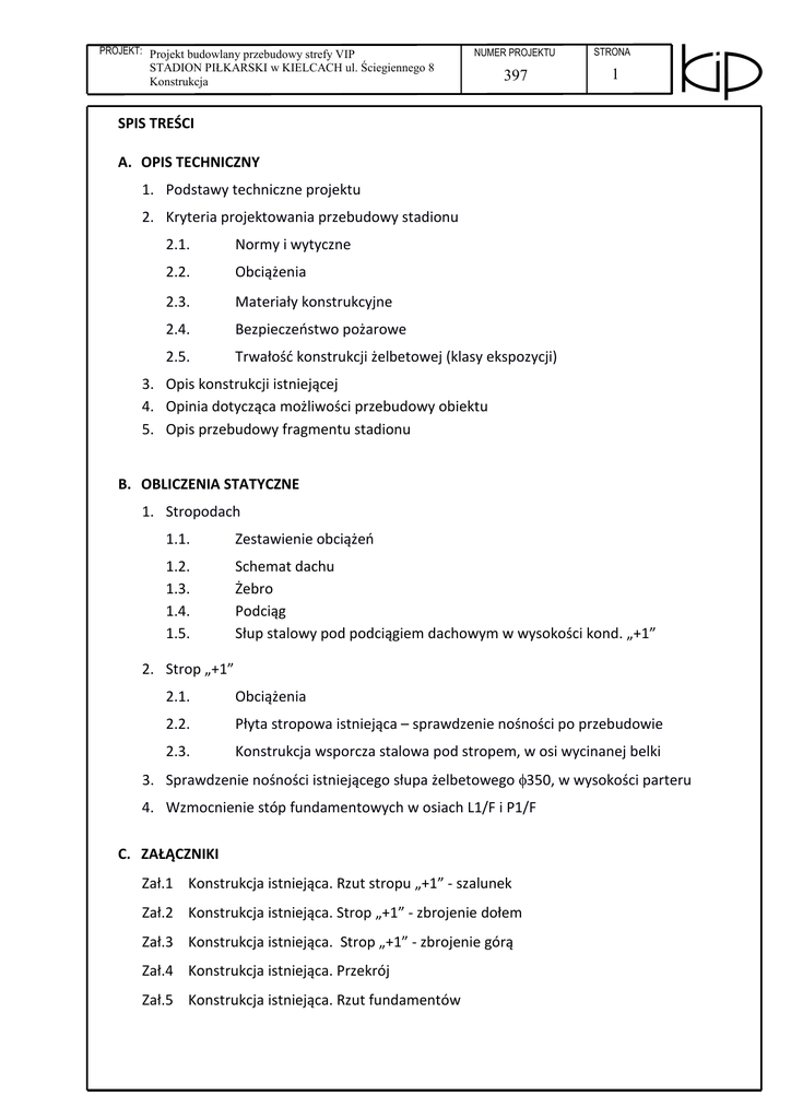 PROJEKT: Projekt budowlany przebudowy strefy VIP NUMER PROJEKTU STADION PIŁKARSKI w KIELCACH ul. Ściegiennego 8 Konstrukcja 397 STRONA 1 -275 SPIS TREŚCI A. OPIS TECHNICZNY 1. Podstawy techniczne projektu 2. Kryteria projektowania przebudowy stadionu 2.1. Normy i wytyczne 2.2. Obciążenia 2.3. Materiały konstrukcyjne 2.4. Bezpieczeństwo pożarowe 2.5. Trwałość konstrukcji żelbetowej (klasy ekspozycji) 3. Opis konstrukcji istniejącej 4. Opinia dotycząca możliwości przebudowy obiektu 5. Opis przebudowy fragmentu stadionu B. OBLICZENIA STATYCZNE 1. Stropodach 1.1. Zestawienie obciążeń 1.2. 1.3. 1.4. 1.5. Schemat dachu Żebro Podciąg Słup stalowy pod podciągiem dachowym w wysokości kond. „+1” 2. Strop „+1” 2.1. Obciążenia 2.2. Płyta stropowa istniejąca – sprawdzenie nośności po przebudowie 2.3. Konstrukcja wsporcza stalowa pod stropem, w osi wycinanej belki 3. Sprawdzenie nośności istniejącego słupa żelbetowego φ350, w wysokości parteru 4. Wzmocnienie stóp fundamentowych w osiach L1/F i P1/F C. ZAŁĄCZNIKI Zał.1 Konstrukcja istniejąca. Rzut stropu „+1” - szalunek Zał.2 Konstrukcja istniejąca. Strop „+1” - zbrojenie dołem Zał.3 Konstrukcja istniejąca. Strop „+1” - zbrojenie górą Zał.4 Konstrukcja istniejąca. Przekrój Zał.5 Konstrukcja istniejąca. Rzut fundamentów PROJEKT: Projekt budowlany przebudowy strefy VIP STRONA NUMER PROJEKTU STADION PIŁKARSKI w KIELCACH ul. Ściegiennego 8 Konstrukcja 2 -275 397 OPIS TECHNICZNY 1. Podstawy techniczne projektu 1.1. Projekt architektoniczny i uzgodnienia projektowe z ATJ Architekci 1.2. Projekt archiwalny stadionu piłkarskiego w Kielcach, opracowany przez ATJ (architektura) i KiP (konstrukcja) 1.3. Oględziny stanu istniejącego. 2. Kryteria projektowania przebudowy stadionu 2.1. Normy i wytyczne • PN-EN 1990 Podstawy projektowania konstrukcji • PN-EN 1991-1-1 Eurokod 1. Oddziaływania na konstrukcje - ciężar objętościowy, ciężar własny, obciążenia użytkowe w budynkach • PN-EN 1991-1-3 Eurokod 1 Oddziaływania na konstrukcje. • Część 1-3: Oddziaływania ogólne – Obciążenie śniegiem • PN-EN 1991-1-4 Eurokod 1. Oddziaływania na konstrukcje. Oddziaływania ogólne. Oddziaływanie wiatru. • PN-EN 1992-1-1 Eurokod 2 Projektowanie konstrukcji z betonu. Reguły ogólne i reguły dla budynków. • PN-EN 1993-1-1 Eurokod 3 Projektowanie konstrukcji stalowych. Reguły ogólne i reguły dla budynków. 2.2. Obciążenia Sala bankietowa, tarasy stadionu Obciążenie charakterystyczne śniegiem gruntu II strefa Obciążenie charakterystyczne ciśnienia wiatru I strefa: 5,0 kN/m2 Sk = 0,9 kN/m2 qk = 0,3 kN/m2 2.3. Materiały konstrukcyjne beton konstrukcyjny – stropy, ściany, słupy beton konstrukcyjny fundamenty (istniejące) stal zbrojeniowa stal konstrukcyjna dobudowy C25/30 C20/25 A IIIN (BSt500) St3SX, St3SY,St3S 2.4. Bezpieczeństwo pożarowe klasa odporności ogniowej konstrukcji B: • • • • • główna konstrukcja nośna (słupy, ściany, belki) stropy dach ściany działowe ściany osłonowe R 120 REI 60 R30 EI 30 EI 60 PROJEKT: Projekt budowlany przebudowy strefy VIP STADION PIŁKARSKI w KIELCACH ul. Ściegiennego 8 Konstrukcja NUMER PROJEKTU 397 STRONA 3 -275 Istniejąca konstrukcja żelbetowa i stalowa stadionu, spełnia wymagania odporności przeciwpożarowej. Zabezpieczenia wymagają nowe konstrukcje, projektowane w ramach rozbudowy strefy VIP. Projektowane belki i słupy stalowe, podpierające strop, zostaną obetonowane dla uzyskania odporności ogniowej 120 min.(minimalna grubość otuliny betonowej 5cm). Konstrukcje stalowa stropodachu nad rozbudowaną strefą zaplecza VIP, zostanie zabezpieczona na 30min odporności ogniowej, zestawem farb pęczniejących 2.5. Trwałość konstrukcji żelbetowej ze względu na korozję (klasy ekspozycji) Ze względu na trwałość konstrukcji, przyjęto klasy ekspozycji konstrukcji żelbetowej: • Konstrukcja nośna we wnętrzu budynku słupy, ściany, stropy XC1 • Tarasy zewnętrzne stadionu XC4 3. Opis konstrukcji istniejącej Stadion piłkarski został okolony trybunami, z czterech stron. Trybuny dwukondygnacyjne, żelbetowe. Konstrukcję nośną stanowią ramy żelbetowe, monolityczne rozmieszczone co 2 -6m. W miejscu wejść na trybuny, ramy zdwojono, okalając schody wejściowe. Na ramach oparto żelbetowe prefabrykowane stopnie trybun. Stropy pod trybunami i na obejściu wokół trybun żelbetowe, monolityczne, oparte na belkach ram, lokalnie (na zewnętrznym obwodzie stadionu) bezpodciągowo, na słupach żelbetowych. Klatki schodowe wewnętrzne żelbetowe, monolityczne, oparte na ścianach żelbetowych. Schody zewnętrzne, prowadzące z poziomu terenu na poziom obwodowego tarasu )”+1”, żelbetowe, monolityczne, oparte na belkach – scianach policzkowych. Konstrukcja zadaszenia trybun została zaprojektowana w formie stalowych dźwigarów kratowych, opartych na dwóch podporach, rozsuniętych na odległość 5,4m. i przewieszonych wspornikowo ok. 17,5m, w stronę płyty stadionu, nad trybunami. Dźwigary w formie przestrzennych kratownic o przekroju trójkątnym: składa się ona z pasa dolnego i dwóch pasów górnych, skratowanych w trzech płaszczyznach. Dźwigary kratowe rozstawione zostały co 7m. Rząd podpór wewnętrznych stanowią słupy stalowe, oparte na żelbetowych ramach trybun co 14m. Stanowią one podparcie dla co drugiego dźwigara. Między słupami rurowymi ukształtowano ciągłą bekę kratową, stanowiącą podarcie dla dźwigarów zlokalizowanych między słupami Drugi, zewnętrzny rząd podpór, stanowią dla każdego dźwigara kratowego stanowią zdwojone stalowe słupy rurowe, połączone z pasami górnymi każdego dźwigara i sprowadzone równolegle, pionowo do fundamentu. Tak rozmieszczone, tworzą wokół zewnętrznych ścian stadionu rytm pionowy, naprzemiennie co 2 i 5m. Na dźwigarach, oparto płatwie dachowe w rozstawie 2,5m Budynek posadowiono bezpoś