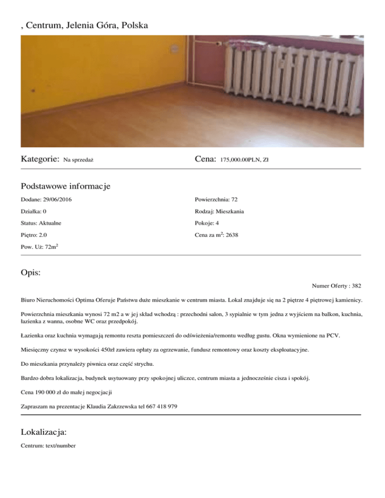 , Centrum, Jelenia Góra, Polska Kategorie: Na sprzedaż Cena: 175,000.00PLN, Zł Podstawowe informacje Dodane: 29/06/2016 Powierzchnia: 72 Działka: 0 Rodzaj: Mieszkania Status: Aktualne Pokoje: 4 Piętro: 2.0 Cena za m²: 2638 Pow. Uż: 72m² Opis: Numer Oferty : 382 Biuro Nieruchomości Optima Oferuje Państwu duże mieszkanie w centrum miasta. Lokal znajduje się na 2 piętrze 4 piętrowej kamienicy. Powierzchnia mieszkania wynosi 72 m2 a w jej skład wchodzą : przechodni salon, 3 sypialnie w tym jedna z wyjściem na balkon, kuchnia, łazienka z wanna, osobne WC oraz przedpokój. Łazienka oraz kuchnia wymagają remontu reszta pomieszczeń do odświeżenia/remontu według gustu. Okna wymienione na PCV. Miesięczny czynsz w wysokości 450zł zawiera opłaty za ogrzewanie, fundusz remontowy oraz koszty eksploatacyjne. Do mieszkania przynależy piwnica oraz część strychu. Bardzo dobra lokalizacja, budynek usytuowany przy spokojnej uliczce, centrum miasta a jednocześnie cisza i spokój. Cena 190 000 zł do małej negocjacji Zapraszam na prezentacje Klaudia Zakrzewska tel 667 418 979 Lokalizacja: Centrum: text/number Szczegóły: Dodatkowe informacje: Piwnica osobne WC ogrzewanie miejskie oddzielna kuchnia Balkon Powered by TCPDF (www.tcpdf.org) Wyposażenie: Okna PCV