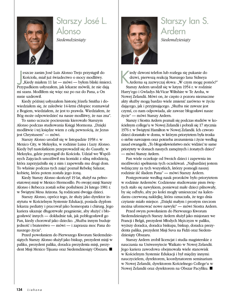 Starszy José L. Alonso Starszy Ian S. Ardern Siedemdziesiąty J eszcze zanim José Luis Alonso Trejo przystąpił do Kościoła, miał już świadectwo o mocy modlitwy. „Kiedy miałem 11 lat — mówi — byłem bliski śmierci. Przypadkiem usłyszałem, jak lekarze mówili, że nie dają mi szans. Modliłem się więc raz po raz do Pana, a On mnie uzdrowił. Kiedy później usłyszałem historię Józefa Smitha i dowiedziałem się, że zaledwie 14-letni chłopiec rozmawiał z Bogiem, wiedziałem, że jest to prawda. Wiedziałem, że Bóg może odpowiedzieć na nasze modlitwy, że nas zna”. To samo uczucie pocieszenia kierowało Starszym Alonso podczas studiowania Księgi Mormona. „Dzięki modlitwie i tej księdze wiem z całą pewnością, że Jezus jest Chrystusem” — mówi. Starszy Alonso urodził się w listopadzie 1958 r. w Mexico City, w Meksyku, w rodzinie Luisa i Luzy Alonso. Kiedy był nastolatkiem przeprowadził się do Cuautly, w Meksyku, gdzie przystąpił do Kościoła. Udział we Wspólnych Zajęciach umożliwił mu kontakt z silną młodzieżą, która zaprzyjaźniła się z nim i zapewniła mu drugi dom. To właśnie podczas tych zajęć poznał Rebekę Salazar, kobietę, która potem została jego żoną. Kiedy Starszy Alonso skończył 19 lat, służył na pełnoetatowej misji w Mexico Hermosillo. Po swojej misji Starszy Alonso i Rebecca zostali sobie poślubieni 24 lutego 1981 r. w Świątyni Mesa Arizona. Są rodzicami dwojga dzieci. Starszy Alonso, oprócz tego, że służy jako dyrektor instytutu w Kościelnym Systemie Edukacji, posiada dyplom lekarza pediatry i pracował jako homeopata i chirurg. Jego kariera ukazuje długotrwałe pragnienie, aby służyć i błogosławić innych — dokładnie tak, jak pobłogosławił go Pan, kiedy chorował jako dziecko. „Służba innym buduje jedność i braterstwo — mówi — i zaprasza moc Pana do naszego życia”. Przed powołaniem do Pierwszego Kworum Siedemdziesiątych Starszy Alonso służył jako biskup, prezydent misji w paliku, prezydent palika, doradca prezydenta misji, prezydent Misji Mexico Tijuana oraz Siedemdziesiąty Obszaru. ◼ 134 Liahona Siedemdziesiąty K iedy dzwoni telefon lub rozlega się pukanie do drzwi, pierwszą reakcją Starszego Iana Sidneya Arderna są zazwyczaj słowa: „W czym mogę pomóc?” Starszy Ardern urodził się w lutym 1954 r. w rodzinie Harry’ego i Gwladys McVicar Wiltshire w Te Aroha, w Nowej Zelandii. Mówi on, że często z pozoru nieznaczne akty służby mogą bardzo wiele zmienić zarówno w życiu dającego, jak i przyjmującego. „Służba nie zawsze jest czymś, co nam odpowiada, ale zawsze błogosławi nasze życie” — mówi Starszy Ardern. Starszy i Siostra Ardern poznali się podczas studiów w kościelnym college’u w Nowej Zelandii i pobrali się 17 stycznia 1976 r. w Świątyni Hamilton w Nowej Zelandii. Ich czworo dzieci dorastało w domu, w którym priorytetem była troska o siebie nawzajem oraz potrzeba zrozumienia i życie według zasad ewangelii. „To błogosławieństwo móc widzieć te same priorytety w domach naszych zamężnych i żonatych dzieci” — mówi Starszy Ardern. Pan wiele oczekuje od Swoich dzieci i zapewnia im możliwości spełnienia tych oczekiwań. „Najbardziej jestem wdzięczny za tych wszystkich, którzy pomogli naszej rodzinie iść śladem Pana” — mówi Starszy Ardern. Postępowanie według nauk proroków było priorytetem w rodzinie Ardernów. Codzienne studiowanie pism świętych stało się nawykiem, ponieważ małe dzieci pilnowały, by się odbyło, aby po kolei mogły umieszczać na kalendarzu czerwoną naklejkę, która oznaczała, że tego dnia czytanie miało miejsce. „Dzięki małym i prostym rzeczom można uformować nowe nawyki” — mówi Siostra Ardern. Przed swym powołaniem do Pierwszego Kworum Siedemdziesiątych Starszy Ardern służył jako misjonarz we Francji i Belgii, prezydent Młodych Mężczyzn w paliku, wyższy doradca, doradca biskupa, biskup, doradca prezydenta palika, prezydent Misji Suva na Fidżi oraz Siedemdziesiąty Obszaru. Starszy Ardern zrobił licencjat i studia magisterskie z nauczania na Uniwersytecie Waikato w Nowej Zelandii. Jego kariera zawodowa obejmowała wiele stanowisk w Kościelnym Systemie Edukacji i był między innymi: nauczycielem, dyrektorem, koordynatorem seminarium w Nowej Zelandii, dyrektorem Kościelnego College’u w Nowej Zelandii oraz dyrektorem na Obszar Pacyfiku. ◼