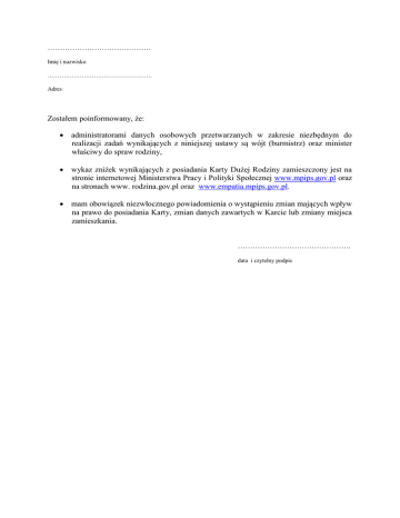 …………………………………… Imię i nazwisko ……………………………………………. Adres Zostałem poinformowany, że: administratorami danych osobowych przetwarzanych w zakresie niezbędnym do realizacji zadań wynikających z niniejszej ustawy są wójt (burmistrz) oraz minister właściwy do spraw rodziny, wykaz zniżek wynikających z posiadania Karty Dużej Rodziny zamieszczony jest na stronie internetowej Ministerstwa Pracy i Polityki Społecznej www.mpips.gov.pl oraz na stronach www. rodzina.gov.pl oraz www.empatia.mpips.gov.pl. mam obowiązek niezwłocznego powiadomienia o wystąpieniu zmian mających wpływ na prawo do posiadania Karty, zmian danych zawartych w Karcie lub zmiany miejsca zamieszkania. ………………………………………. data i czytelny podpis