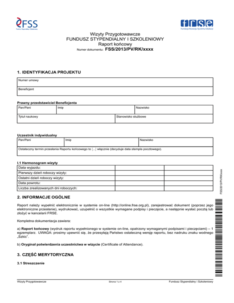 Wizyty Przygotowawcze FUNDUSZ STYPENDIALNY I SZKOLENIOWY Raport końcowy Numer dokumentu: FSS/2013/PV/RK/xxxx 1. IDENTYFIKACJA PROJEKTU Numer umowy Beneficjent Prawny przedstawiciel Beneficjenta Pan/Pani Imie˛ Nazwisko Tytuł naukowy Stanowisko służbowe Uczestnik indywidualny Pan/Pani Imie˛ Nazwisko Ostateczny termin przesłania Raportu końcowego to [...] włacznie ˛ (decyduje data stempla pocztowego). FSS/2013/PV/RK/xxxx I.1 Harmonogram wizyty Data wyjazdu: Pierwszy dzień roboczy wizyty: Ostatni dzień roboczy wizyty: Data powrotu: Liczba zrealizowanych dni roboczych: 2. INFORMACJE OGÓLNE Raport należy wypełnić elektronicznie w systemie on-line (http://online.frse.org.pl), zarejestrować dokument (poprzez jego elektroniczne przesłanie), wydrukować, uzupełnić o wszystkie wymagane podpisy i piecz˛ecie, a nastepnie ˛ wysłać poczta˛ lub złożyć w kancelarii FRSE. Kompletna dokumentacja zawiera: a) Raport końcowy (wydruk raportu wypełnionego w systemie on-line, opatrzony wymaganymi podpisami i piecz˛eciami) – 1 egzemplarz. UWAGA: prosimy upewnić sie, ˛ że przesyłaja˛ Państwo ostateczna˛ wersje˛ raportu, bez nadruku znaku wodnego „Szkic”. b) Oryginał potwierdzenia uczestnictwa w wizycie (Certificate of Attendance). 3. CZE˛ŚĆ MERYTORYCZNA 3.1 Streszczenie Wizyty Przygotowawcze Strona 1 z 4 Fundusz Stypendialny i Szkoleniowy Prosimy o krótkie streszczenie działań podjetych ˛ w ramach zrealizowanej wizyty przygotowawczej w jezyku ˛ polskim: Prosimy o krótkie streszczenie działań podjetych ˛ w ramach zrealizowanej wizyty przygotowawczej w jezyku ˛ angielskim: 3.2 Prosimy o wypełnienie poniższej tabeli porównujac ˛ realizacje˛ poszczególnych działań zaplanowanych we wniosku. Data Zaangażowana Liczba Opis działań merytorycznych osoba z godzin zaplanowanych we wniosku instytucji przyjmujacej ˛ Opis faktycznie zrealizowanych działań (należy uwzglednić ˛ nazwiska uczestników kluczowych) 3.3 Prosimy o określenie w jakim stopniu (%) udało sie˛ zrealizować główny cel/cele wizyty: 20-40% 40-60% 60-80% 80-100% Z czego wynika taka ocena? 3.4 Prosimy opisać krótko- i długoterminowe rezultaty wizyty przygotowawczej: 3.5 Czy osiagni ˛ eto ˛ dodatkowe korzyści/rezultaty, które nie zostały przewidziane we wniosku aplikacyjnym? Tak Nie Jakiego typu były to korzyści/rezultaty? 3.6 Czy wystapiły ˛ zmiany/przeszkody w realizacji zakładanego planu wizyty? Tak Nie 3.7 Czy w trakcie realizacji projektu otrzymali Państwo wystarczajace ˛ wsparcie organizacyjne i merytoryczne od: a) swojej instytucji macierzystej; b) instytucji goszczacej; ˛ c) Operatora FSS? 3.8 Prosimy o opisanie podjetych ˛ działań ewaluacyjnych i upowszechniajacych ˛ oraz o określenie ich skali i zasiegu: ˛ 3.9 Prosimy o opisanie przewidywanego krótko- i długoterminowego wpływu realizacji wizyty na przyszła˛ działalność Beneficjenta, w szczególności na koncepcje˛ współpracy z instytucja˛ partnerska: ˛ 3.10 W jaki sposób podczas wizyty były realizowane aspekty horyzontalne zaplanowane we wniosku Plan Realizacja 4. CZE˛ŚĆ FINANSOWA Wizyty Przygotowawcze Strona 2 z 4 Fundusz Stypendialny i Szkoleniowy FSS/2013/PV/RK/xxxx Prosimy o opisanie zmian oraz podjetych ˛ działań naprawczych: Zestawienie wydatków poniesionych w okresie kwalifikowalności w ramach poszczególnych pozycji budżetowych. Od Do Wszelkie kwoty w Raporcie końcowym powinny być wyrażone w PLN, kurs po którym Beneficjent powinien dokonać przeliczeń walutowych wynosi: 1 Euro = 4,0809 PLN Przyjety ˛ kurs walut dla wydatków 1 [Symbol waluty] = [kurs przeliczeniowy z dokładnościa˛ do minimum czterech miejsc po przecinku] PLN Symbol waluty 0,000000 0,000000 W przypadku wydatków poniesionych w innej walucie niż PLN i EUR do przeliczeń na PLN należy stosować miesieczny ˛ kurs obrachunkowy wymiany ustalony przez Komisje˛ Europejska˛ i opublikowany na jej stronie internetowej z dnia dokonania płatności zaliczkowej przez Operatora na rzecz Beneficjenta: http://ec.europa.eu/budget/contracts_grants/info_contracts/inforeuro/inforeuro_en.cfm 4.1 Koszty utrzymania Liczba zrealizowanych dni roboczych Kwota ryczałtowa za utrzymanie (1 dzień) Suma 0,00 PLN 0,00 PLN 4.2 Koszty podróży i ubezpieczenia Ta cz˛eść dofinansowania rozliczana jest po kosztach rzeczywistych. Na odrebne ˛ wezwanie Operatora Beneficjent powinien przesłaoryginały wymienionych poniżej dokumentów finansowych. Nazwa/numer dokumentu Opis wydatku (przedmiot dokumentu) Kwota Waluta Data dokumentu wystawienia dokumentu 0,00 Data Kwota w zrealizowania przeliczeniu płatności na PLN 0,00 0,00 PLN Ogółem koszty podróży i ubezpieczenia Nazwa/numer dokumentu Opis wydatku (przedmiot dokumentu) Kwota Waluta Data dokumentu wystawienia dokumentu 0,00 Data Kwota w zrealizowania przeliczeniu płatności na PLN 0,00 0,00 PLN Ogółem koszty poniesione z tytułu potrzeb specjalnych 4.4 Ogółem koszty: 0,00 PLN Ogółem koszty Konsultacji w kwestiach finansowych udziela Zespół Rozliczeń Finansowych: Joanna Kaszewska tel. +48 22 46 31 147, e-mail: [email protected] 5. UWAGI I REKOMENDACJE Prosimy przedstawić wszelkie uwagi i rekomendacje majace ˛ na celu usprawnienie przyszłych działań, procedur administracyjnych, sposobu finansowania itd. w odniesieniu do wizyt przygotowawczych: 6. WNIOSEK O NALICZENIE I WYPŁATE˛ PŁATNOŚCI BILANSUJACEJ ˛ ORAZ DEKLARACJA ZGODNOŚCI Przyznane dofinansowanie (zgodnie z umowa) ˛ [w PLN] 0,00 Suma poniesionych wydatków [w PLN] 0,00 Wizyty Przygotowawcze Strona 3 z 4 Fundusz Stypendialny i Szkoleniowy FSS/2013/PV/RK/xxxx 4.3 Koszty specjalnych potrzeb uczestnika indywidualnego Ta cz˛eść dofinansowania rozliczana jest po kosztach rzeczywistych. Na odrebne ˛ wezwanie Operatora Beneficjent powinien przesłać oryginały wymienionych poniżej dokumentów finansowych. Kwota otrzymanej zaliczki (zgodnie z umowa) ˛ [w PLN] 0,00 Płatność końcowa bilansuja