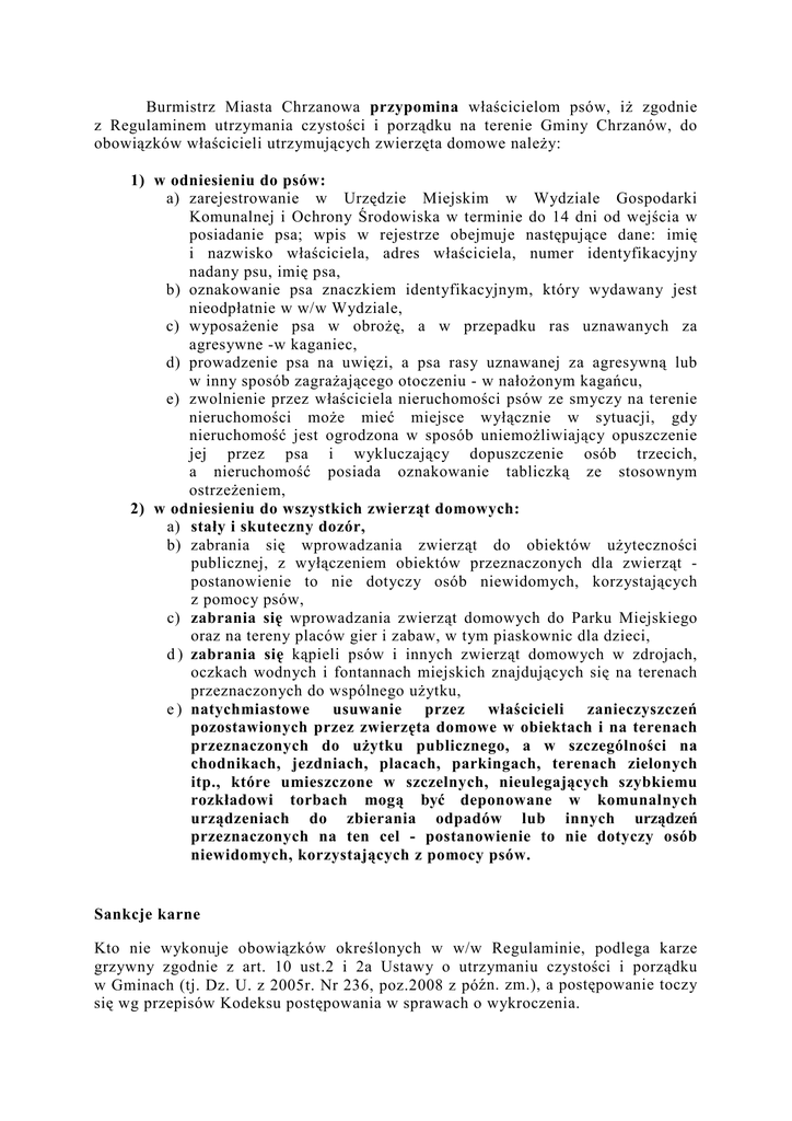 Burmistrz Miasta Chrzanowa przypomina właścicielom psów, iŜ zgodnie z Regulaminem utrzymania czystości i porządku na terenie Gminy Chrzanów, do obowiązków właścicieli utrzymujących zwierzęta domowe naleŜy: 1) w odniesieniu do psów: a) zarejestrowanie w Urzędzie Miejskim w Wydziale Gospodarki Komunalnej i Ochrony Środowiska w terminie do 14 dni od wejścia w posiadanie psa; wpis w rejestrze obejmuje następujące dane: imię i nazwisko właściciela, adres właściciela, numer identyfikacyjny nadany psu, imię psa, b) oznakowanie psa znaczkiem identyfikacyjnym, który wydawany jest nieodpłatnie w w/w Wydziale, c) wyposaŜenie psa w obroŜę, a w przepadku ras uznawanych za agresywne -w kaganiec, d) prowadzenie psa na uwięzi, a psa rasy uznawanej za agresywną lub w inny sposób zagraŜającego otoczeniu - w nałoŜonym kagańcu, e) zwolnienie przez właściciela nieruchomości psów ze smyczy na terenie nieruchomości moŜe mieć miejsce wyłącznie w sytuacji, gdy nieruchomość jest ogrodzona w sposób uniemoŜliwiający opuszczenie jej przez psa i wykluczający dopuszczenie osób trzecich, a nieruchomość posiada oznakowanie tabliczką ze stosownym ostrzeŜeniem, 2) w odniesieniu do wszystkich zwierząt domowych: a) stały i skuteczny dozór, b) zabrania się wprowadzania zwierząt do obiektów uŜyteczności publicznej, z wyłączeniem obiektów przeznaczonych dla zwierząt postanowienie to nie dotyczy osób niewidomych, korzystających z pomocy psów, c) zabrania się wprowadzania zwierząt domowych do Parku Miejskiego oraz na tereny placów gier i zabaw, w tym piaskownic dla dzieci, d ) zabrania się kąpieli psów i innych zwierząt domowych w zdrojach, oczkach wodnych i fontannach miejskich znajdujących się na terenach przeznaczonych do wspólnego uŜytku, e ) natychmiastowe usuwanie przez właścicieli zanieczyszczeń pozostawionych przez zwierzęta domowe w obiektach i na terenach przeznaczonych do uŜytku publicznego, a w szczególności na chodnikach, jezdniach, placach, parkingach, terenach zielonych itp., które umieszczone w szczelnych, nieulegających szybkiemu rozkładowi torbach mogą być deponowane w komunalnych urządzeniach do zbierania odpadów lub innych urządzeń przeznaczonych na ten cel - postanowienie to nie dotyczy osób niewidomych, korzystających z pomocy psów. Sankcje karne Kto nie wykonuje obowiązków określonych w w/w Regulaminie, podlega karze grzywny zgodnie z art. 10 ust.2 i 2a Ustawy o utrzymaniu czystości i porządku w Gminach (tj. Dz. U. z 2005r. Nr 236, poz.2008 z późn. zm.), a postępowanie toczy się wg przepisów Kodeksu postępowania w sprawach o wykroczenia.