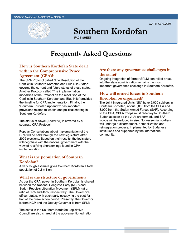 UNITED NATIONS MISSION IN SUDAN DATE 13/11/2008 Southern Kordofan FACT SHEET Frequently Asked Questions How is Southern Kordofan State dealt with in the Comprehensive Peace Agreement (CPA)? Are there any governance challenges in the state? The CPA Protocol called “The Resolution of the Conflict in Southern Kordofan and Blue Nile States” governs the current and future status of these states. Another Protocol called “The implementation modalities of the Protocol on the resolution of the Conflict in Southern Kordofan and Blue Nile” provides the timeline for CPA implementation. Finally, the “Southern Kordofan Appendix” has important provisions related to wealth and political sharing in Southern Kordofan. How will armed forces in Southern Kordofan be organized? The status of Abyei (Sector VI) is covered by a separate CPA Protocol. Popular Consultations about implementation of the CPA will be held through the new legislature after 2009 elections. Based on their results, the legislature will negotiate with the national government with the view of rectifying shortcomings found in CPA implementation. What is the population of Southern Kordofan? A very rough estimate gives Southern Kordofan a total population of 2.2 million. What is the structure of government? As per the CPA, power in Southern Kordofan is shared between the National Congress Party (NCP) and Sudan People's Liberation Movement (SPLM) at a ratio of 55% and 45%, respectively. The Governor’s office rotates, with each party occupying the post for half of the pre-election period. Presently, the Governor is from NCP and the Deputy Governor is from SPLM. The seats in the Southern Kordofan Legislative Council are also shared at the abovementioned ratio. Ongoing integration of former SPLM-controlled areas into the state administration remains the most important governance challenge in Southern Kordofan. The Joint Integrated Units (JIU) have 6,000 soldiers in Southern Kordofan, about 3,000 from the SPLA and 3,000 from the Sudan Armed Forces (SAF). According to the CPA, SPLA troops must redeploy to Southern Sudan as soon as the JIUs are formed, and SAF troops will be reduced in size. Non-essential soldiers will undergo a disarmament, demobilization and reintegration process, implemented by Sudanese institutions and supported by the international community. Southern Kordofan FAQ Page 2 of 2 What are the development goals of Southern Kordofan? Decades of war left Southern Kordofan with serious development challenges. Among its goals are construction and rehabilitation of public infrastructure, particularly as related to water, sanitation, health, and education; support of IDP returns; capacity building; and improvement of public services. How does Southern Kordofan benefit from the oil revenue? According to the CPA, 2 per cent of net revenues from oil produced in any part of Southern Kordofan State shall be equitably shared between the two components (former Western Kordofan, including Abyei and former Southern Kordofan). In addition, the Abyei Protocol stipulates the following entitlements of net revenues from oil produced in Abyei: 50 per cent for the Government of National Unity, 42 per cent for the Government of Southern Sudan, 2 per cent for Bahr al Ghazal State, 2 per cent for local Misseriya, 2 per cent for local Ngok Dinka, 2 per cent for former Western Kordofan (equitably shared between former Western Kordofan and former Southern Kordofan). UNITED NATIONS MISSION IN SUDAN Ebeid Khatim Street P.O.Box 69 Khartoum, 11111 Sudan PHONE: (249) 187-086000 FAX: - Inside Sudan: 0 187 086200 - Outside Sudan: +1 917 3673523 E-MAIL: [email protected] We’re on the Web! See us at: www.unmis.org