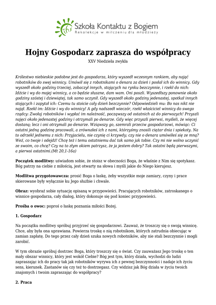 Hojny Gospodarz zaprasza do współpracy XXV Niedziela zwykła Królestwo niebieskie podobne jest do gospodarza, który wyszedł wczesnym rankiem, aby nająć robotników do swej winnicy. Umówił się z robotnikami o denara za dzień i posłał ich do winnicy. Gdy wyszedł około godziny trzeciej, zobaczył innych, stojących na rynku bezczynnie, i rzekł do nich: Idźcie i wy do mojej winnicy, a co będzie słuszne, dam wam. Oni poszli. Wyszedłszy ponownie około godziny szóstej i dziewiątej, tak samo uczynił. Gdy wyszedł około godziny jedenastej, spotkał innych stojących i zapytał ich: Czemu tu stoicie cały dzień bezczynnie? Odpowiedzieli mu: Bo nas nikt nie najął. Rzekł im: Idźcie i wy do winnicy! A gdy nadszedł wieczór, rzekł właściciel winnicy do swego rządcy: Zwołaj robotników i wypłać im należność, począwszy od ostatnich aż do pierwszych! Przyszli najęci około jedenastej godziny i otrzymali po denarze. Gdy więc przyszli pierwsi, myśleli, że więcej dostaną; lecz i oni otrzymali po denarze. Wziąwszy go, szemrali przeciw gospodarzowi, mówiąc: Ci ostatni jedną godzinę pracowali, a zrównałeś ich z nami, którzyśmy znosili ciężar dnia i spiekoty. Na to odrzekł jednemu z nich: Przyjacielu, nie czynię ci krzywdy; czy nie o denara umówiłeś się ze mną? Weź, co twoje i odejdź! Chcę też i temu ostatniemu dać tak samo jak tobie. Czy mi nie wolno uczynić ze swoim, co chcę? Czy na to złym okiem patrzysz, że ja jestem dobry? Tak ostatni będą pierwszymi, a pierwsi ostatnimi.(Mt 20,1-16a) Początek modlitwy: uświadom sobie, że stoisz w obecności Boga, że właśnie z Nim się spotykasz. Bóg patrzy na ciebie z miłością, jest otwarty na słowa i myśli jakie do Niego kierujesz. Modlitwa przygotowawcza: prosić Boga o łaskę, żeby wszystkie moje zamiary, czyny i prace skierowane były wyłącznie ku Jego służbie i chwale. Obraz: wyobraź sobie sytuację opisaną w przypowieści. Pracujących robotników, zatroskanego o winnice gospodarza, cały dialog, który dokonuje się pod koniec przypowieści. Prośba o owoc: poproś o łaskę poznania miłości Bożej. 1. Gospodarz Na początku modlitwy spróbuj przyjrzeć się gospodarzowi. Zauważ, że troszczy się o swoją winnicę. Chce, aby była ona uprawiana. Powierza troskę o nią robotnikom, których zatrudnia obiecując w zamian zapłatę. Do tego przez cały dzień szuka nowych robotników, aby nie stali bezczynnie i mogli zarobić. W tym obrazie spróbuj dostrzec Boga, który troszczy się o świat. Czy zauważasz Jego troskę o ten mały obszar winnicy, który jest wokół Ciebie? Bóg jest tym, który działa, wychodzi do ludzi zapraszając ich do pracy tak jak robotników wyrywa ich z pewnej bezczynności i nadaje ich życiu sens, kierunek. Zastanów się czy też to dostrzegasz. Czy widzisz jak Bóg działa w życiu twoich znajomych i twoim zapraszając do współpracy? 2. Praca Teraz zobacz jak robotnicy po dniu ciężkiej pracy opowiadają o tym, co robili. Wyobraź sobie, że temu wszystkiemu z wielką uwagą i uznaniem przysłuchuje się gospodarz. Odnosząc to do siebie, postaraj się opowiedzieć robotnikom i gospodarzowi, co ty robisz w tej Bożej winnicy. Jak odpowiadasz na Boże zaproszenie w budowaniu Jego królestwa? Nie chodzi tutaj tylko o twoje zaangażowanie przy parafii lub w duszpasterstwie, choć to na pewno też jest bardzo ważne. Ucząc się, studiując, pracując, a także realizując swoje pasje odpowiadasz na Boże powołanie do pracy w winnicy. Zobacz, jak w tym co robisz na co dzień, pomagasz Bogu w Jego trosce o cały świat. Zobacz, jakie są owoce twojej pracy i pokaż je Panu Bogu. Nie staraj się ich porównywać z innymi lub dokładnie zważyć, po prostu uciesz się z nich i zapytaj się, czy Gospodarz zaprasza cię jeszcze do czegoś więcej? 3. Boża sprawiedliwość Przechodząc do tego punktu przyjrzyj się dialogowi, który rozgrywa się pod koniec przypowieści. Zobacz, jak robotnicy oburzają się, że gospodarz daje wszystkim taką samą zapłatę. Spróbuj odnaleźć się w tej sytuacji. Co czujesz? Czy uważasz, że słusznie postąpił? Finał przypowieści pokazuje jak kocha Bóg - wszystkich tak samo niezależnie czy pracują dla Niego długo czy krótko, a nawet czy w ogóle dla Niego pracują. Ta miłość miłosierna jest właśnie Bożą sprawiedliwością i może budzić zdziwienie lub oburzenie dla tych, którzy mają inne pojęcie sprawiedliwości. Wyraża się to właśnie przez fakt, że kocha grzesznika i czeka na niego choćby całe życie, bo chce obdarzyć go zbawieniem. Zastanów się przez chwilę jak przyjmujesz tę Dobrą Nowinę o Bożej miłości. Czy uważasz, że jest sprawiedliwa? Niektórzy będą grzeszyć całe i życie nagle się nawrócą i wszystko będzie dobrze, a ja muszę przestrzegać wszystkich przykazań i dostaniemy tę samą nagrodę. Może potrzebna jest tu pewna zmiana perspektywy, że ja pomimo moich grzechów otrzymam taką nagrodę jak wszyscy wielcy święci. Zobacz uczciwie, która postawa jest ci bliższa i szczerze porozmawiaj o tym z Bogiem. Rozmowa końcowa: Postaraj się zebrać teraz wszystkie ważne doświadczenia z tej modlitwy i jeszcze raz poprosić o głębsze poznanie Bożej miłości.