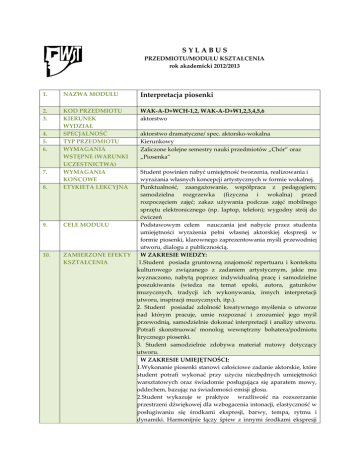 SYLABUS PRZEDMIOTU/MODUŁU KSZTAŁCENIA rok akademicki 2012/2013 1. NAZWA MODUŁU Interpretacja piosenki 2. 3. WAK-A-D+WCH-1,2, WAK-A-D+W1,2,3,4,5,6 aktorstwo 8. KOD PRZEDMIOTU KIERUNEK WYDZIAŁ SPECJALNOŚĆ TYP PRZEDMIOTU WYMAGANIA WSTĘPNE (WARUNKI UCZESTNICTWA) WYMAGANIA KOŃCOWE ETYKIETA LEKCYJNA 9. CELE MODUŁU 10. ZAMIERZONE EFEKTY KSZTAŁCENIA 4. 5. 6. 7. 2. 3. aktorstwo dramatyczne/ spec. aktorsko-wokalna Kierunkowy Zaliczone kolejne semestry nauki przedmiotów „Chór” oraz „Piosenka” Student powinien nabyć umiejętność tworzenia, realizowania i wyrażania własnych koncepcji artystycznych w formie wokalnej. Punktualność, zaangażowanie, współpraca z pedagogiem; samodzielna rozgrzewka (fizyczna i wokalna) przed rozpoczęciem zajęć; zakaz używania podczas zajęć mobilnego sprzętu elektronicznego (np. laptop, telefon); wygodny strój do ćwiczeń Podstawowym celem nauczania jest nabycie przez studenta umiejętności wyrażenia pełni własnej aktorskiej ekspresji w formie piosenki, klarownego zaprezentowania myśli przewodniej utworu, dialogu z publicznością. W ZAKRESIE WIEDZY: 1.Student posiada gruntowną znajomość repertuaru i kontekstu kulturowego związanego z zadaniem artystycznym, jakie mu wyznaczono, nabytą poprzez indywidualną pracę i samodzielne poszukiwania (wiedza na temat epoki, autora, gatunków muzycznych, tradycji ich wykonywania, innych interpretacji utworu, inspiracji muzycznych, itp.). 2. Student posiadać zdolność kreatywnego myślenia o utworze nad którym pracuje, umie rozpoznać i zrozumieć jego myśl przewodnią, samodzielnie dokonać interpretacji i analizy utworu. Potrafi skonstruować monolog wewnętrzny bohatera/podmiotu lirycznego piosenki. 3. Student samodzielnie zdobywa materiał nutowy dotyczący utworu. W ZAKRESIE UMIEJĘTNOŚCI: 1.Wykonanie piosenki stanowi całościowe zadanie aktorskie, które student potrafi wykonać przy użyciu niezbędnych umiejętności warsztatowych oraz świadomie posługująca się aparatem mowy, oddechem, bazując na świadomości emisji głosu. 2.Student wykazuje w praktyce wrażliwość na rozszerzanie przestrzeni dźwiękowej dla wzbogacenia intonacji, elastyczność w posługiwaniu się środkami ekspresji, barwy, tempa, rytmu i dynamiki. Harmonijnie łączy śpiew z innymi środkami ekspresji 11. aktorskiej. Umie współpracować z akompaniatorem, orkiestrą a przede wszystkim partnerem scenicznym i publicznością. 3. Student opanował umiejętność wykonania indywidualnej i zbiorowej formy wokalnej, bazując na znajomości podstaw ich zapisu. 4. Student potrafi samodzielnie pracować z zadanym materiałem, utrwalać linię melodyczną, strukturę rytmiczną, doskonalić zastosowane elementy ruchu scenicznego, choreografii, itp. 5. Student przyswoił sobie formy zachowań i umiejętności związane z występami publicznymi oraz umiejętności posługiwania się aparaturą specjalistyczną (mikrofon, mikroporyt). W ZAKRESIE KOMPETENCJI SPOŁECZNYCH: 1.Student posiada poczucie odpowiedzialności za końcowy efekt artystyczny zarówno w perspektywie indywidualnej, jak i zbiorowej. 2. Student posiada zdolność krytycznej oceny własnych działań artystycznych, łatwość komunikowania się z pozostałymi członkami zespołu (pedagog, partner, muzyk, choreograf, etc.) FORMY KSZTAŁCENIA Ćwiczenia (warsztatowe) - zajęcia grupowe lub indywidualne oparte na ćwiczeniu umiejętności świadomego posługiwania się narzędziami warsztatu aktorskiego 12. PUNKTY ECTS (nakład pracy studenta niezbędny do osiągnięcia zamierzonych efektów kształcenia) rok I METODY I KRYTERIA OCENY III IV V semestr Ilość punktó w Chór Piosenk a 13. II Chór Piosenk a 1 2 3 4 5 6 1 3(W) 2(D) l 4(A) 3(D) 4W) 3(D) 4(W) 3(D) 5(W) 3(D) 5(W) 3(D) EK EK zal zal EK EK EK EK 7 8 9 14. SPOSÓB ZALICZENIA Semestralnie: forma prezentacji praktycznej: przedstawienie projektu/utworu/wykonania artystycznego 15. 16. JĘZYK WYKŁADOWY PROWADZĄCY polski (stopień/tytuł naukowy) 17. LITERATURA 18. UWAGI 10 prof. A. Zubek, prof. B. Fudalej, st. wykł. M. Grąbka, wykł. E. Kaim, E. Kornecka, st. wykł. A. Radwan, ad. R. Dziwisz, mgr H. Król, mgr B. Rybotycka. podstawowa i uzupełniająca – podstawowe publikacje książkowe i audio z zakresu tematyki zajęć, szczegółowo opisane w „Karcie przedmiotu” Współpraca akompaniatora oraz pedagogów z zakresu wymowy i emisji głosu Instrument muzyczny lub zespół instrumentów, na wyższych latach – mikrofon bądź mikroport; Sala wyposażona w sprzęt oświetleniowy, posiadająca dobre parametry akustyczne, niezbędna aparatura specjalistyczna,